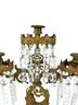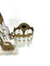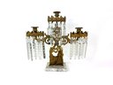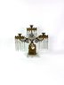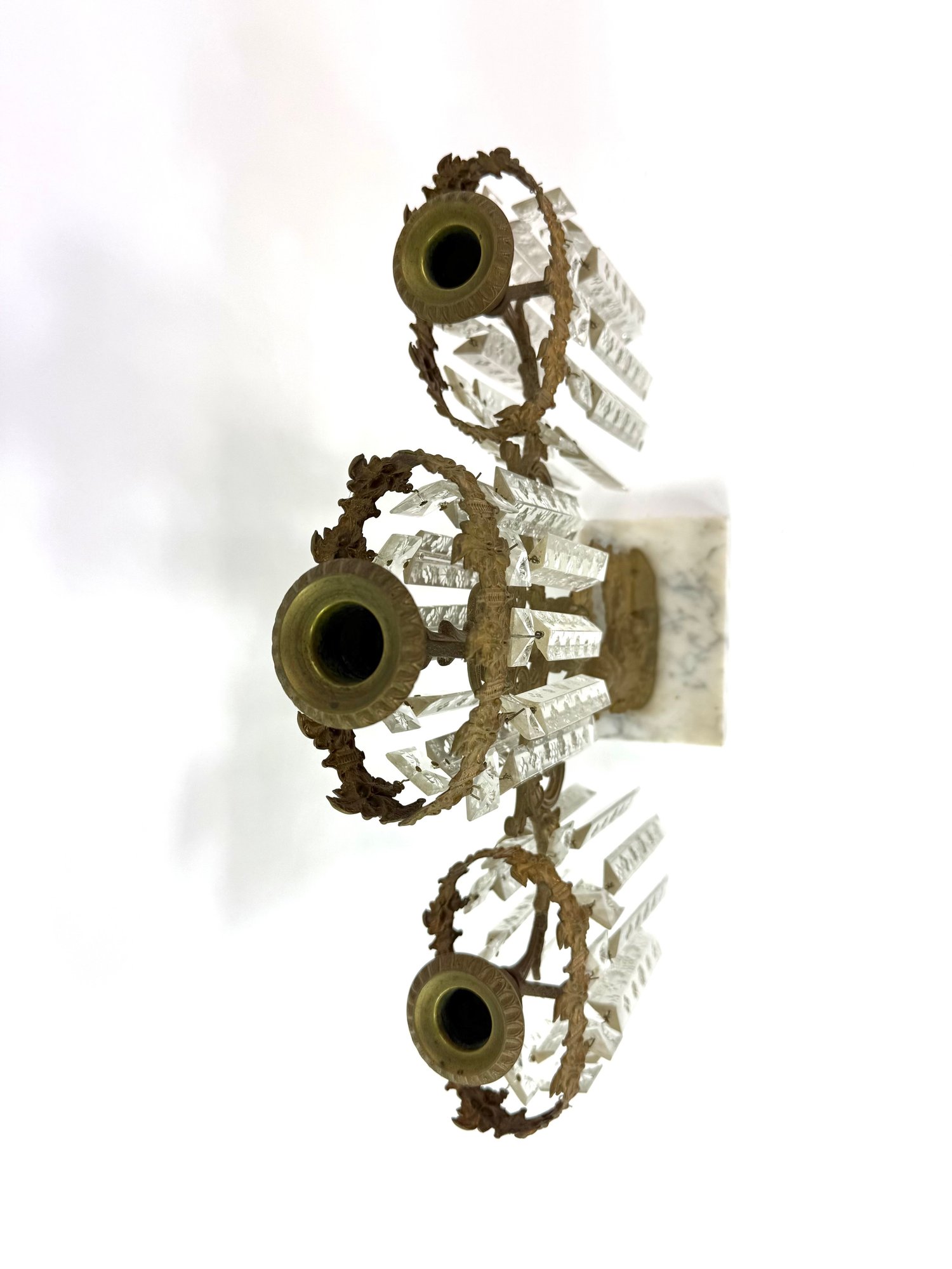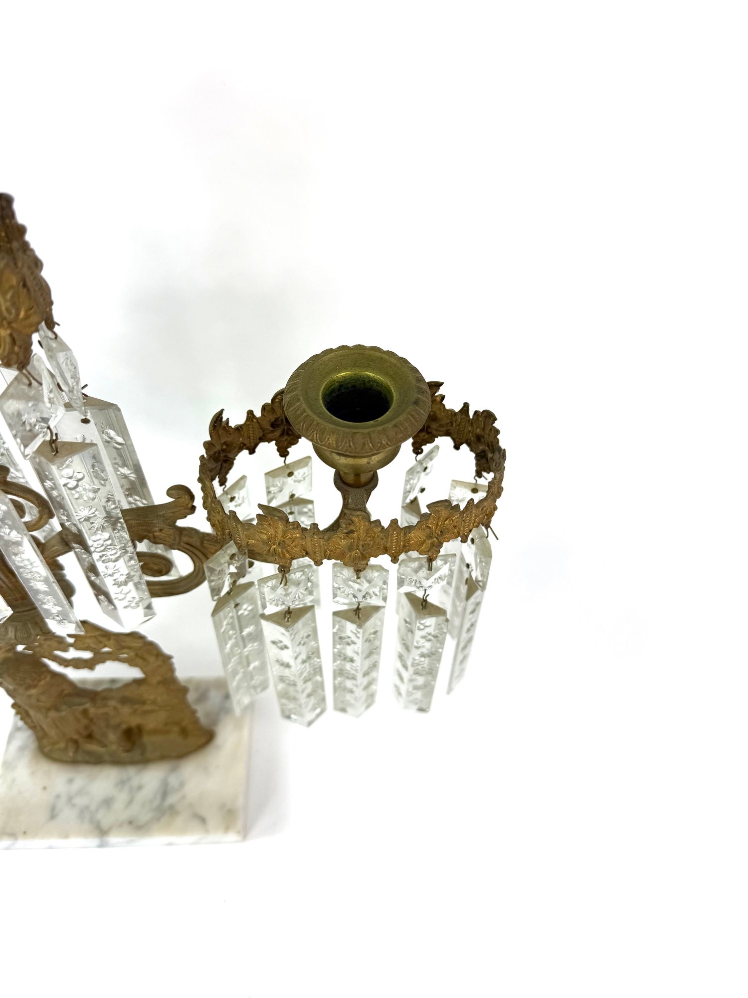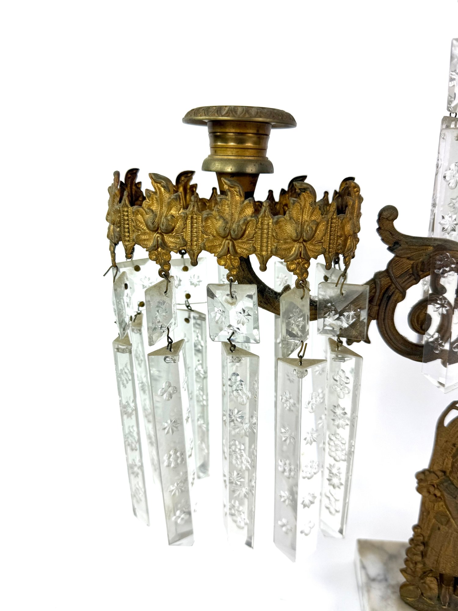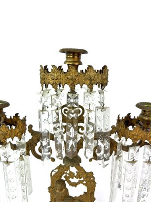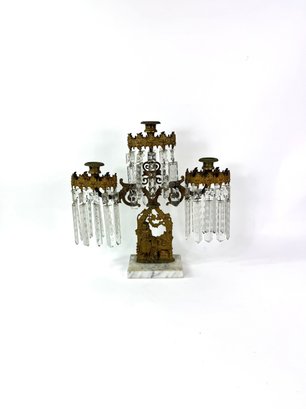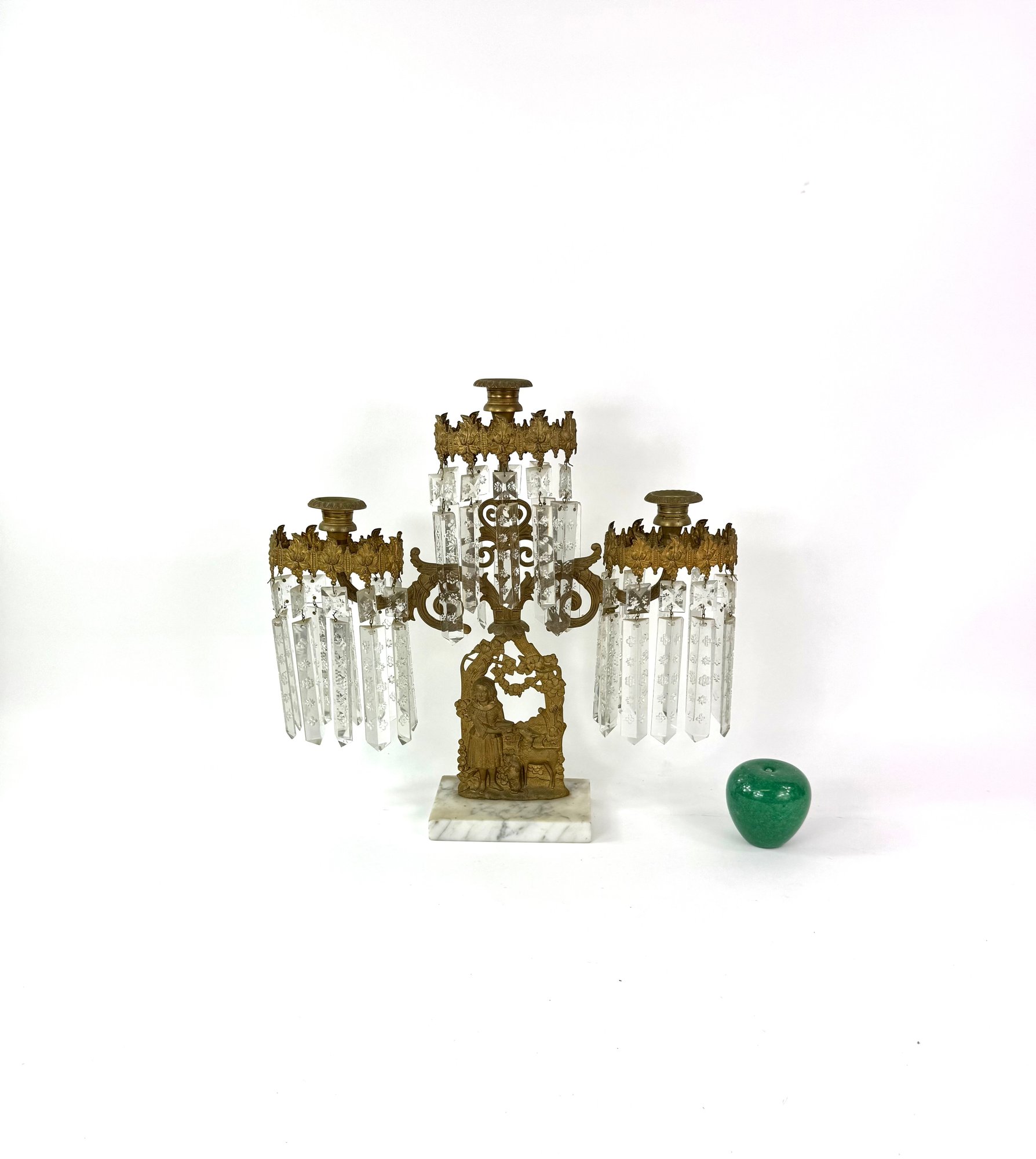 Three brass candle holders with intricate surrounding patterns. The base depicts a woman and two dogs.