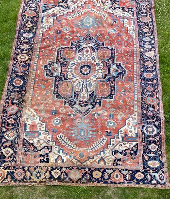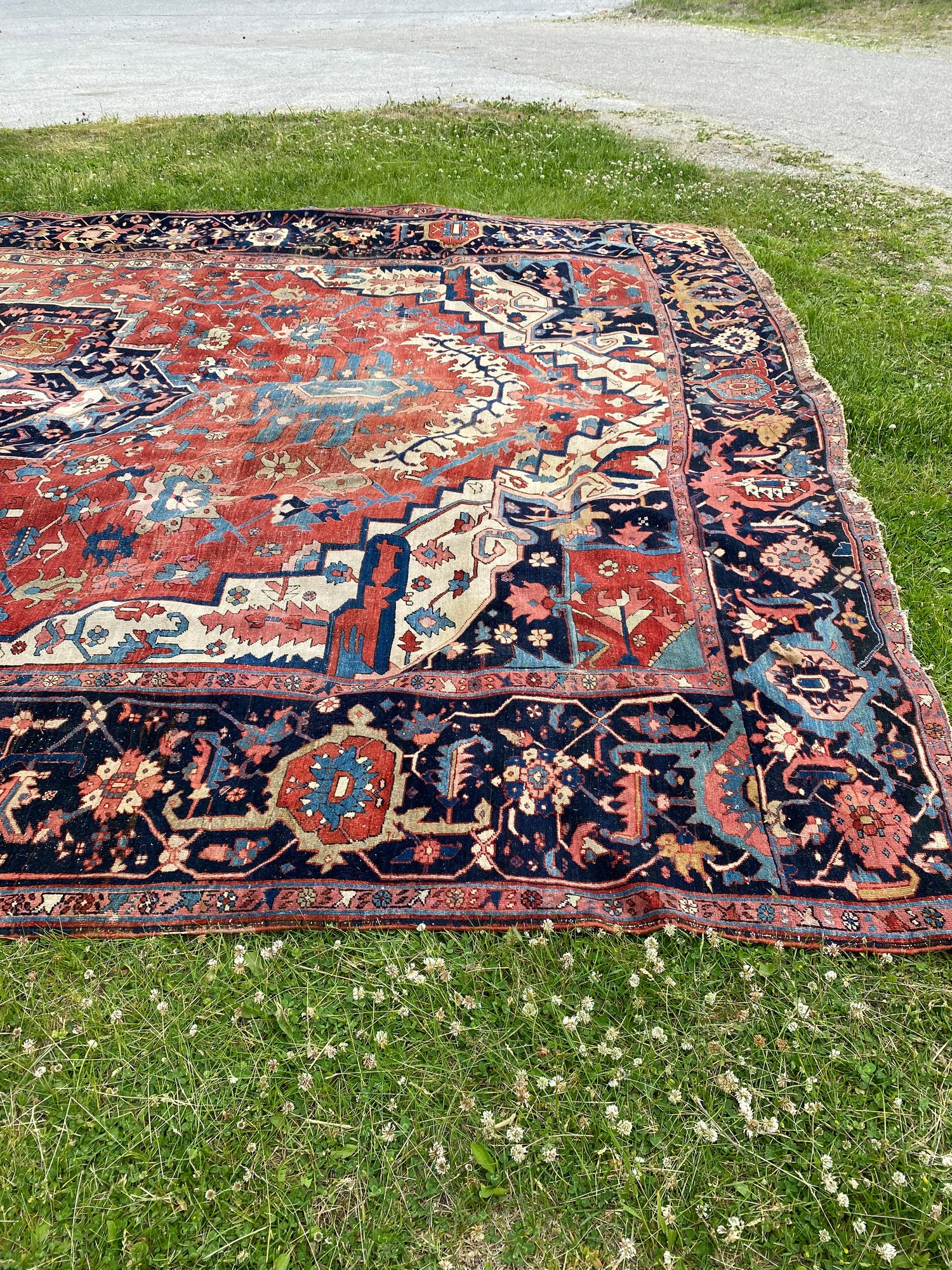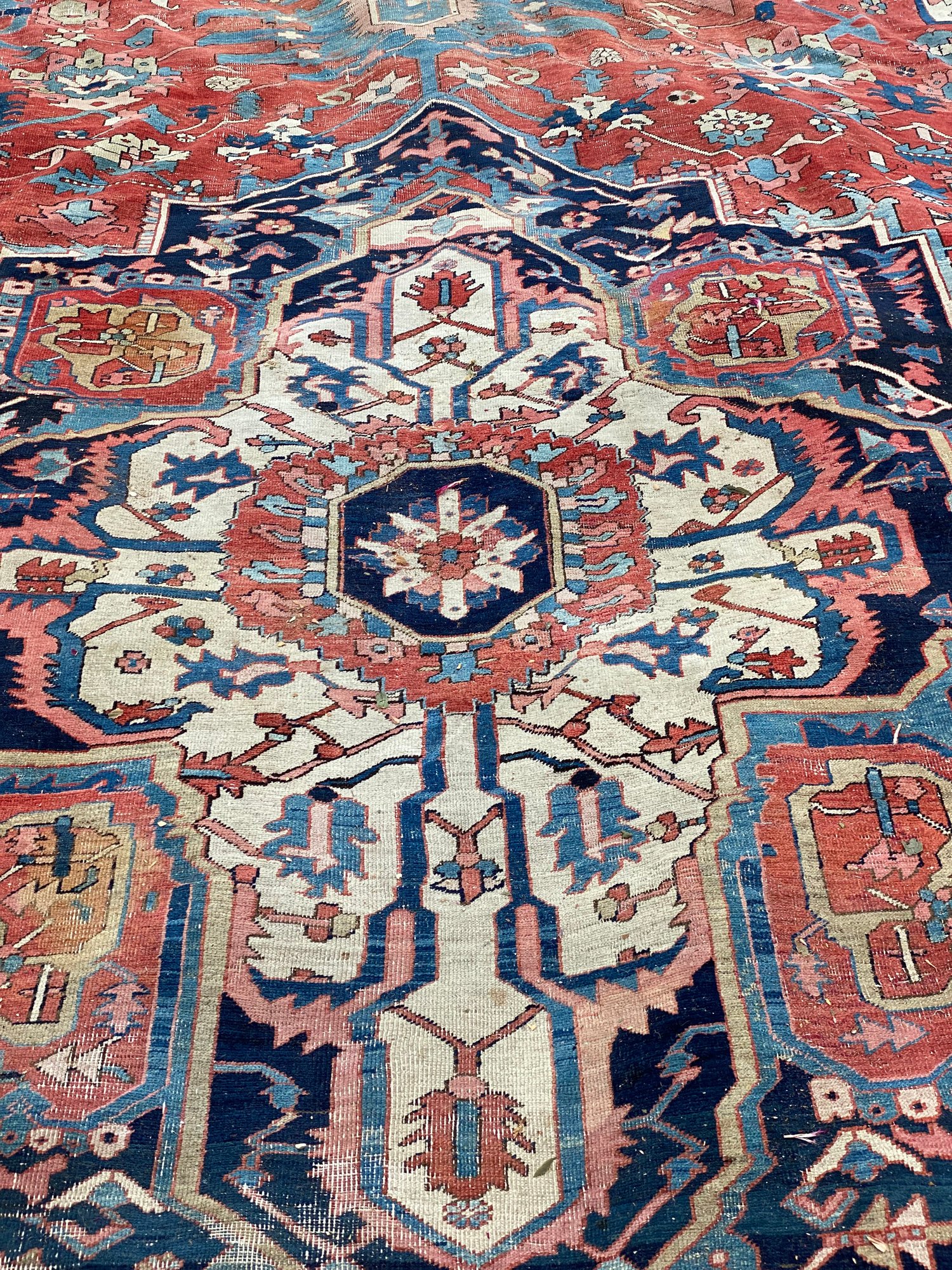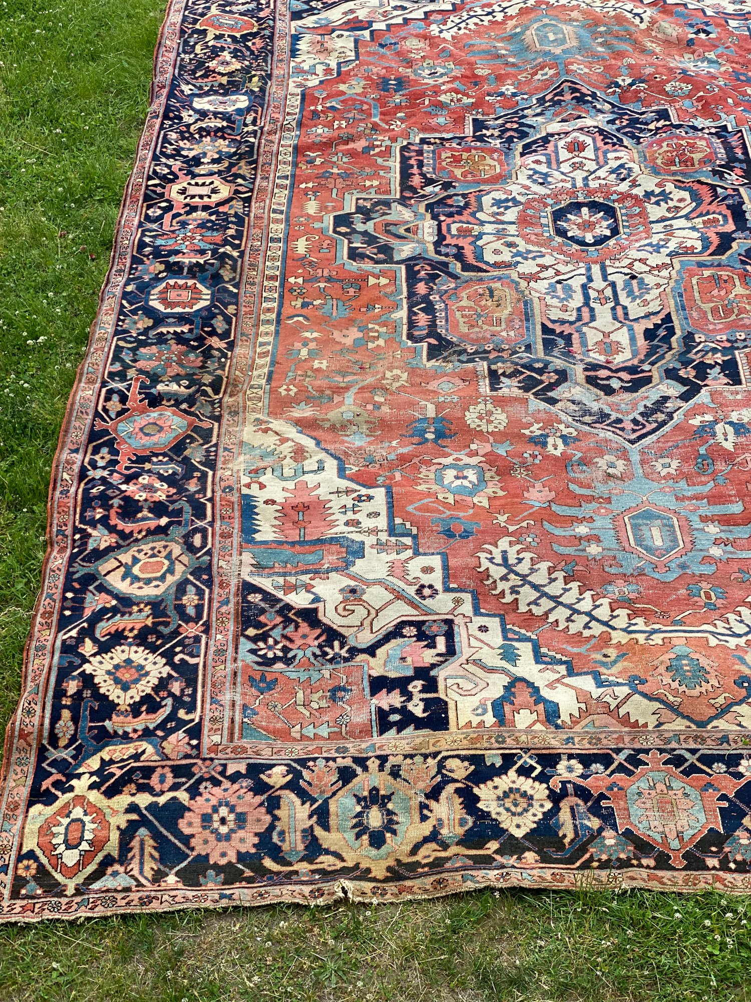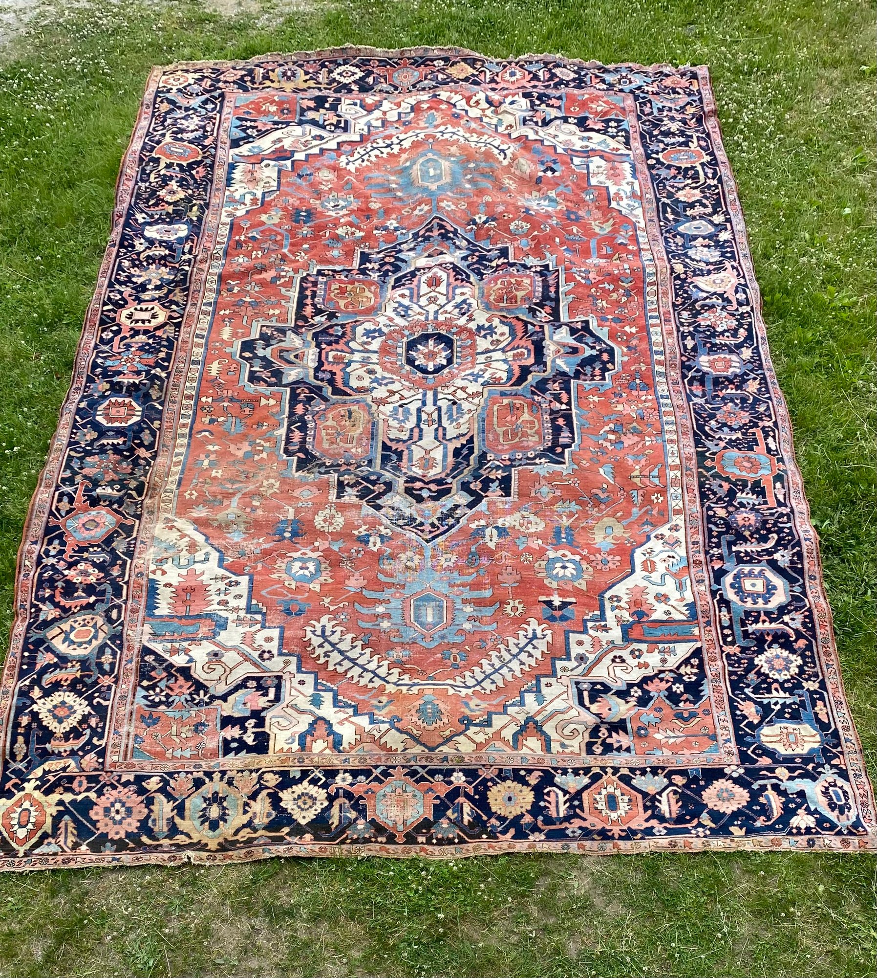This rug is impressive and has been in the same family’s possession for over a century. Beautiful colors and a little wear.