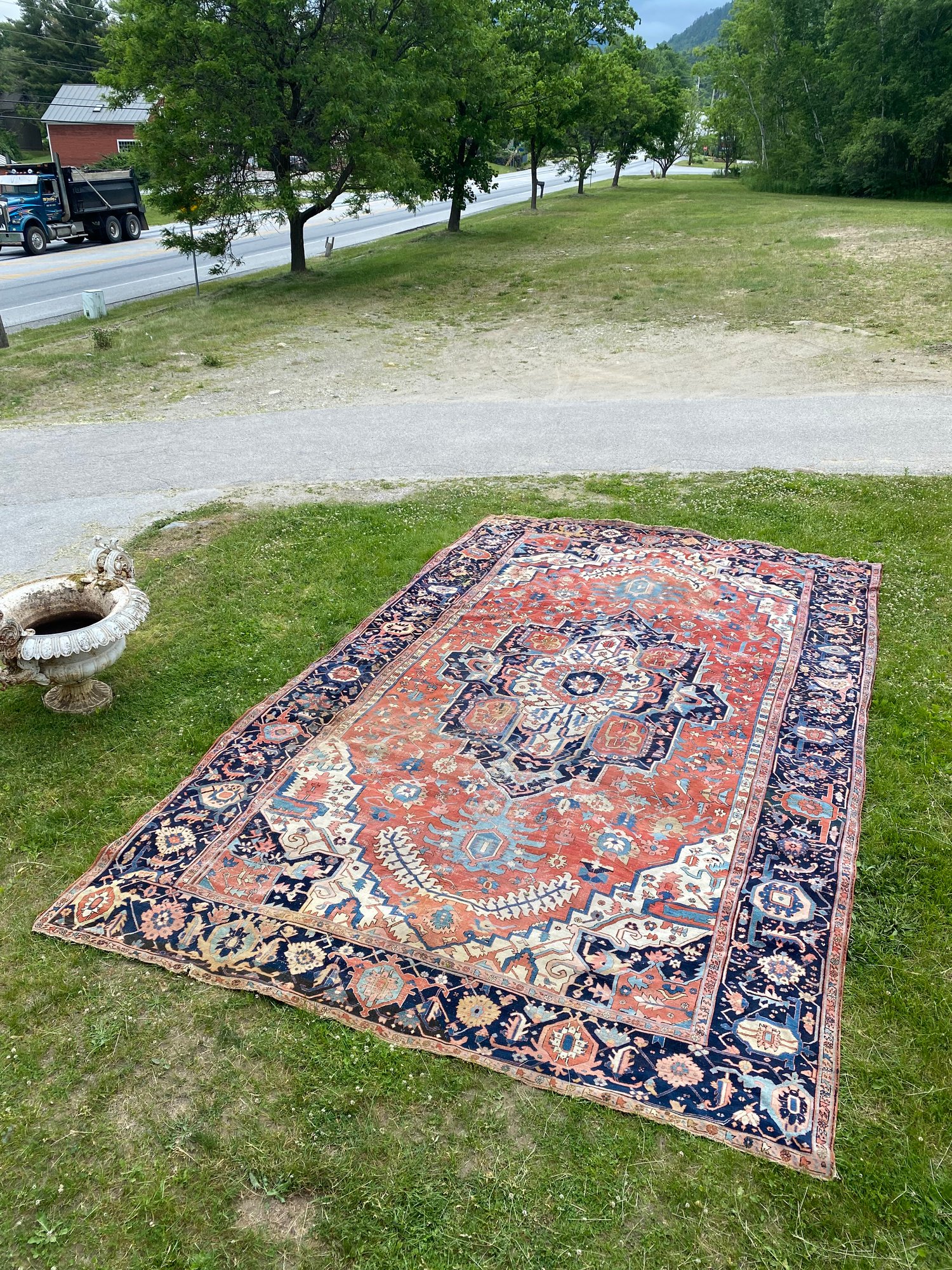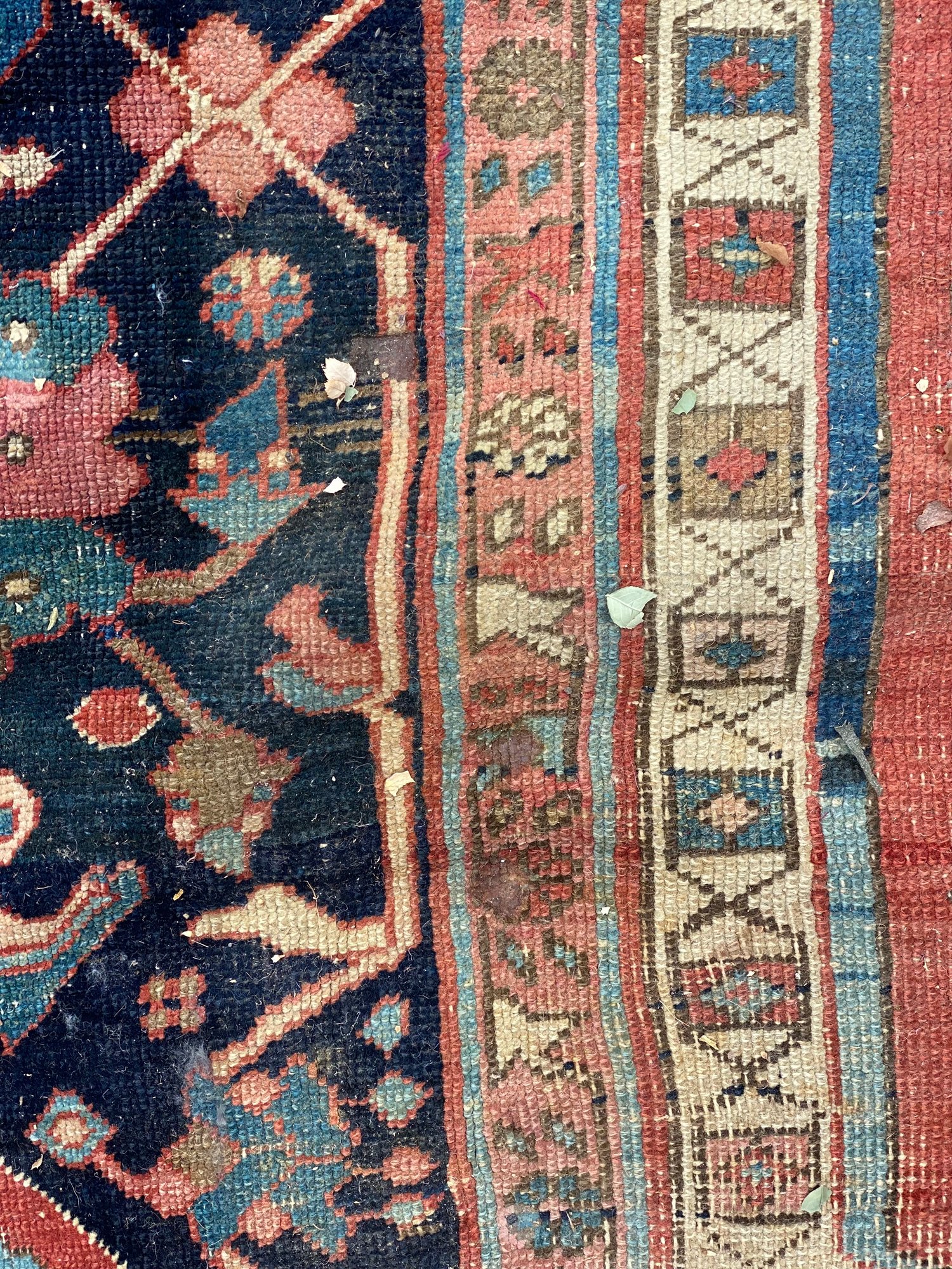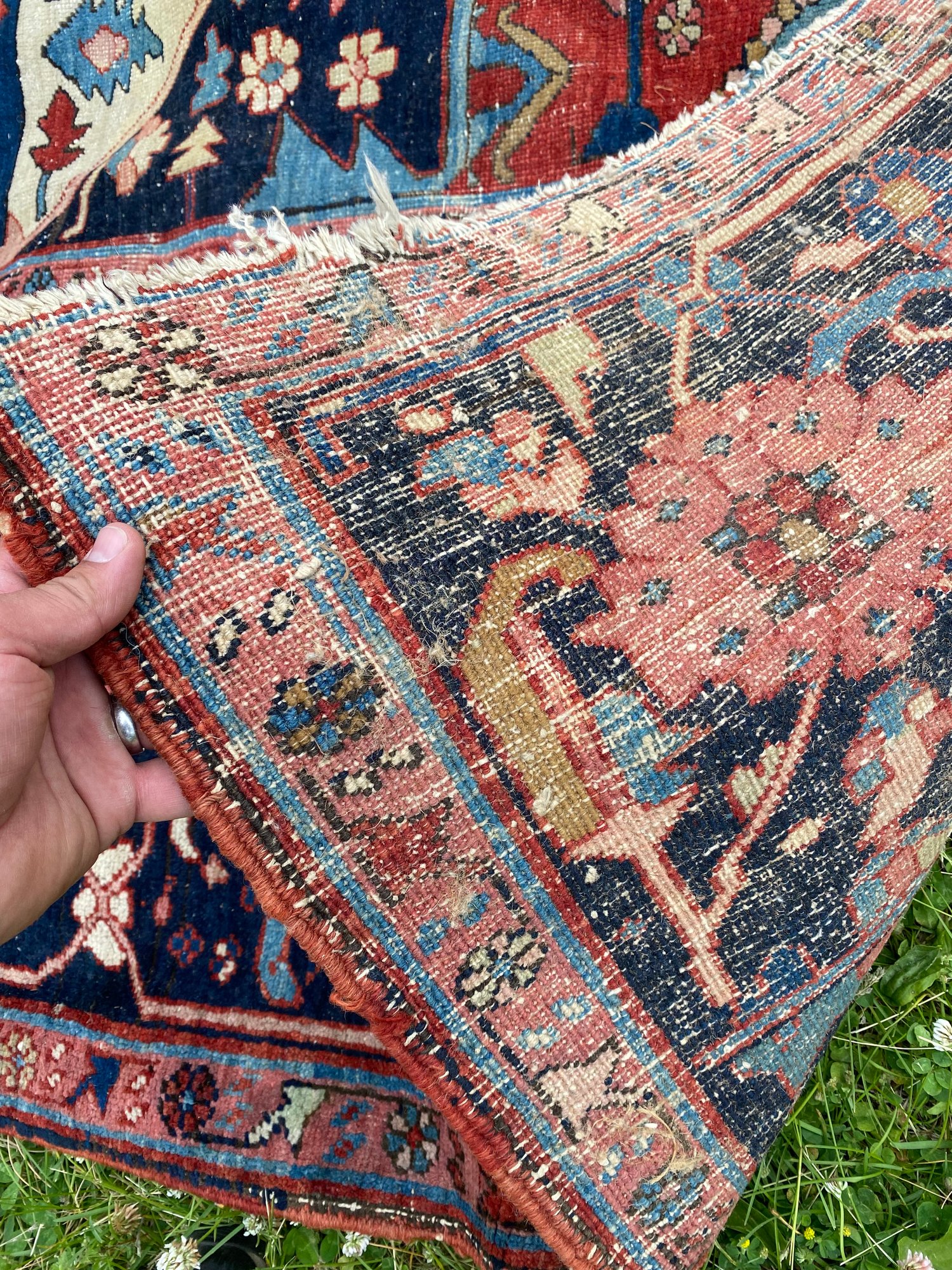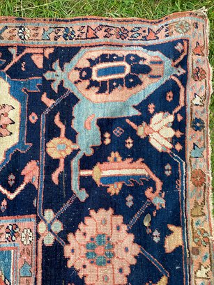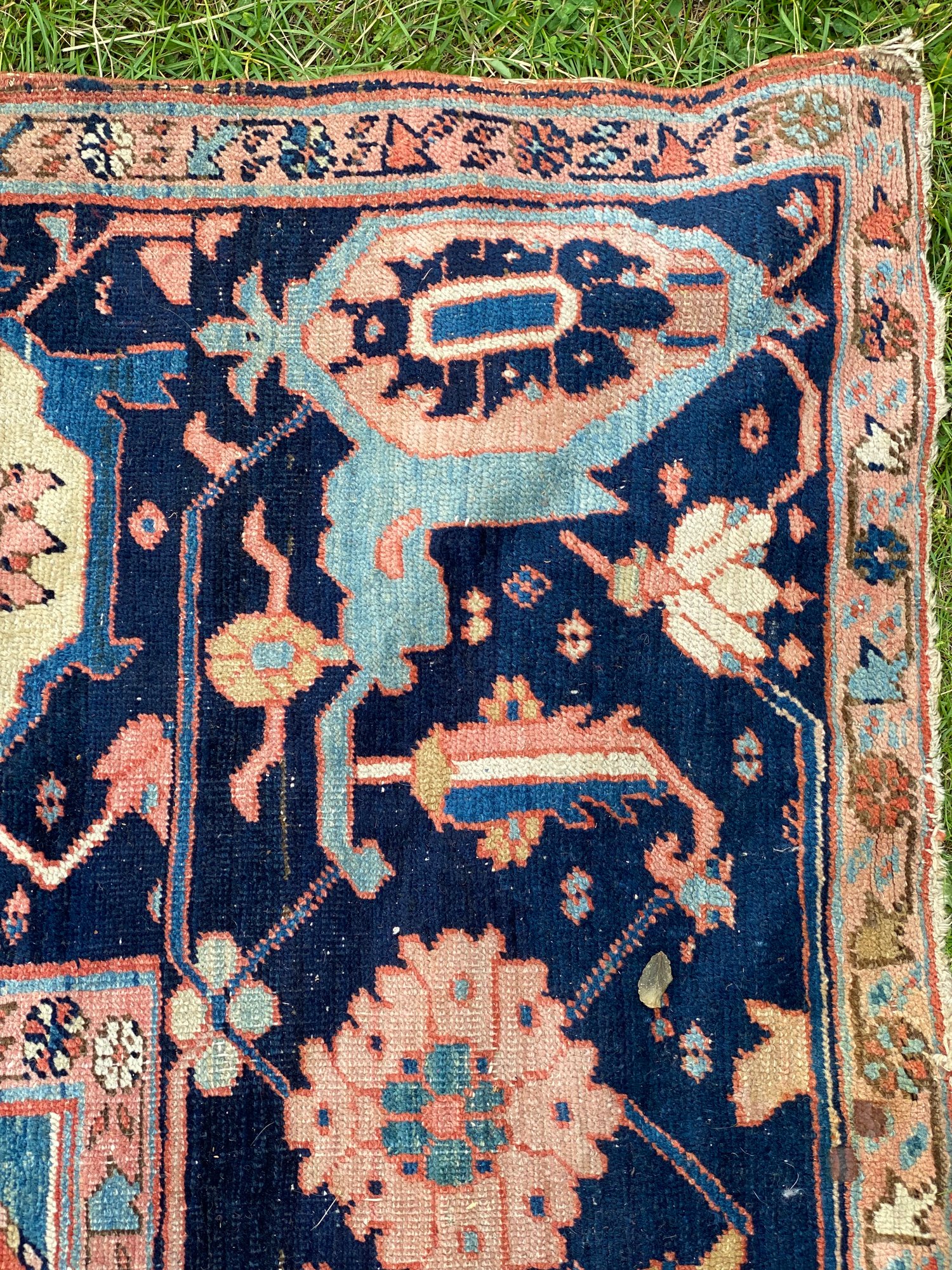 This rug is impressive and has been in the same family’s possession for over a century. Beautiful colors and a little wear.