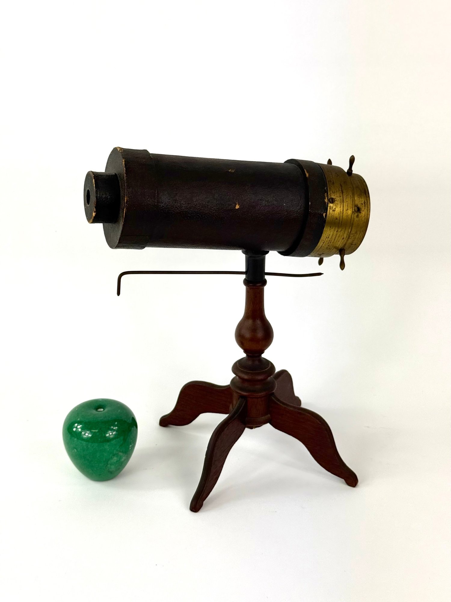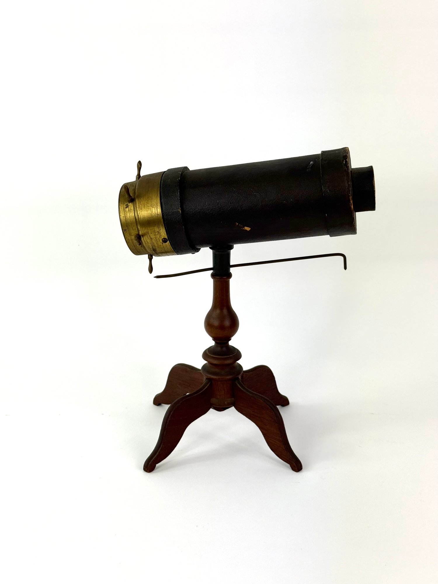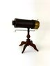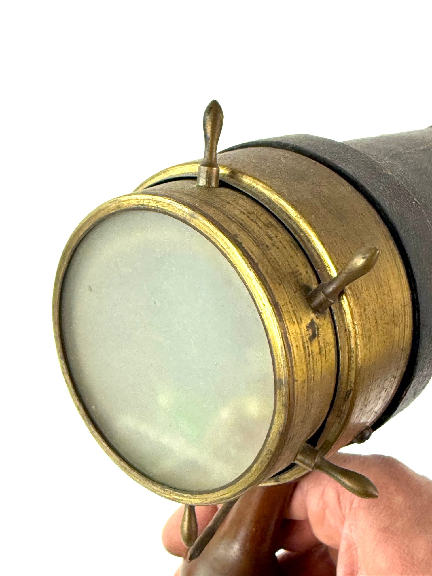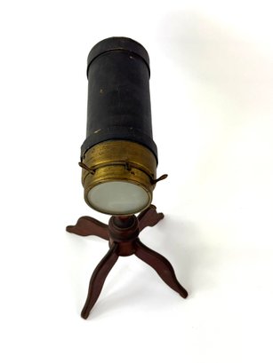 Made of brass wood and leather this kaleidoscope still has its original sway bar and glass contents. It is in working order.
