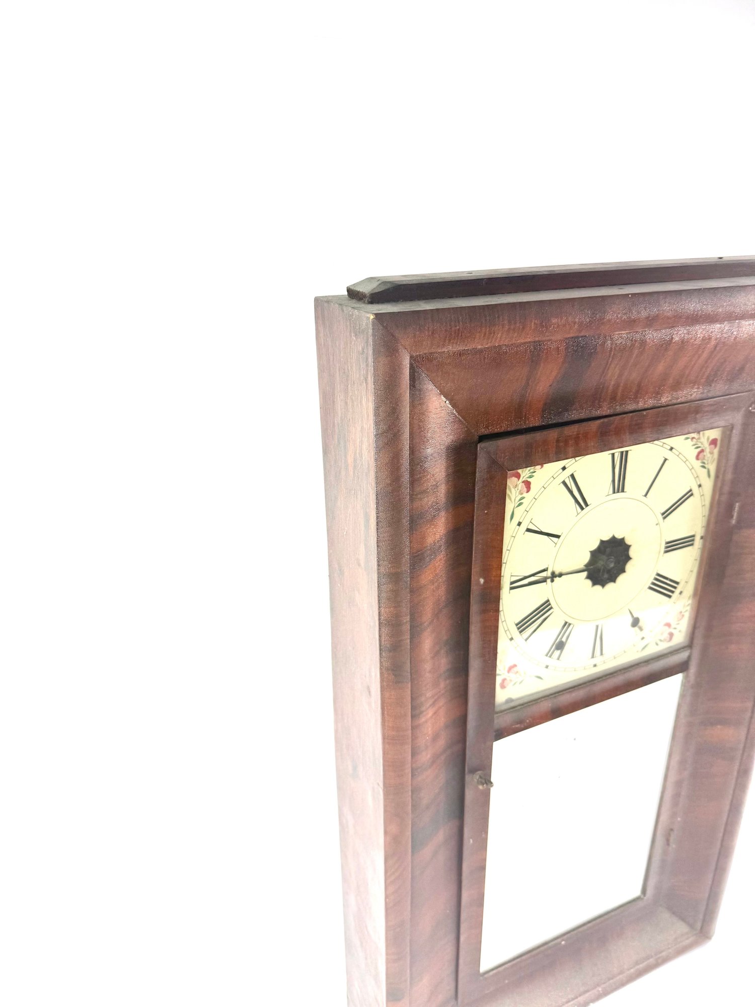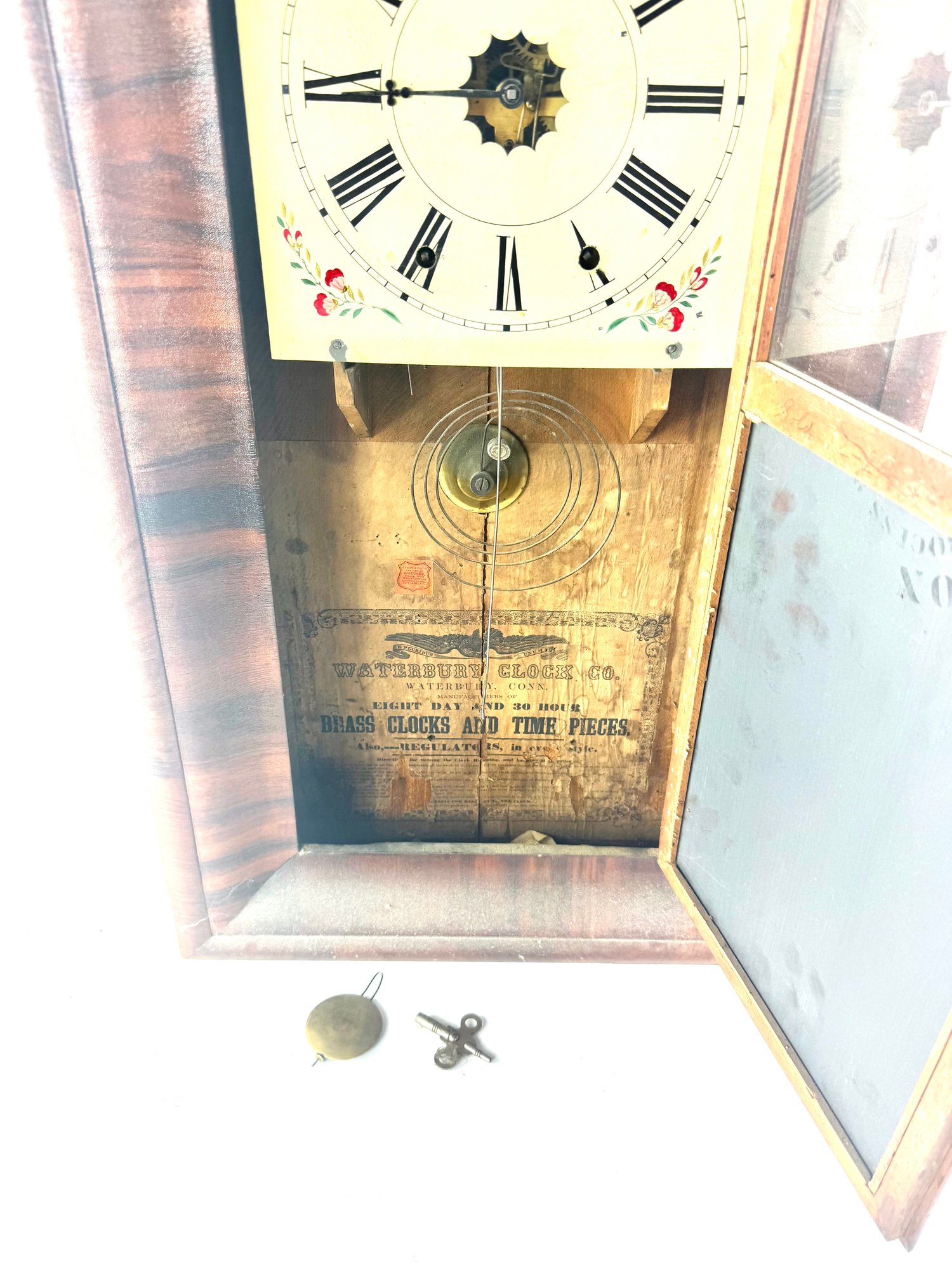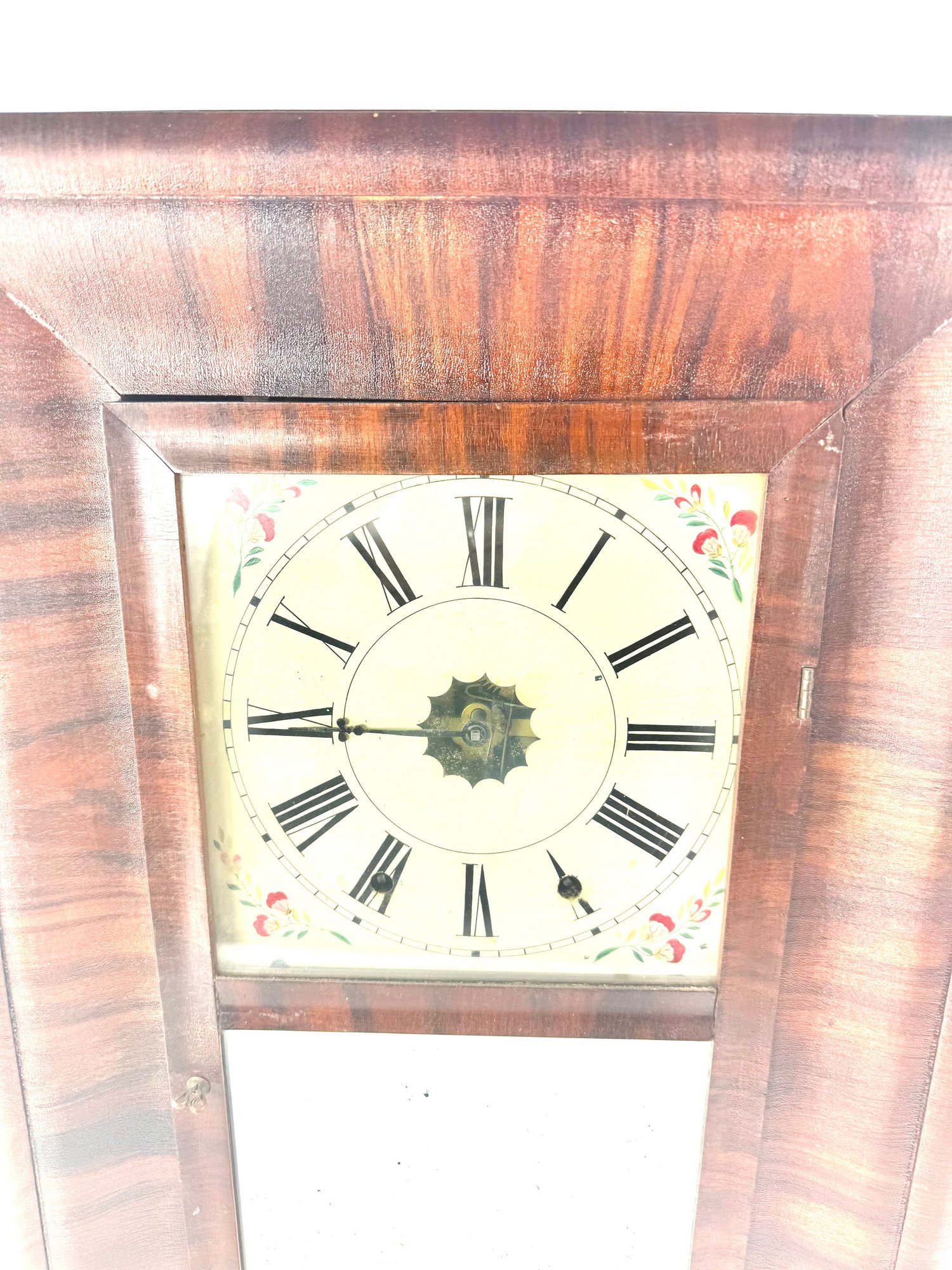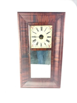 This clock has its original face, key and pendulum. It is not running. Please see photos.