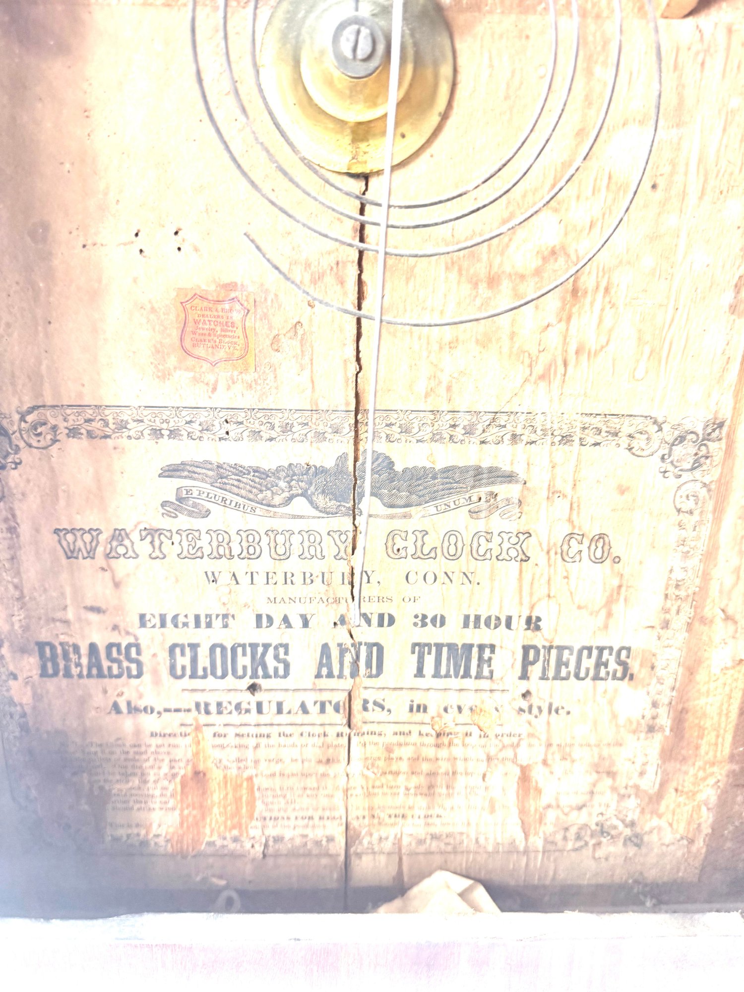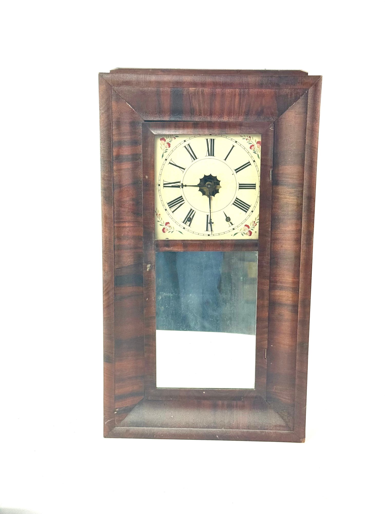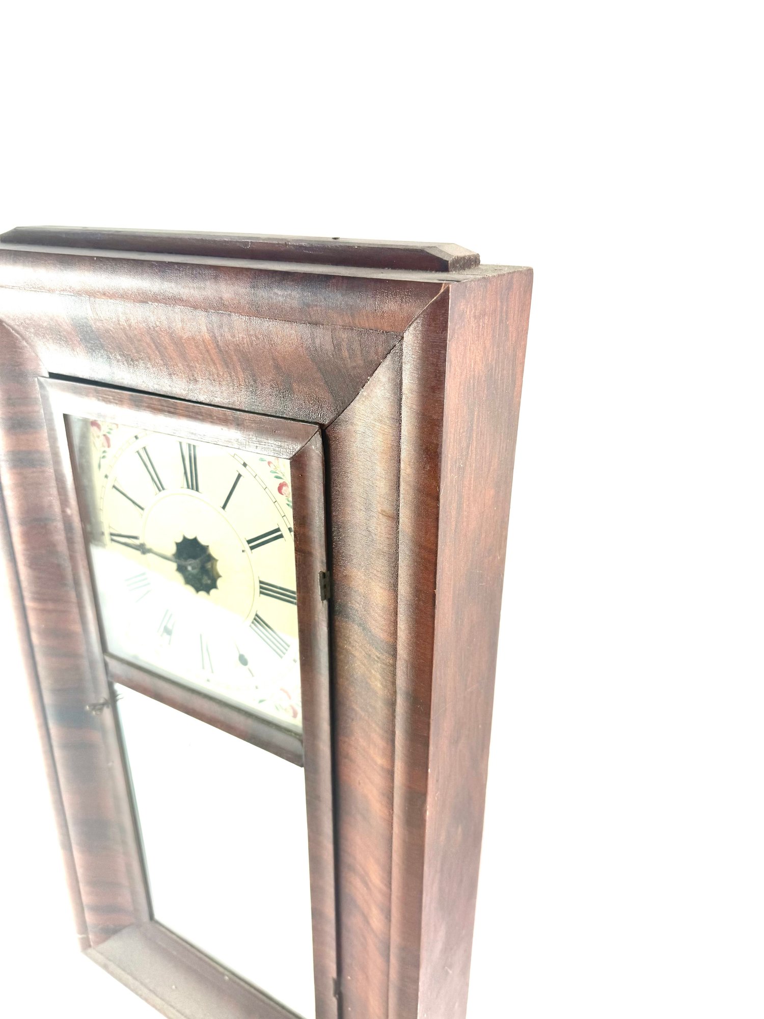 This clock has its original face, key and pendulum. It is not running. Please see photos.