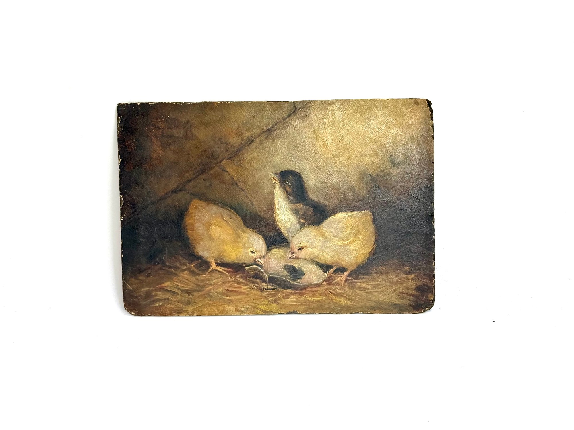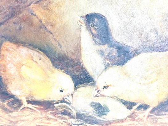 Unframed and done on masonite this 19th century oil shows three chickadees or birds of that nature.