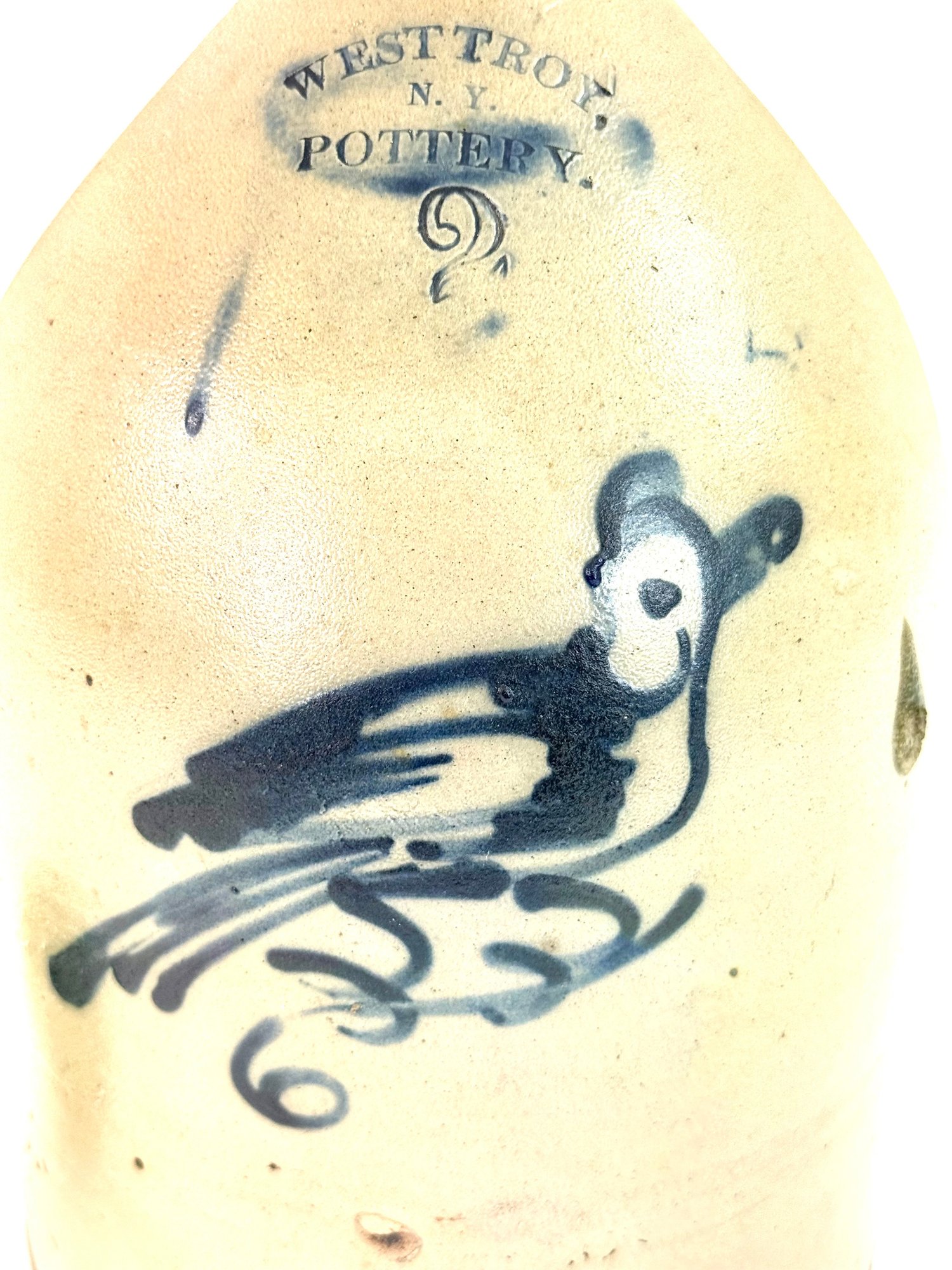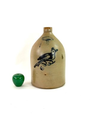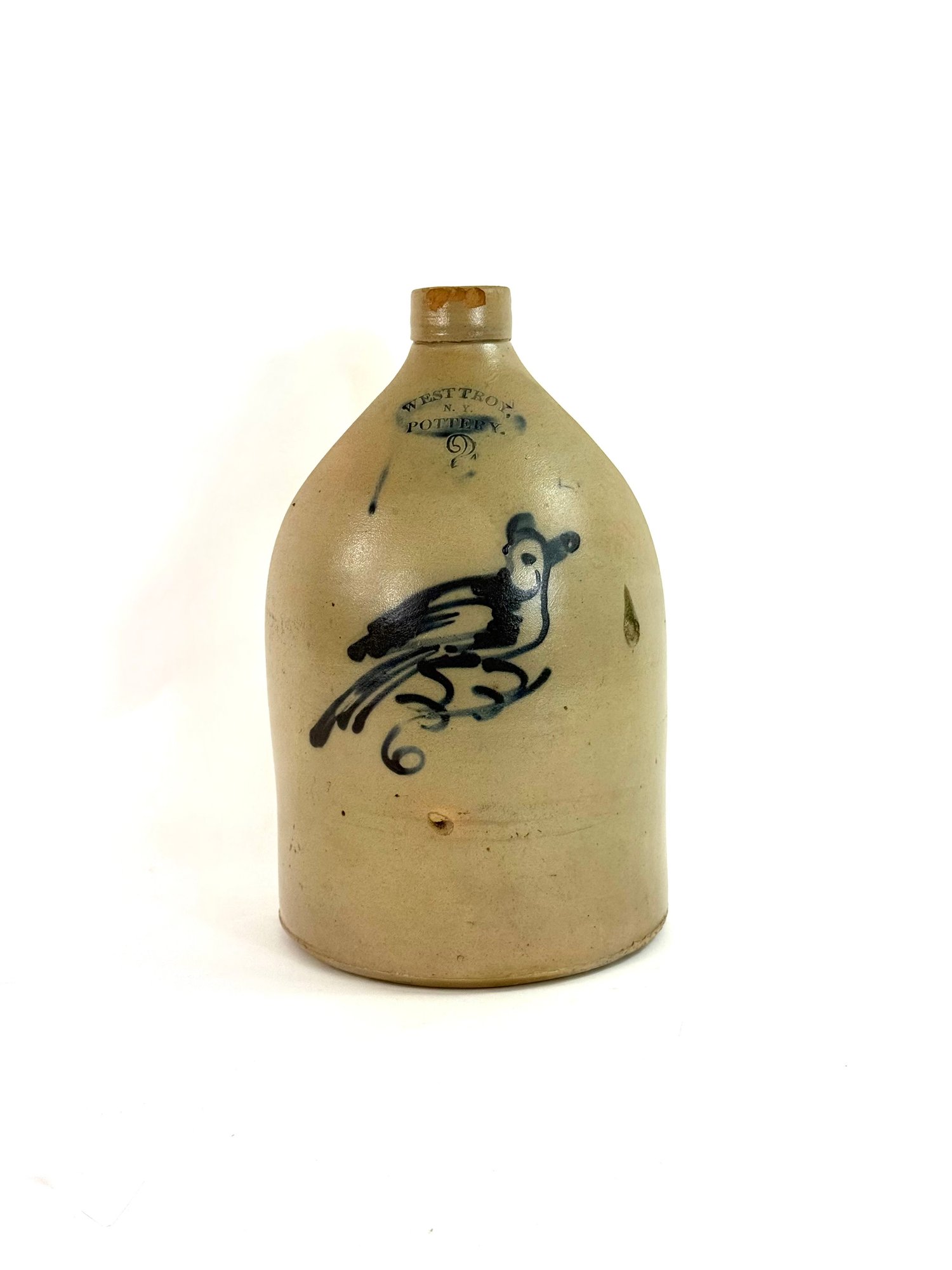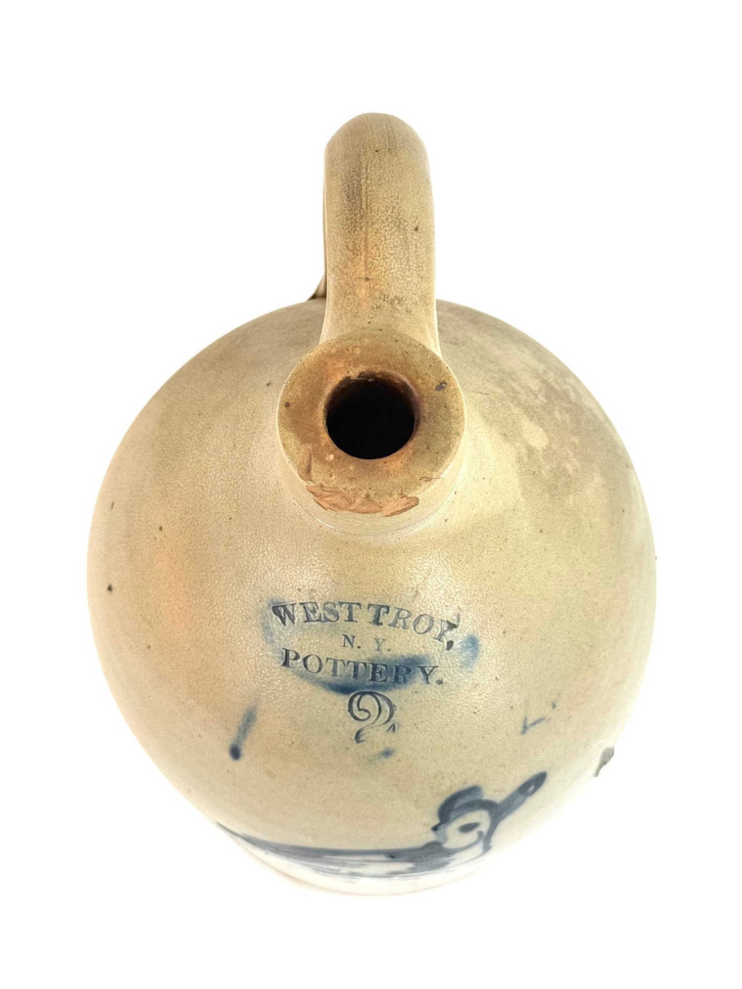 Stamped West Troy NY pottery with a 2 this jug depicts a bird sitting on a curling branch. A nice dark blue color. Small chips on rim please see photos.