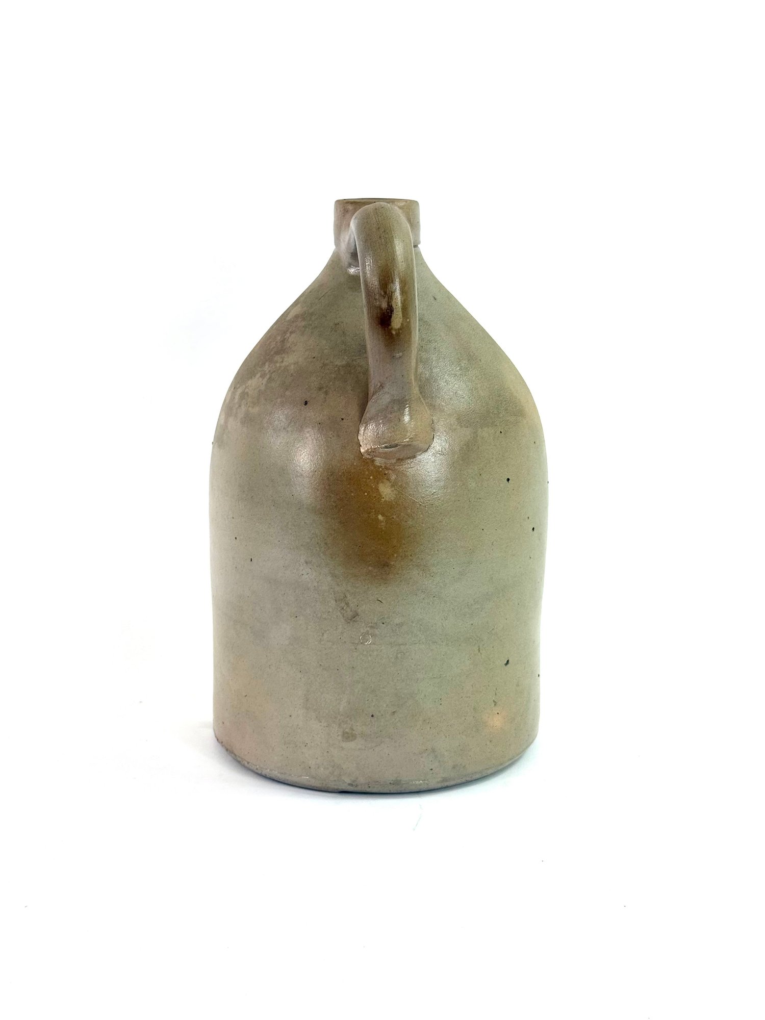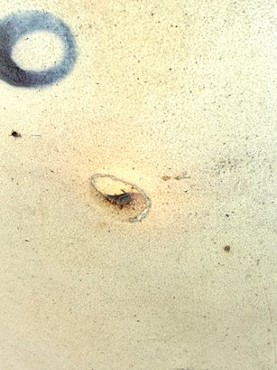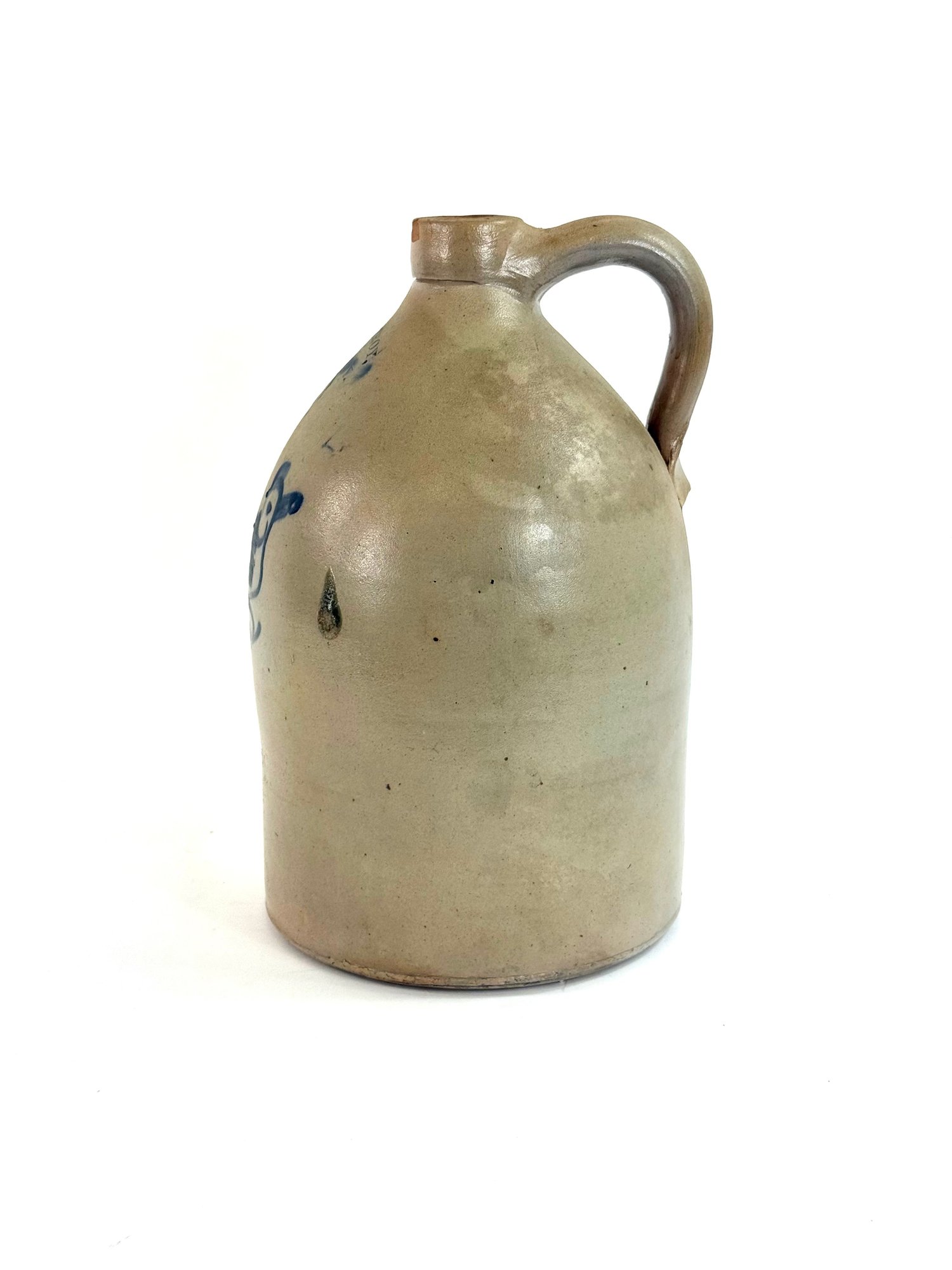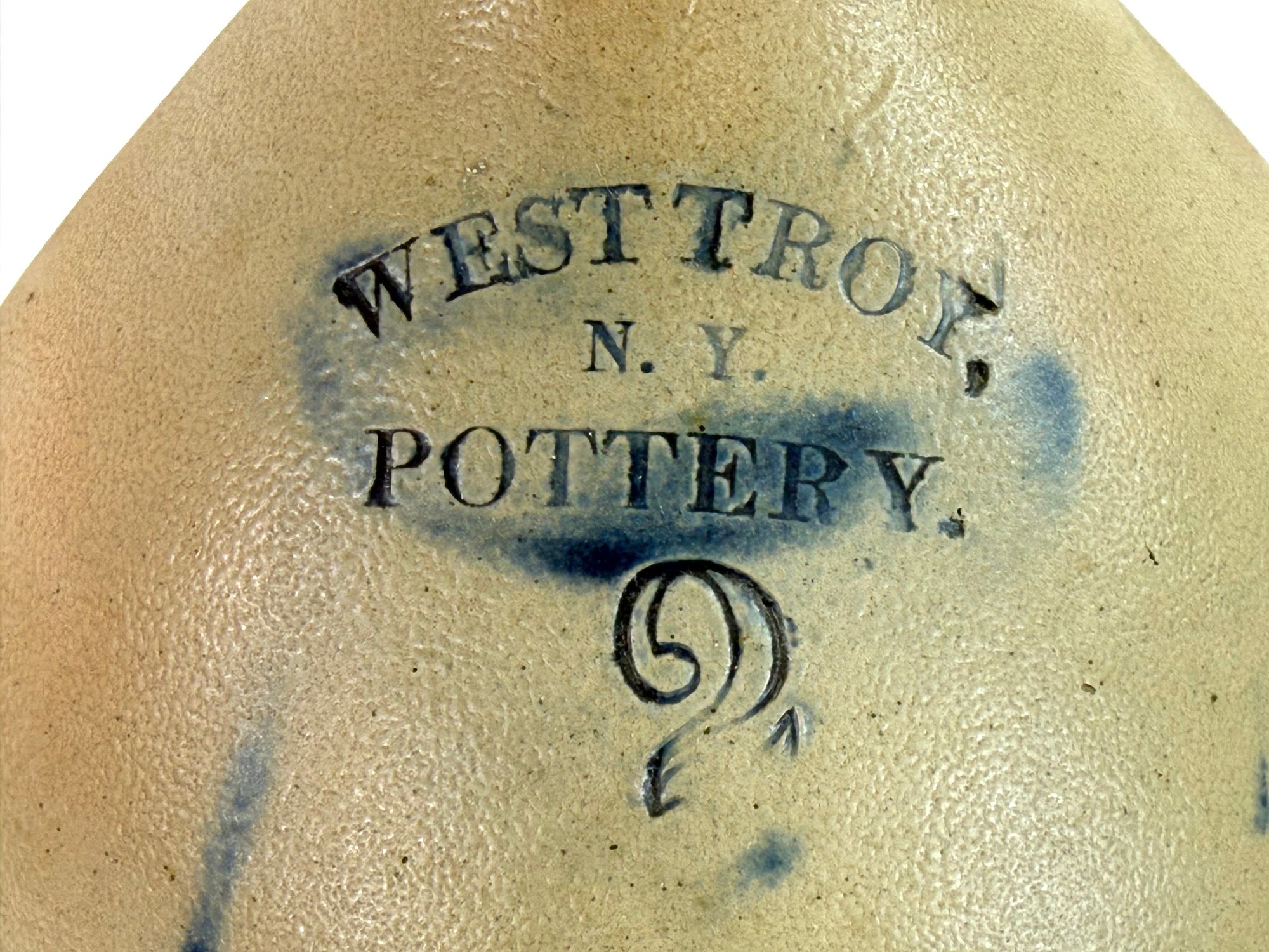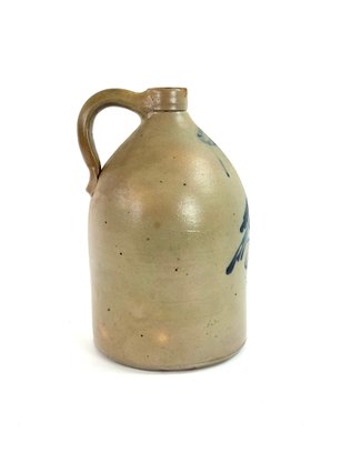 Stamped West Troy NY pottery with a 2 this jug depicts a bird sitting on a curling branch. A nice dark blue color. Small chips on rim please see photos.
