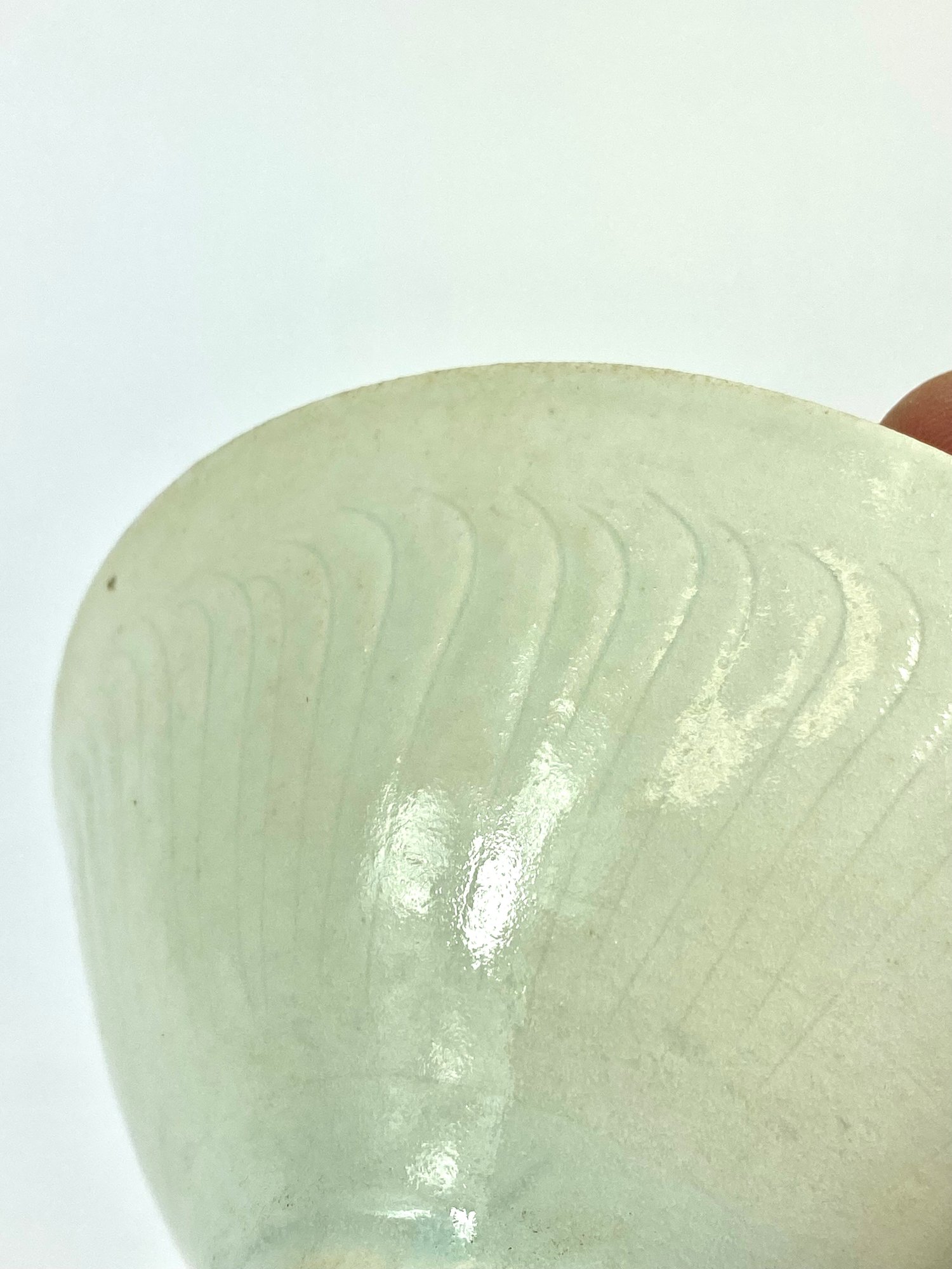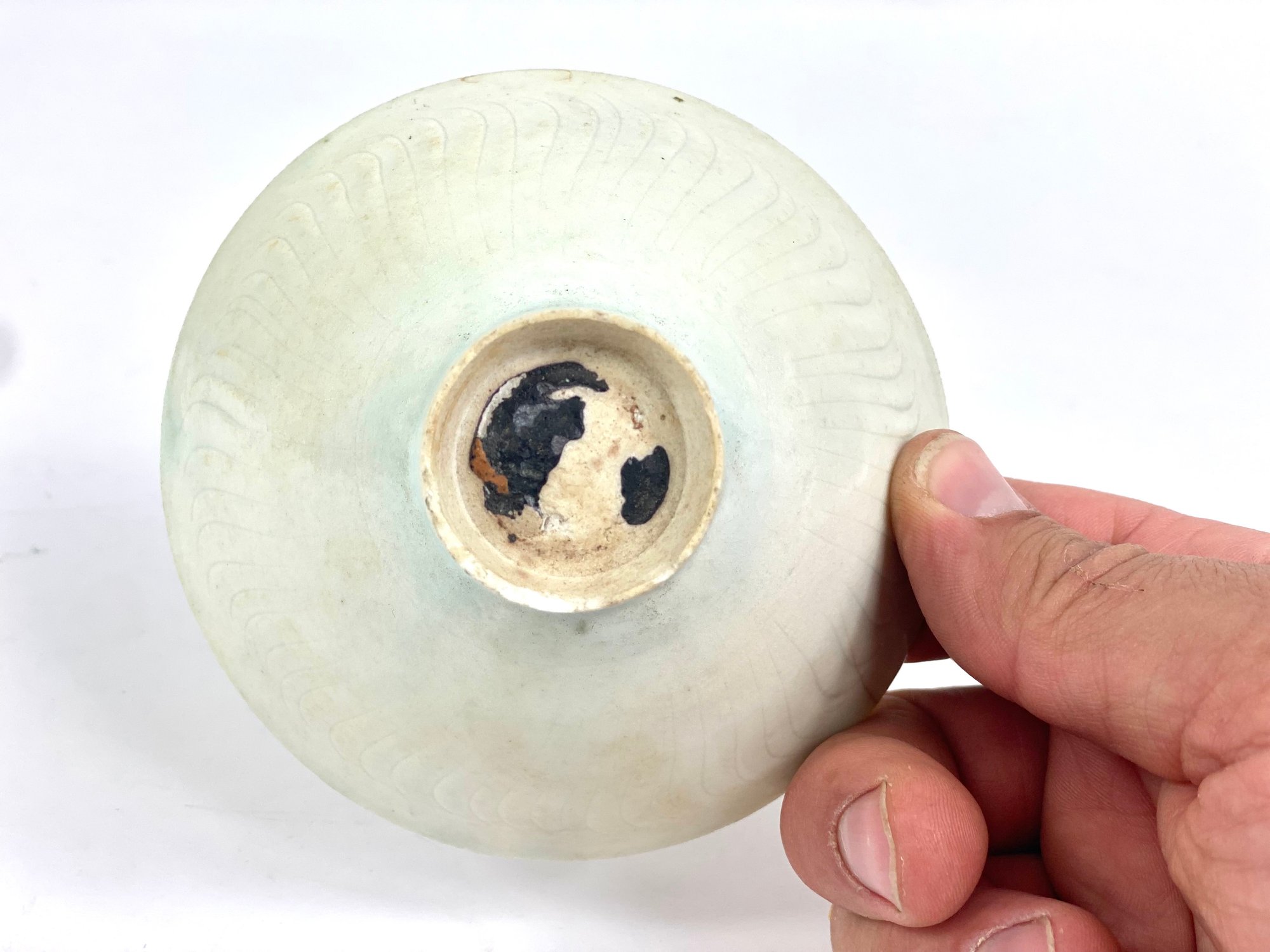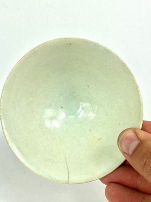 18th Century bowl has wave pattern on outside and faded patterns inside. There is a hairline crack please note.