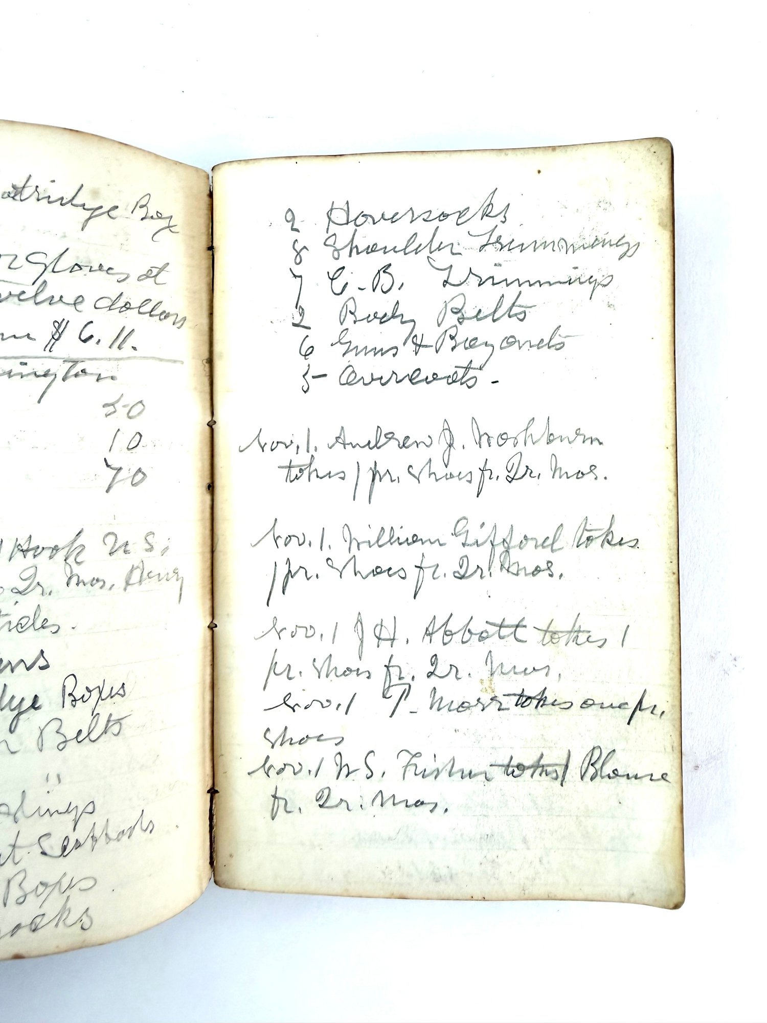 This leather bound document book has amount food purchases and rations. It talks about military supplies. It comes with a hand carved wooden opener.