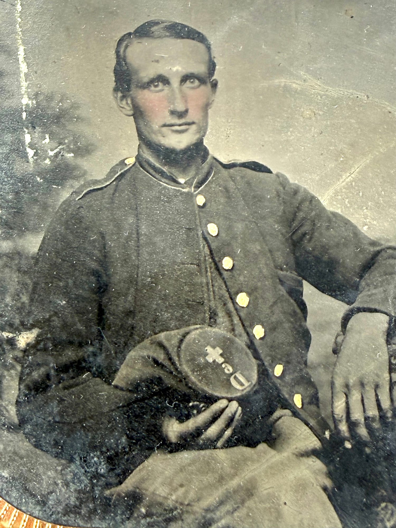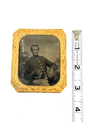 In a decorative gold frame, this antique tin type of Civil War soldier has a hat with a D and + on it. Please see photos.