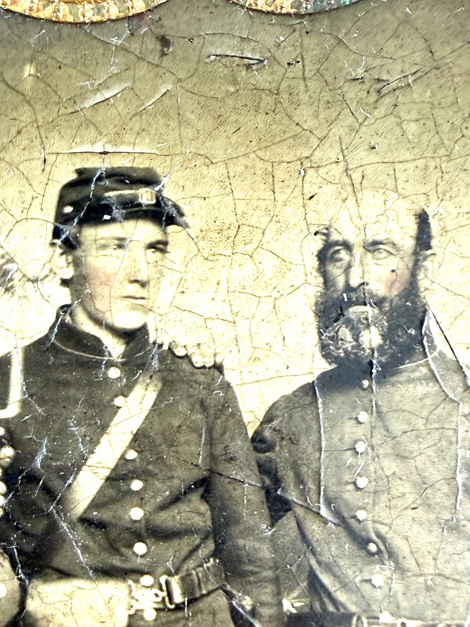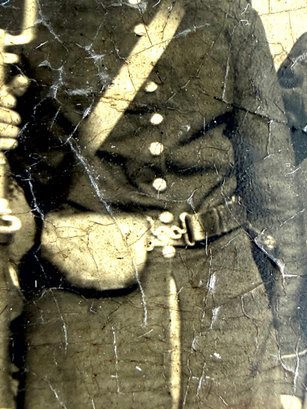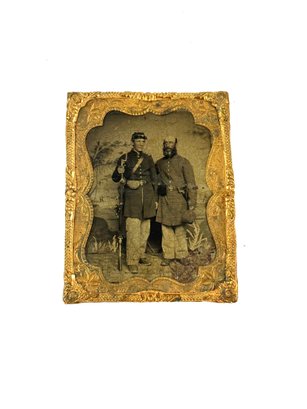 This Antique Civil War tin type has two union officers posing one holding his gun.