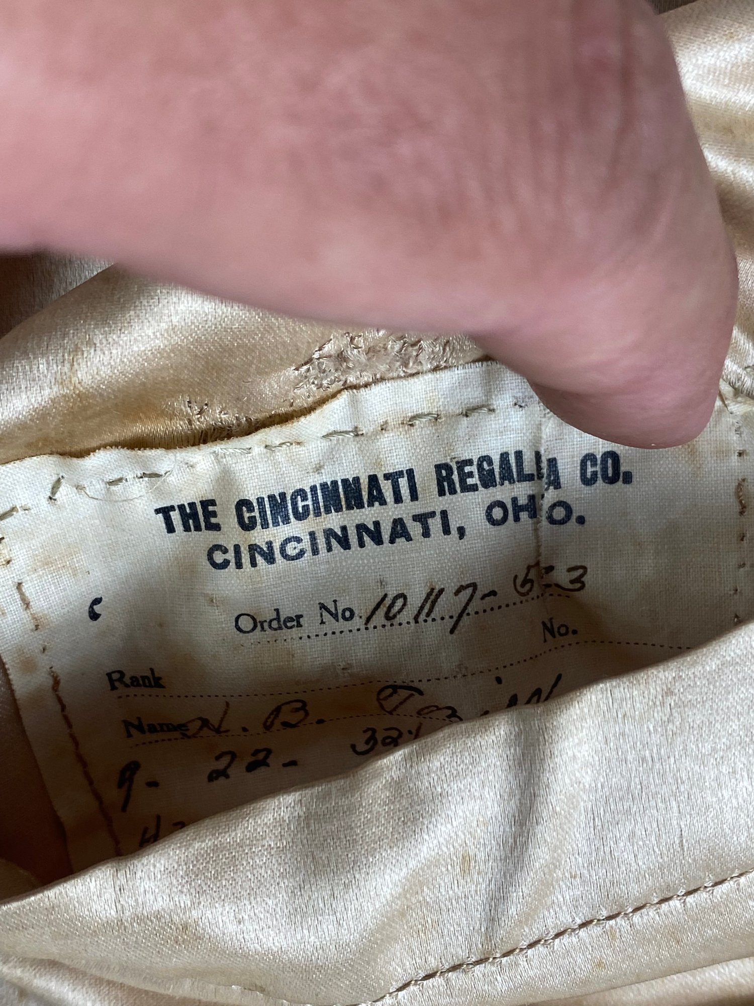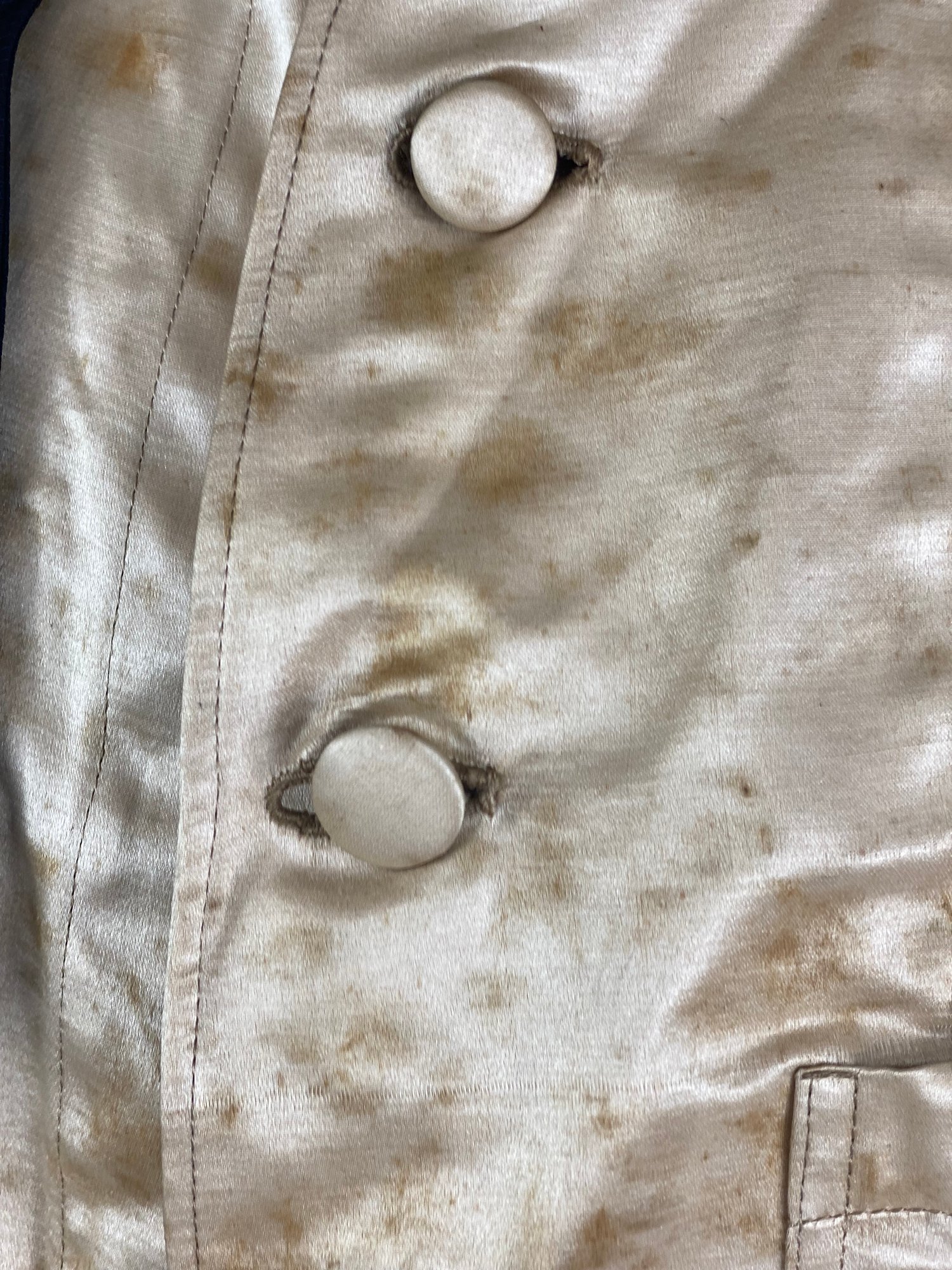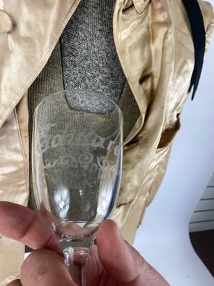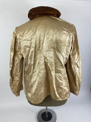 Made of silk with a V on the collar. Comes with eye goggles, Hat and drinking glass that have Saratoga 1906 Edward on it.