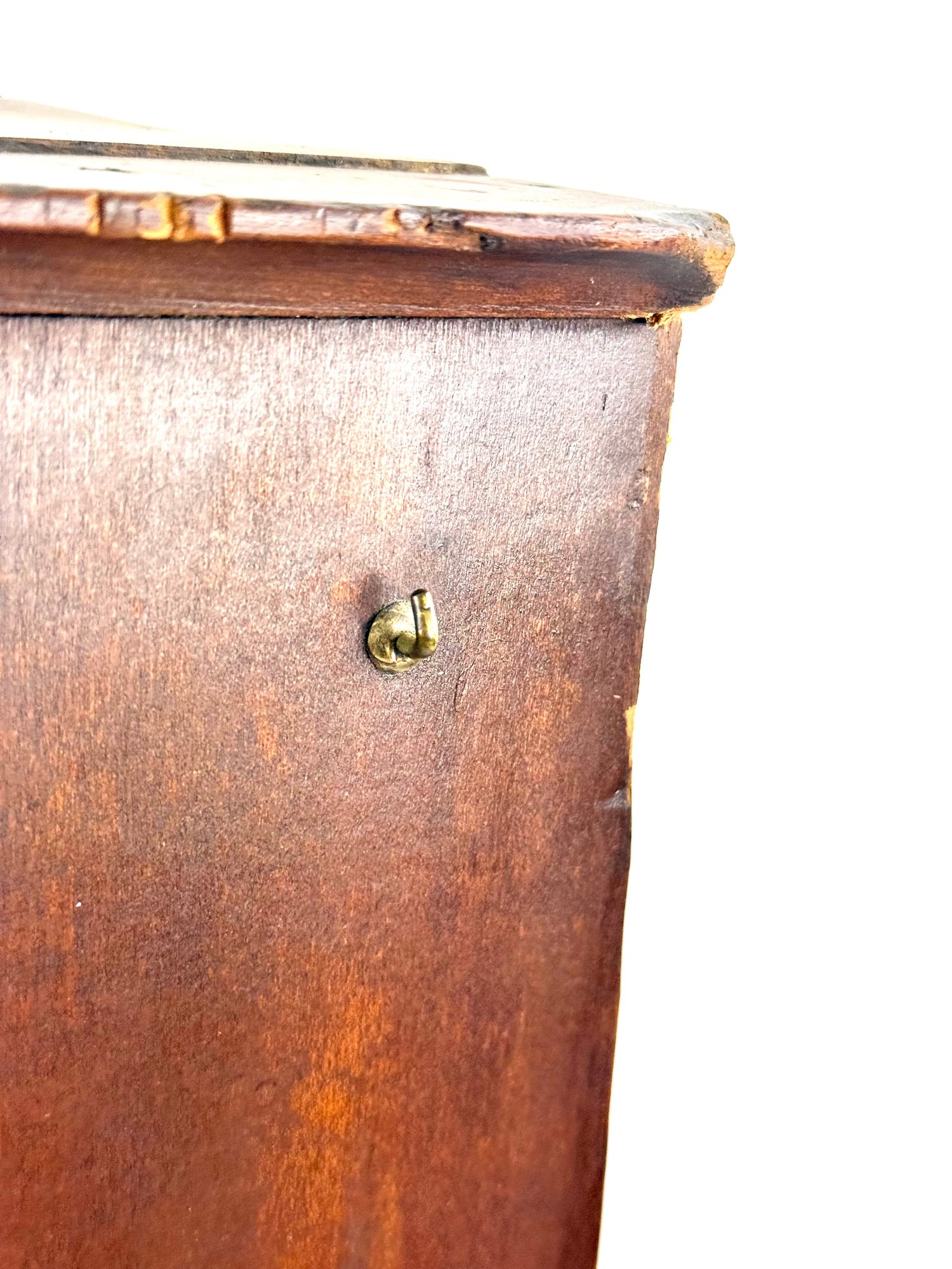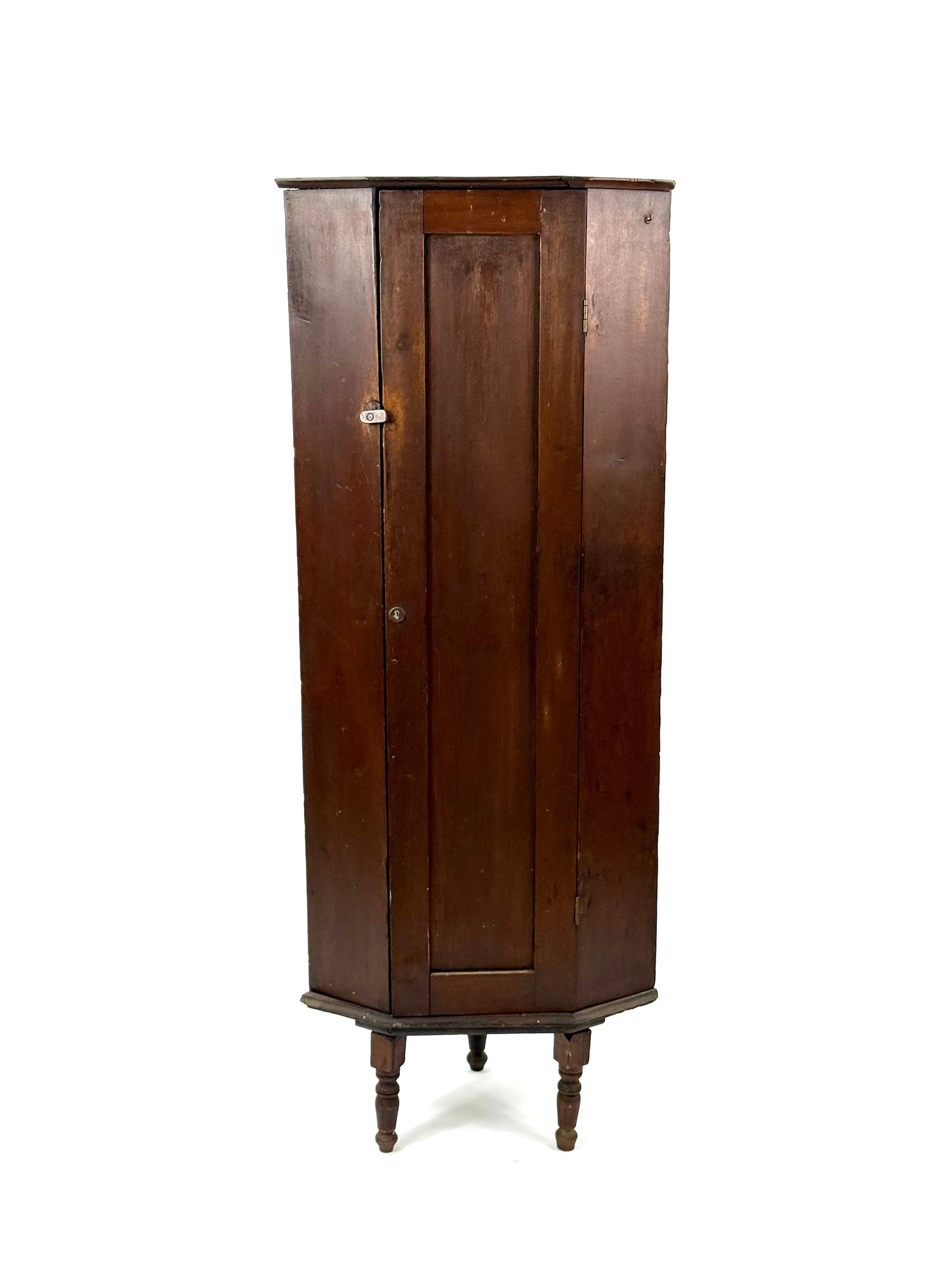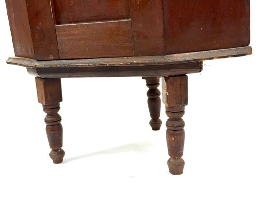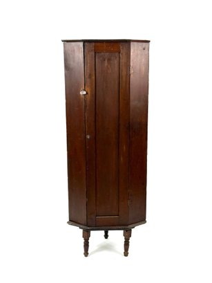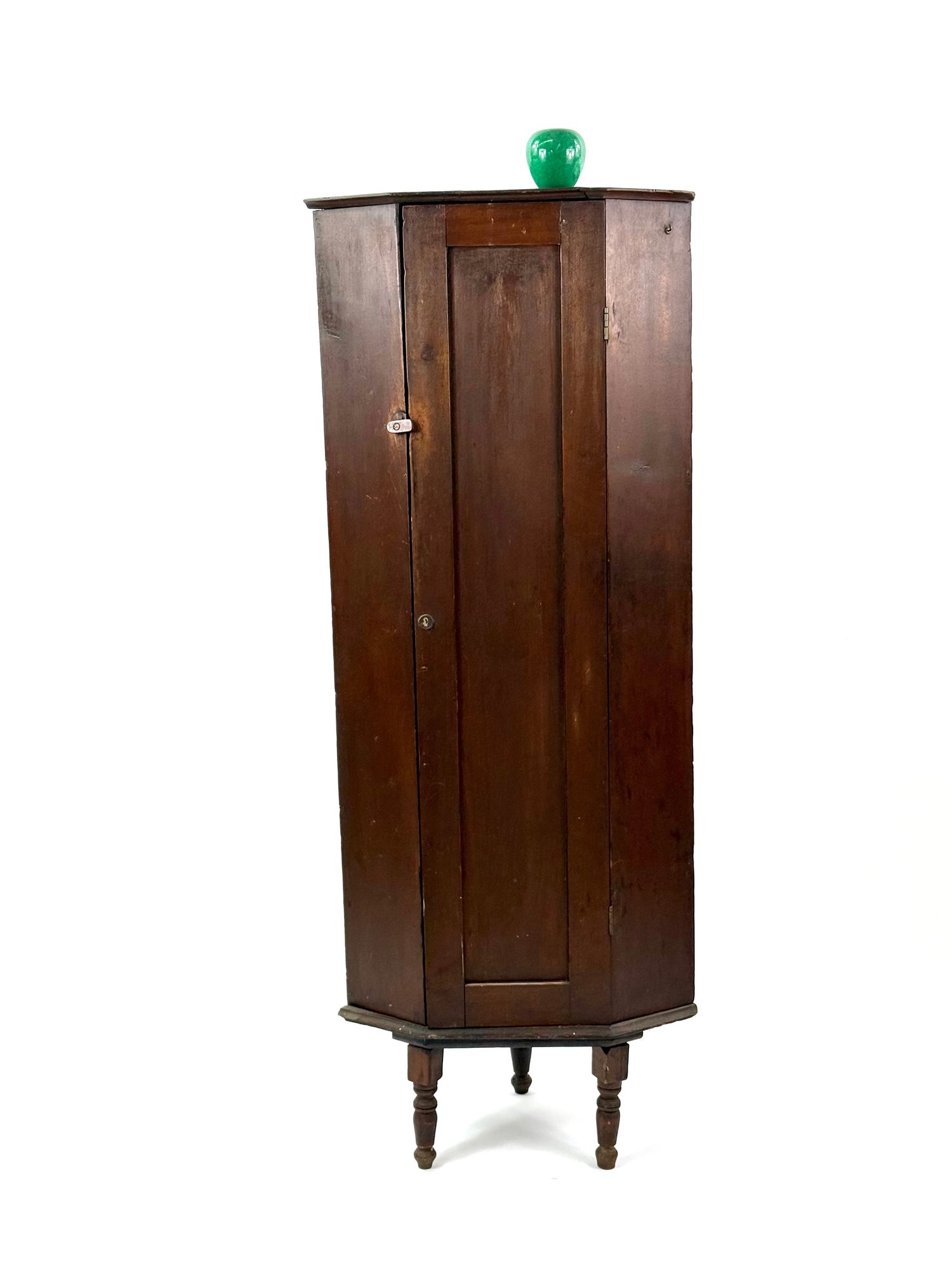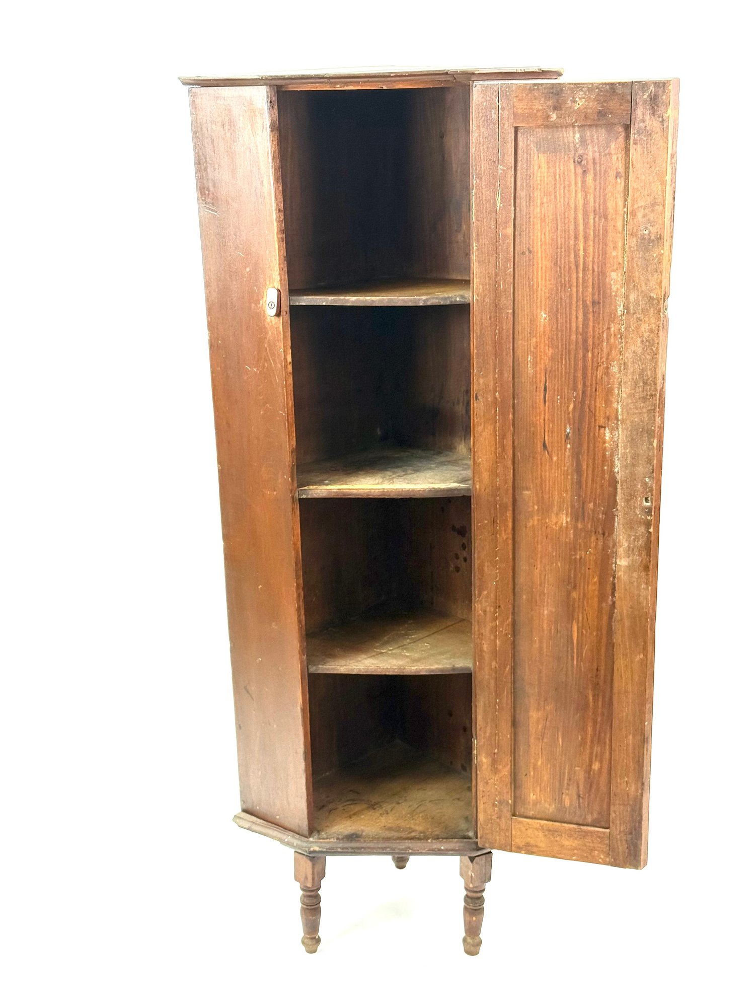 This antique cabinet sits on three turned legs. It is in old red with Square nails throughout. Please see photos.