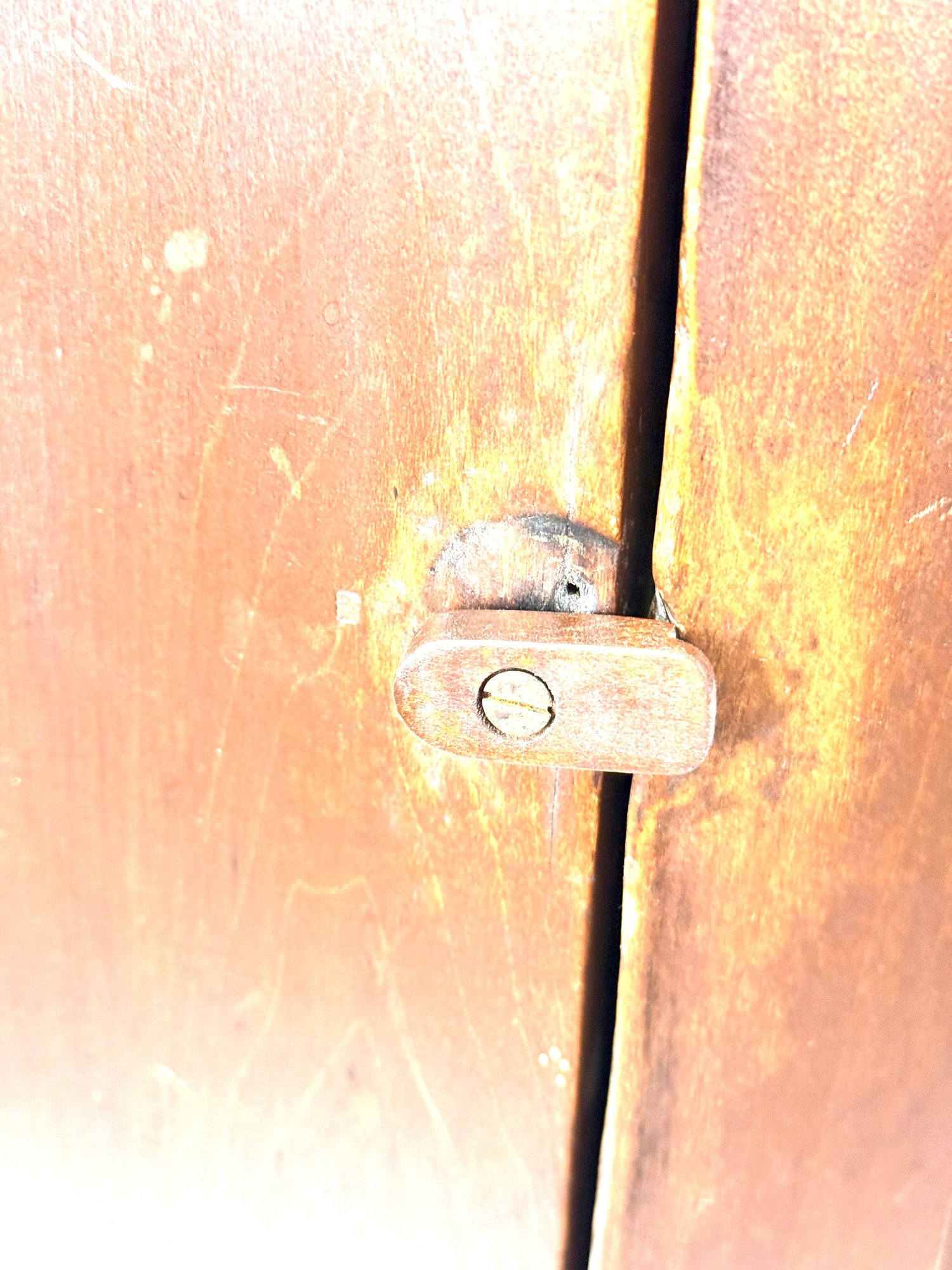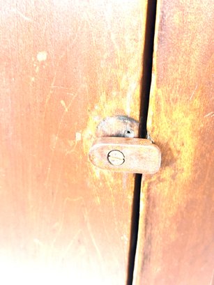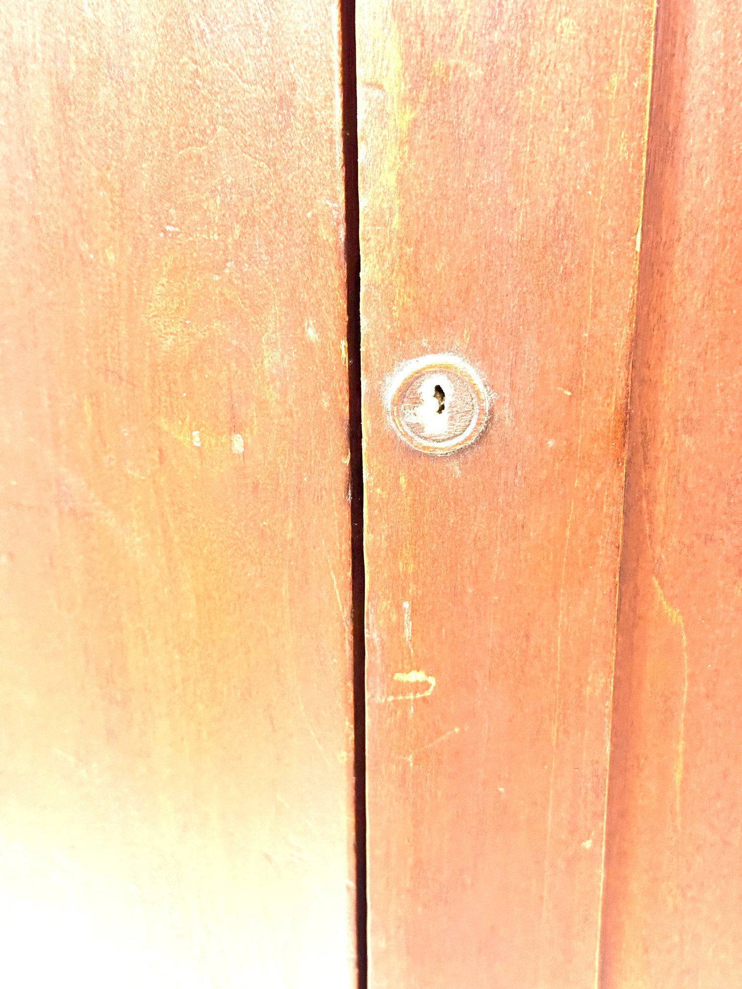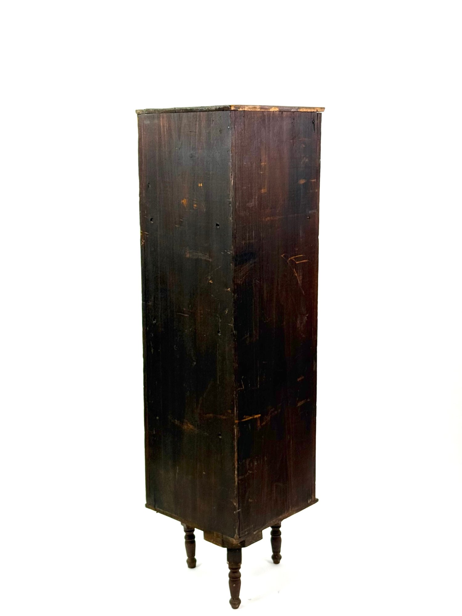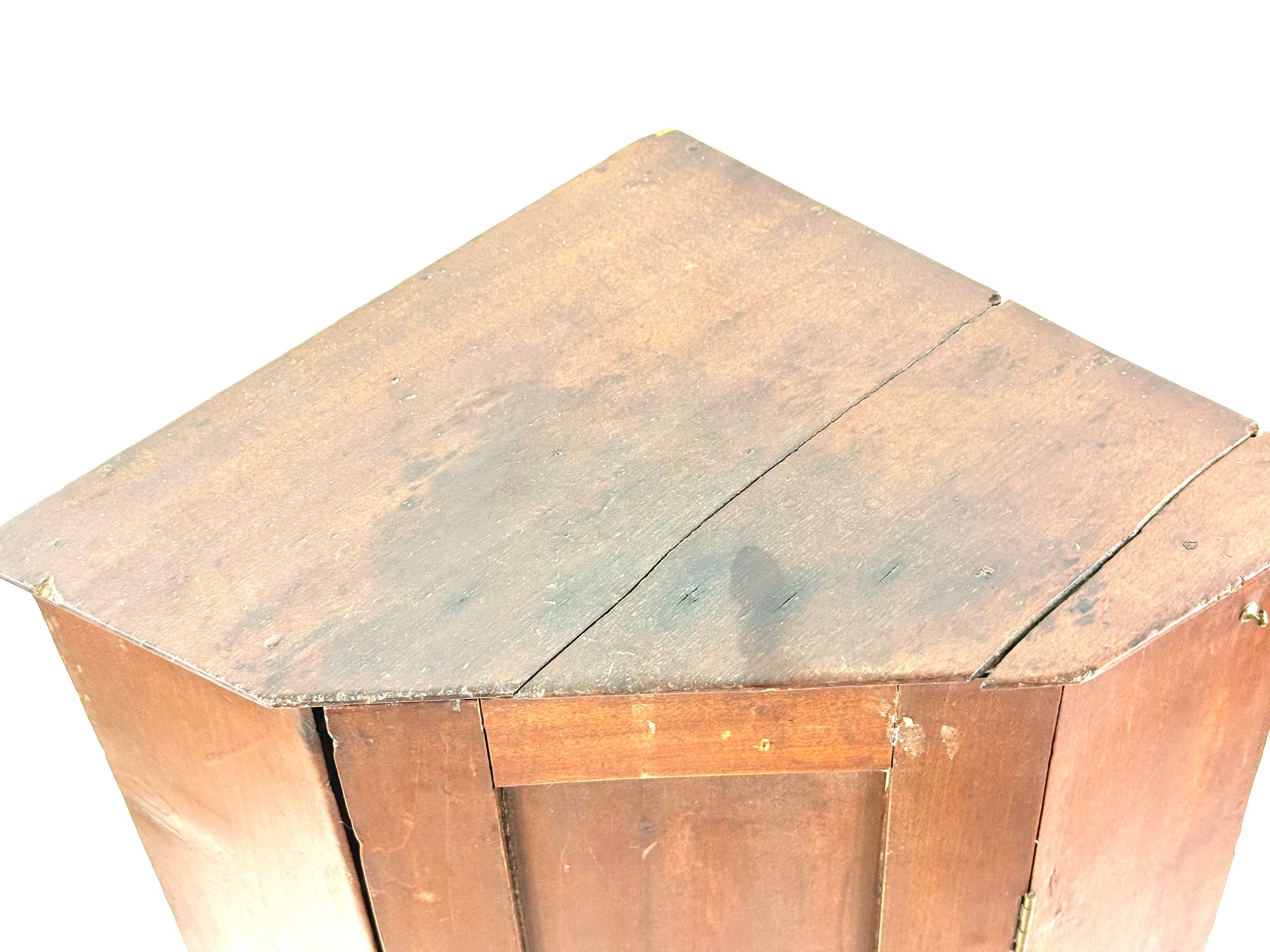 This antique cabinet sits on three turned legs. It is in old red with Square nails throughout. Please see photos.