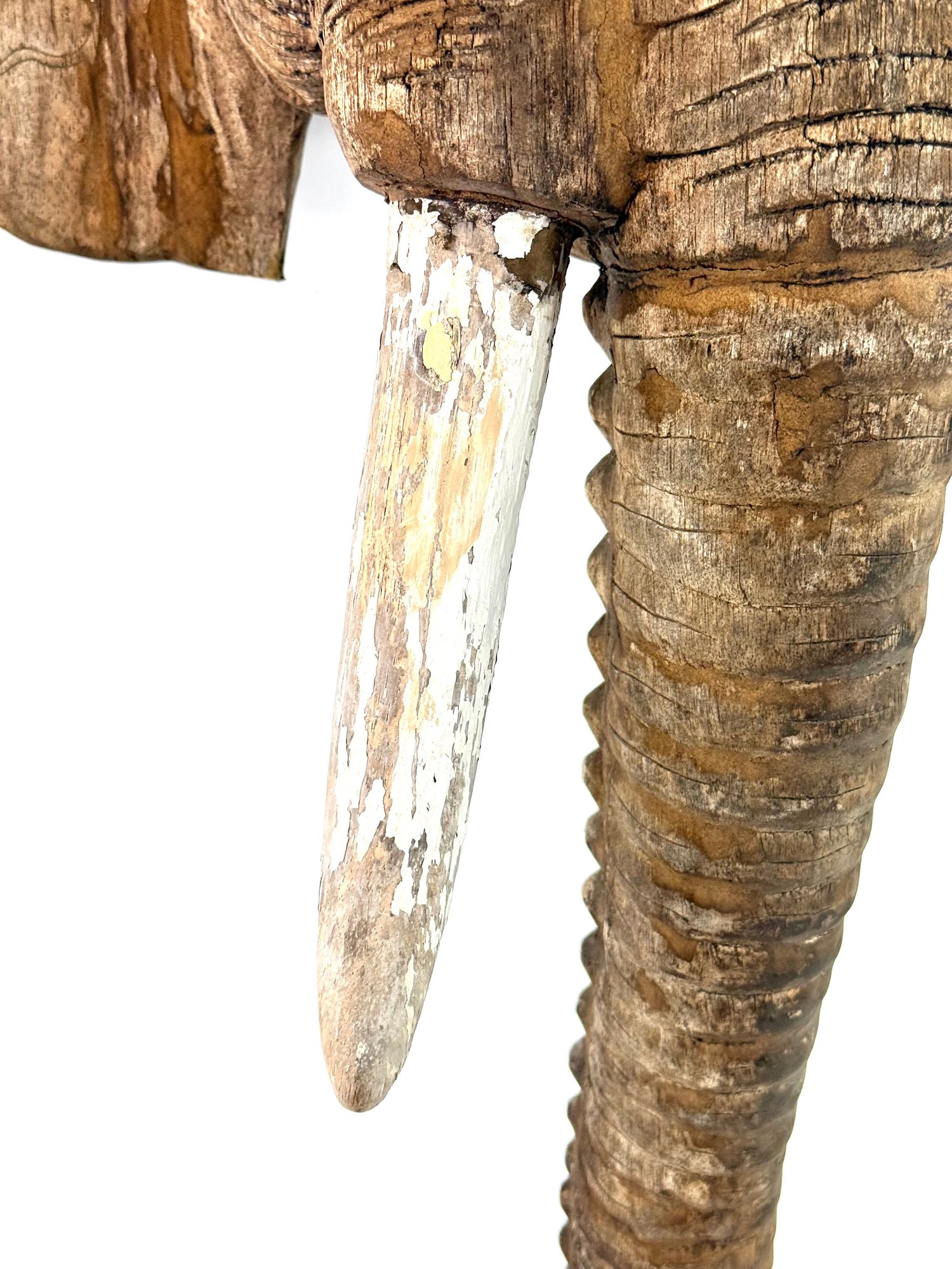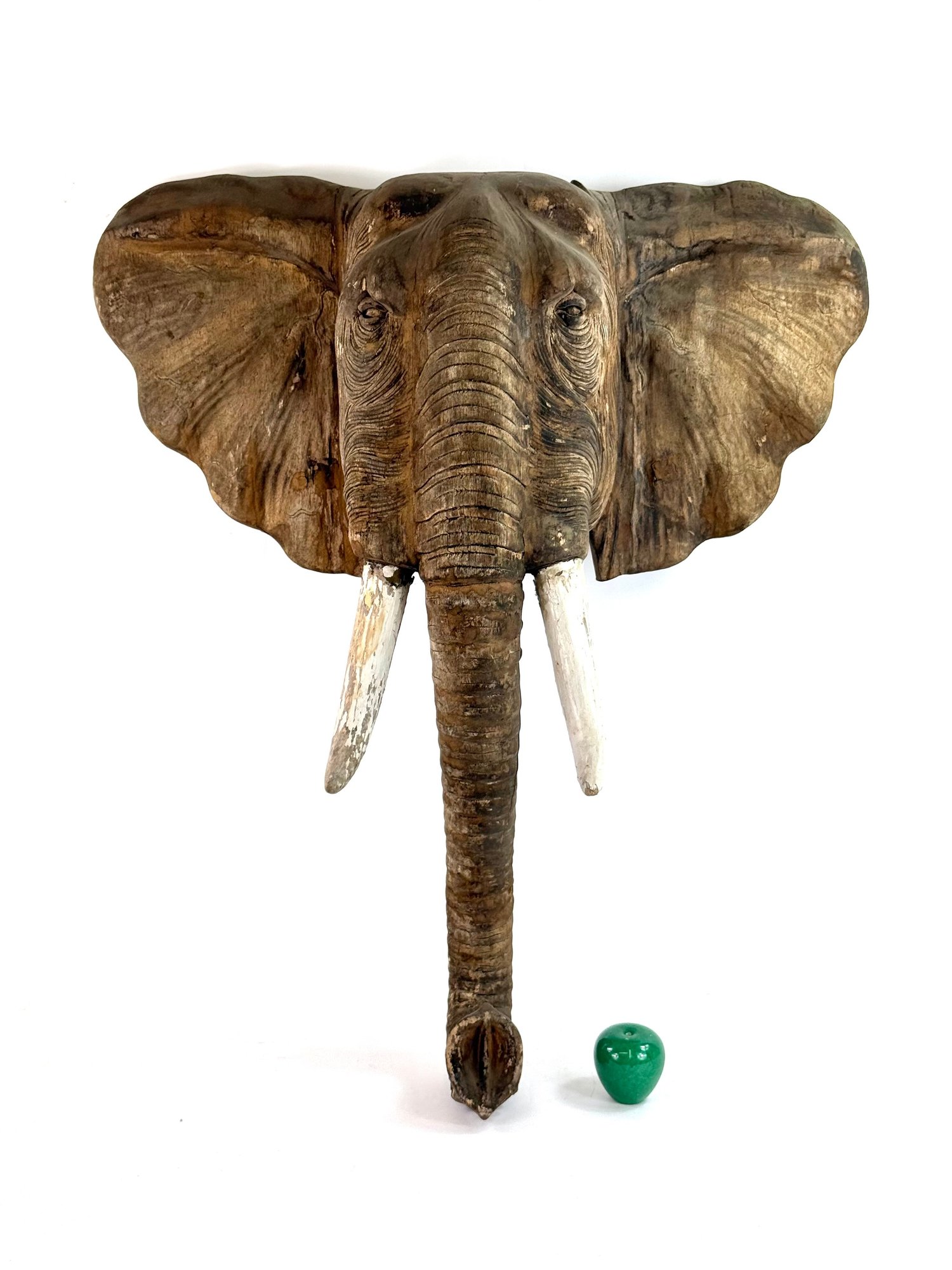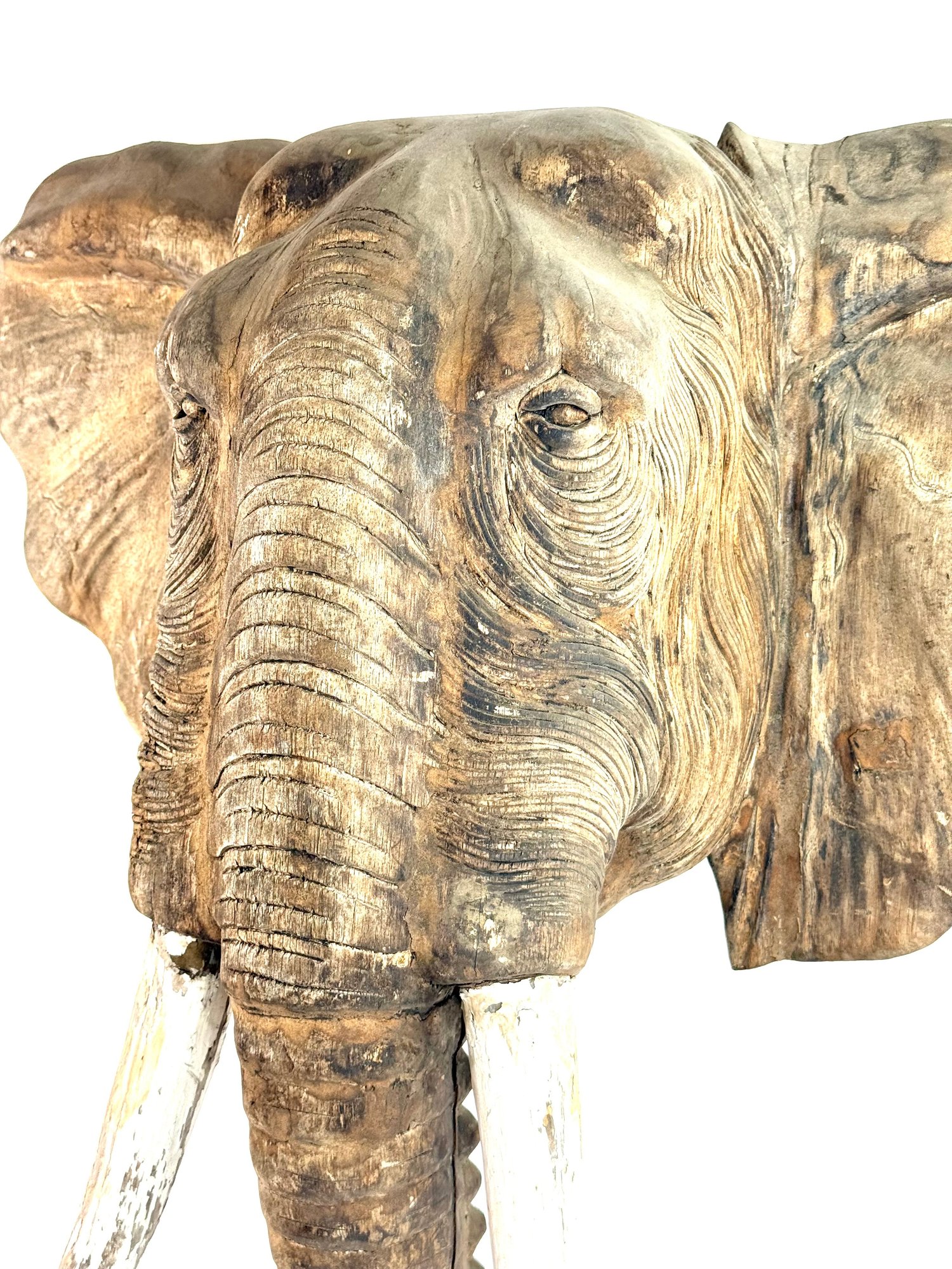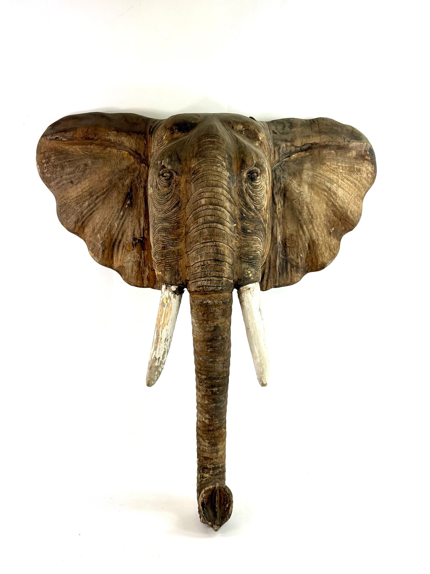 Realistically carved wooden elephant head with painted white tusk and looping trunk. Has great patina and some age please see photos..