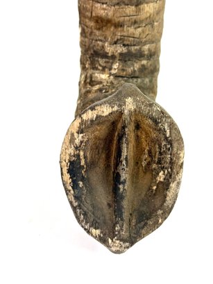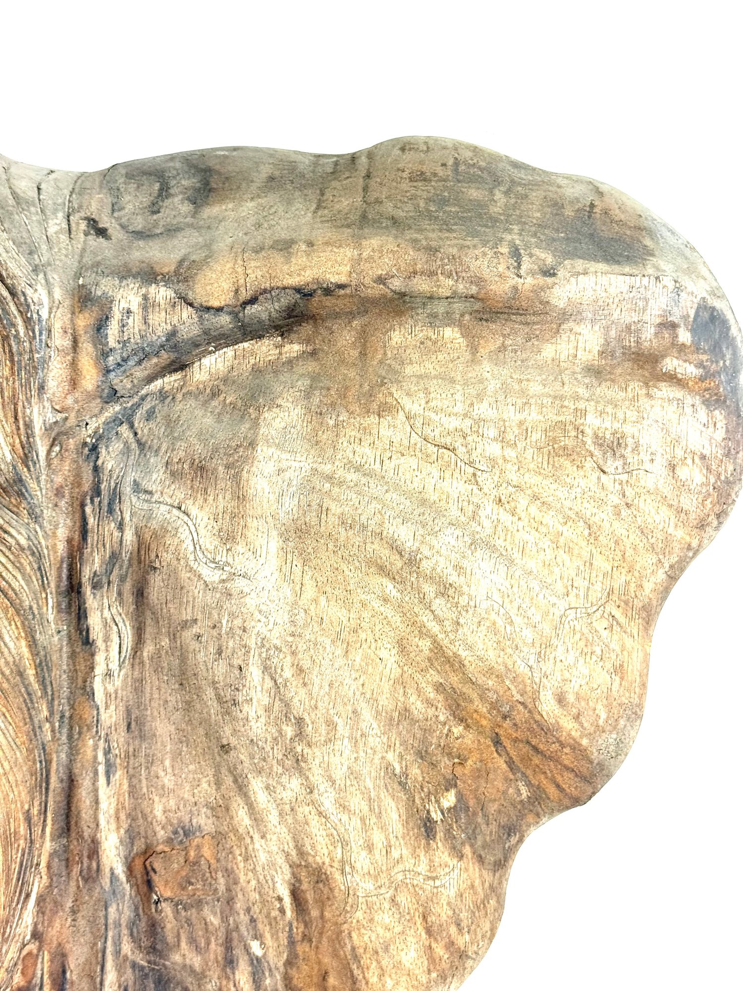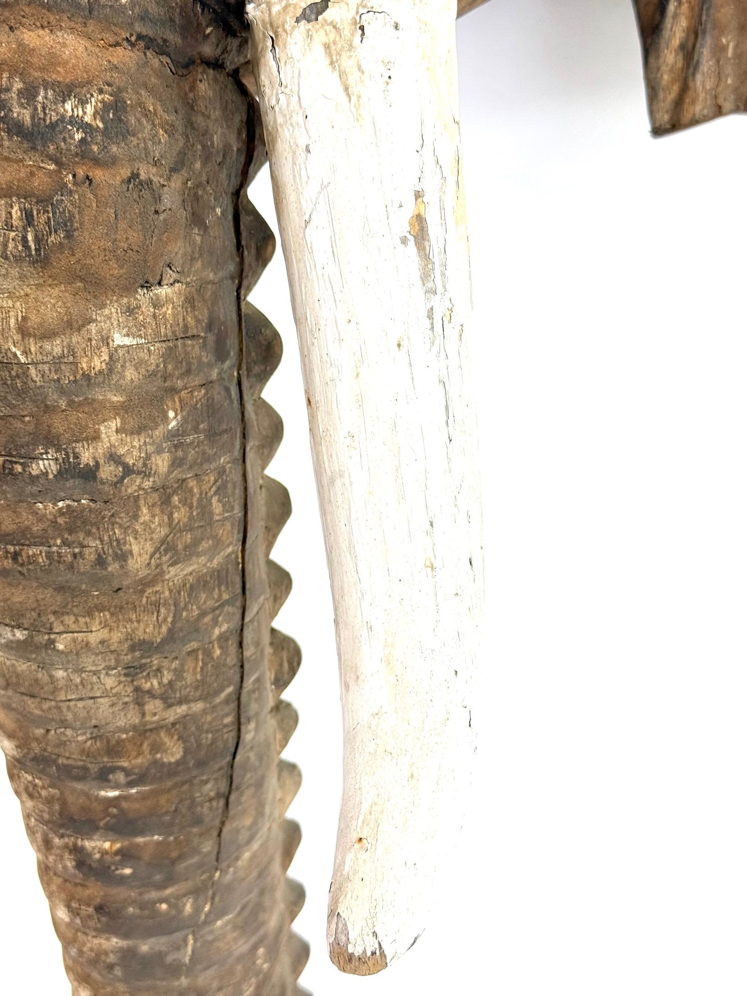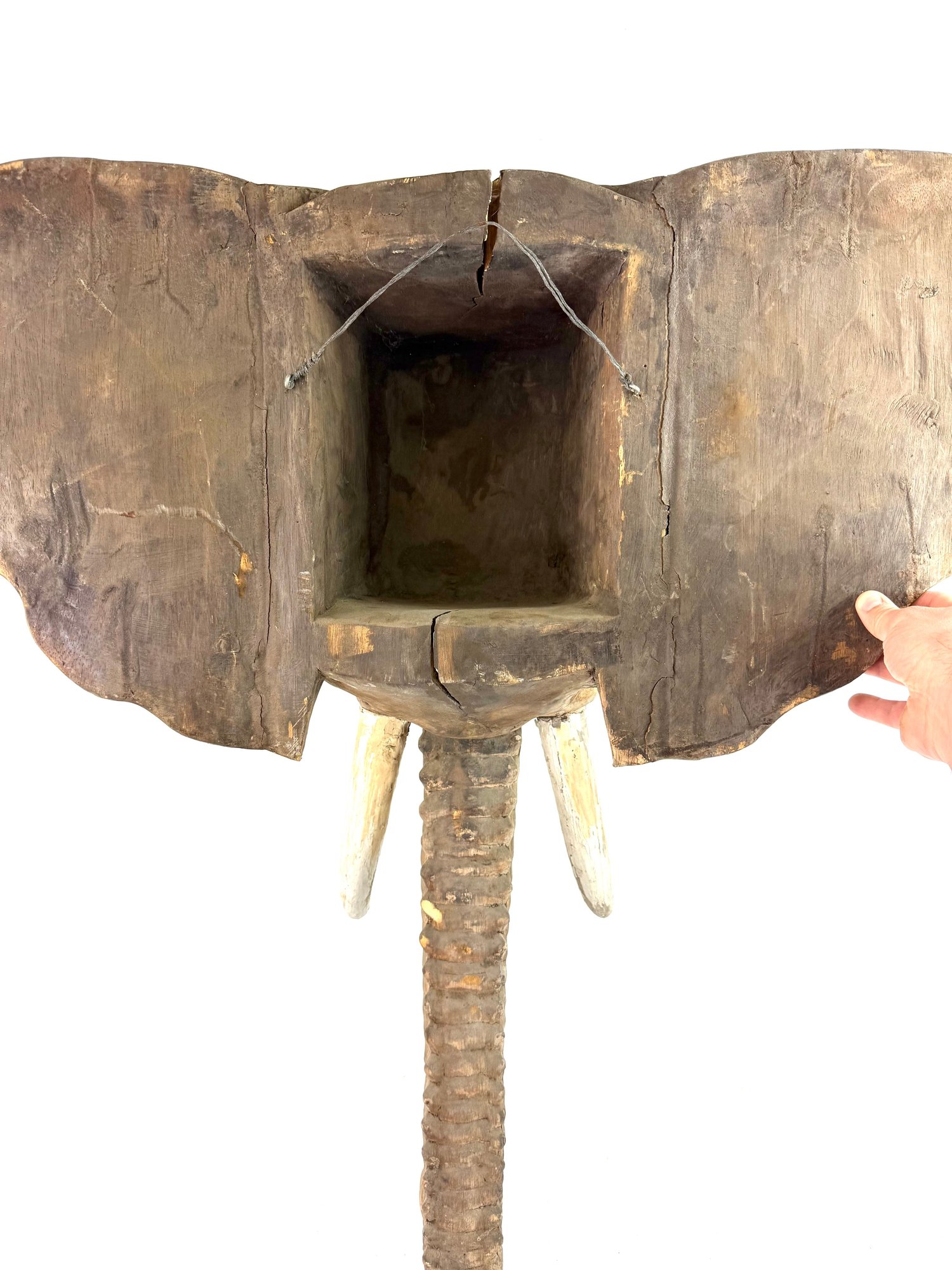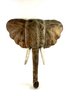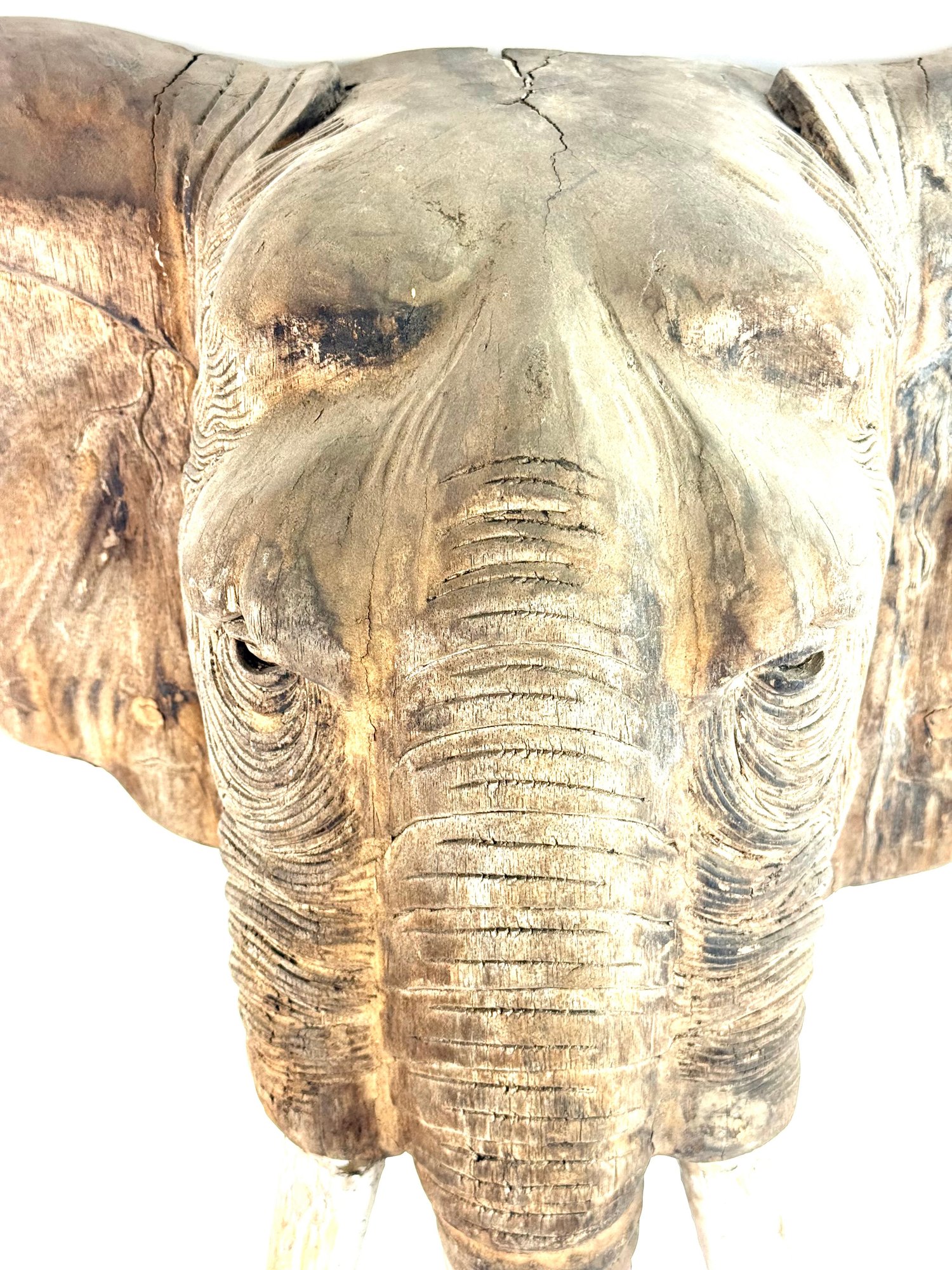Realistically carved wooden elephant head with painted white tusk and looping trunk. Has great patina and some age please see photos..