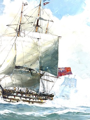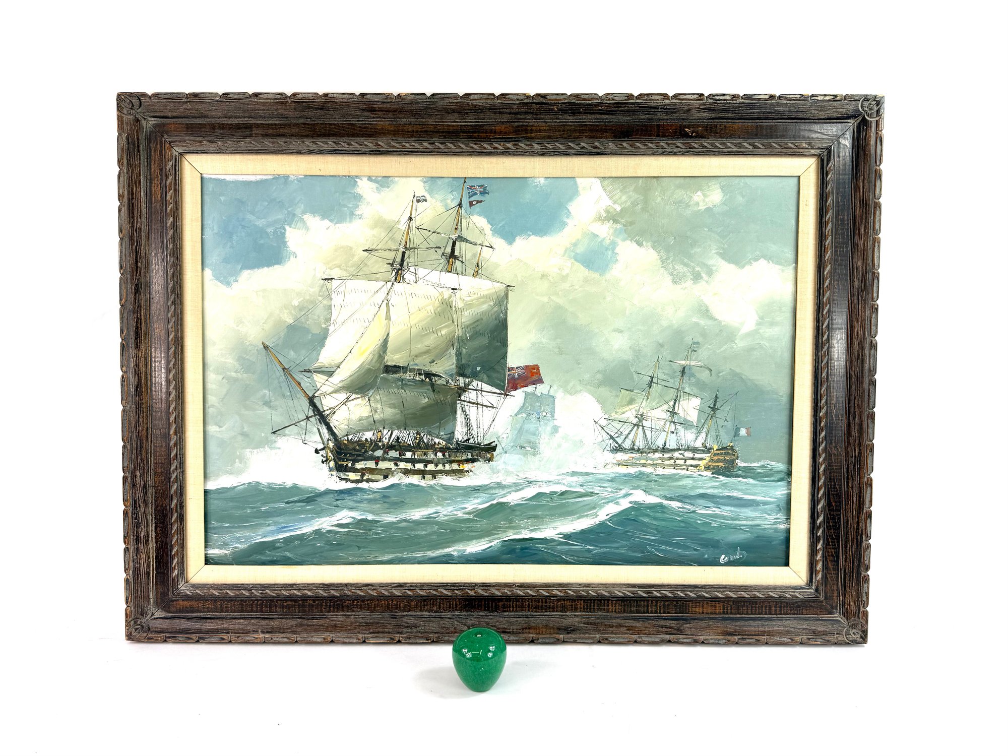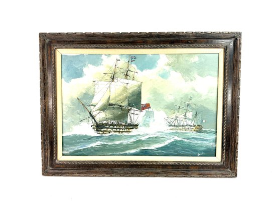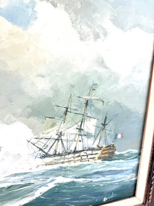 Signed in the bottom right corner this painting depicts three battleships one with a French flag and the other with the British flag.