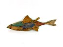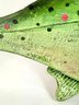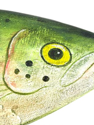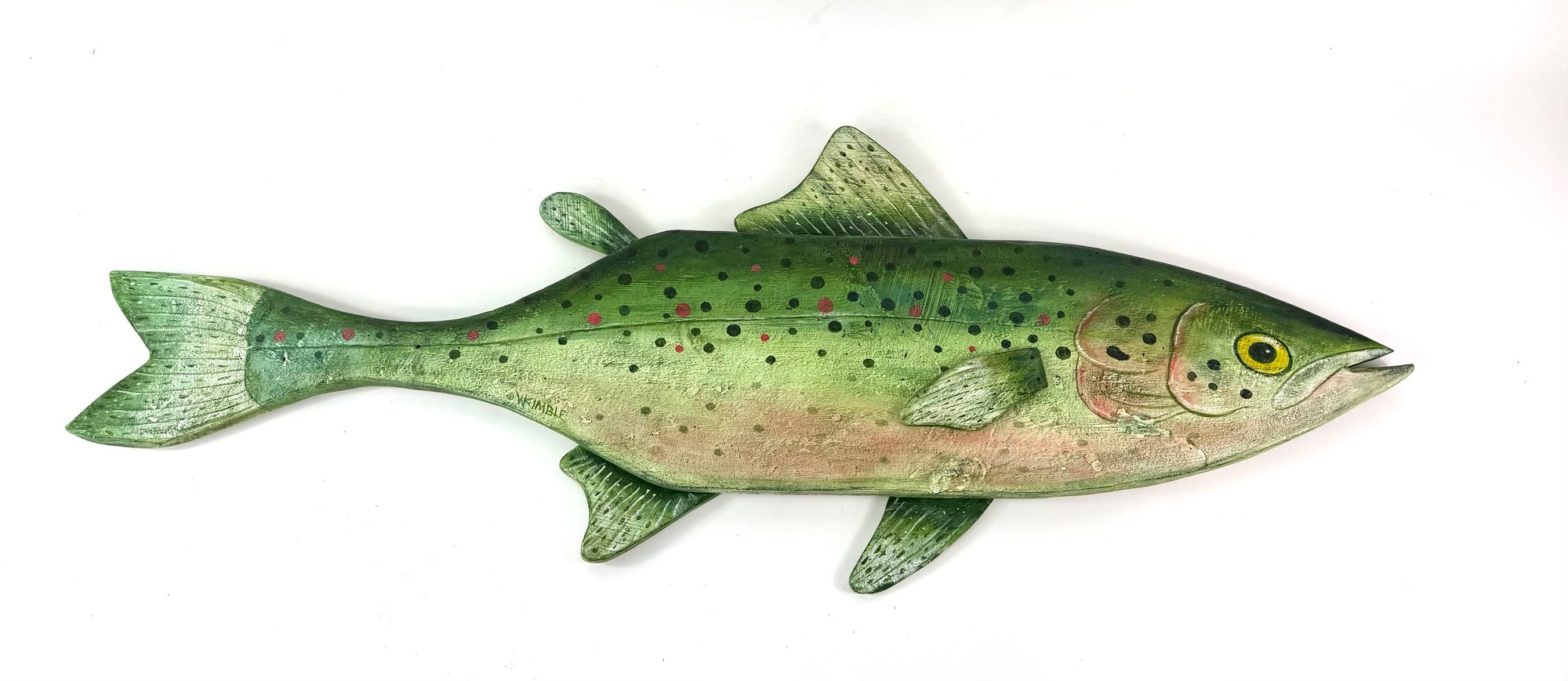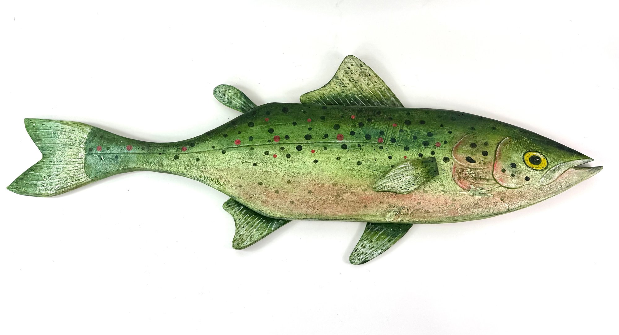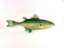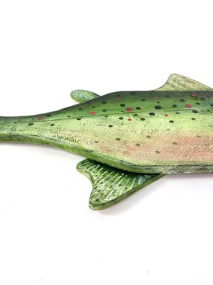 This impressive one of a kind large hand carved fish created and signed by the folk artist Warren Kimble. Depicting a rainbow trout it has bright colors with adjustable fins. Signed and dated on the back.