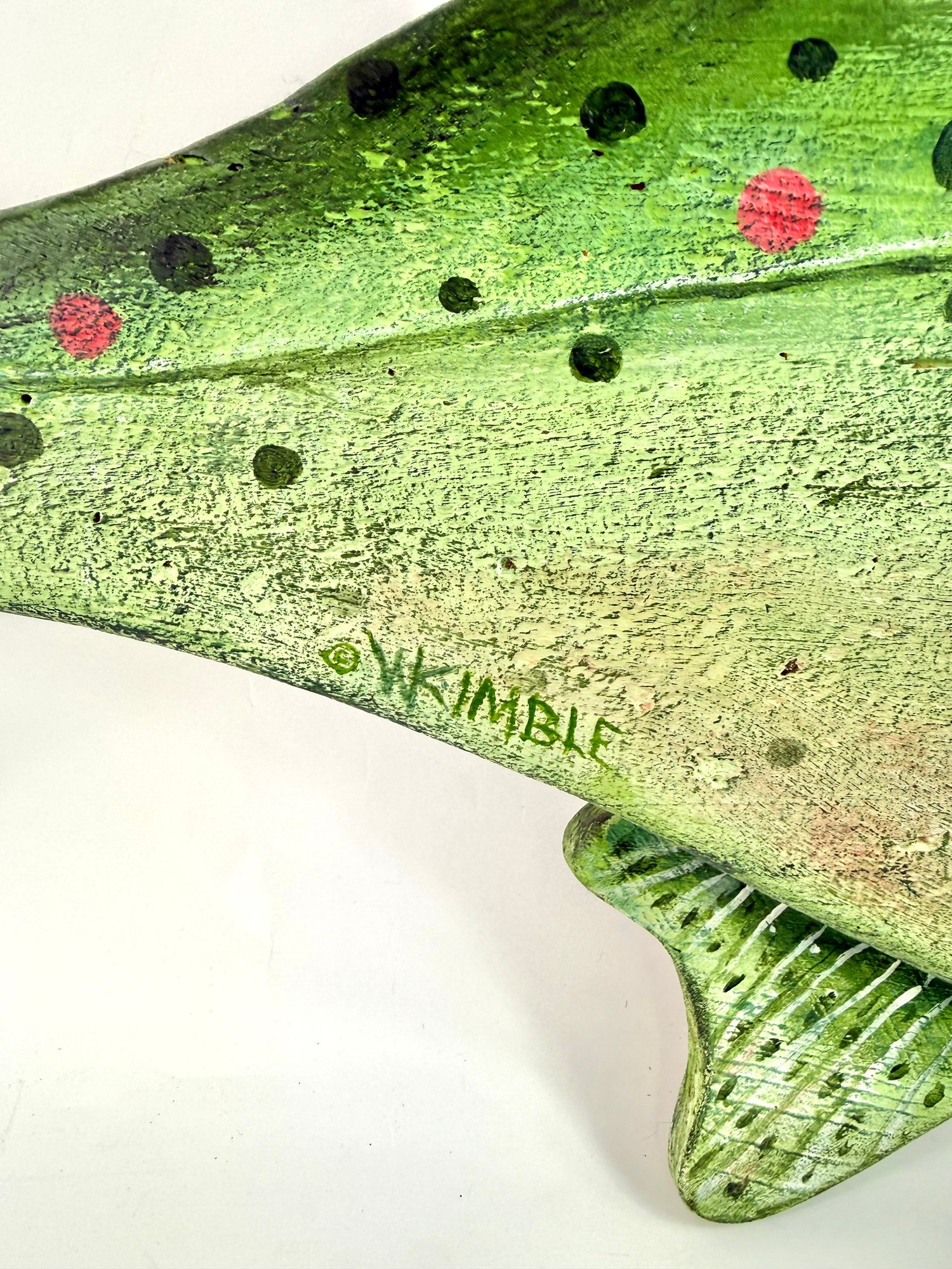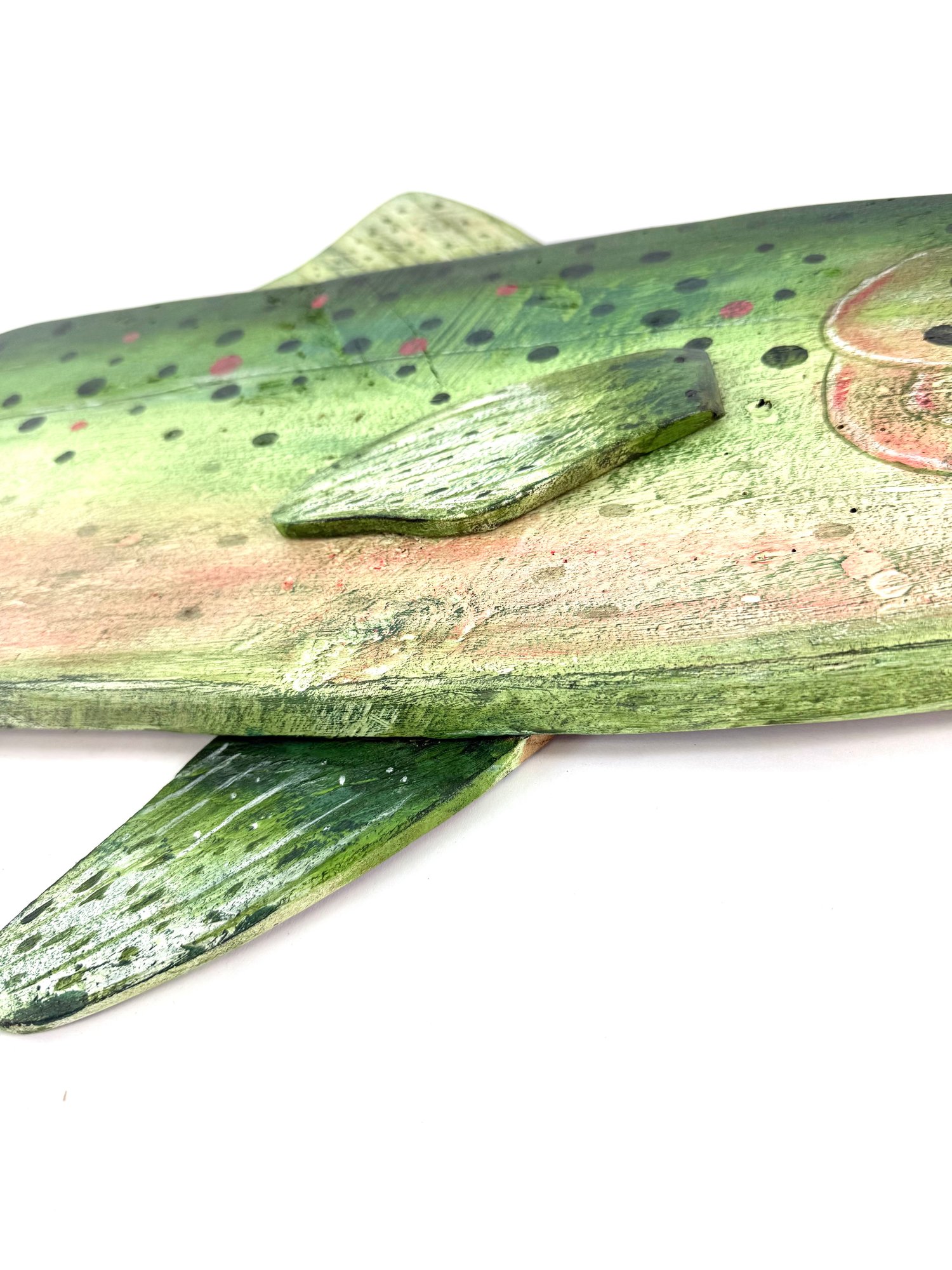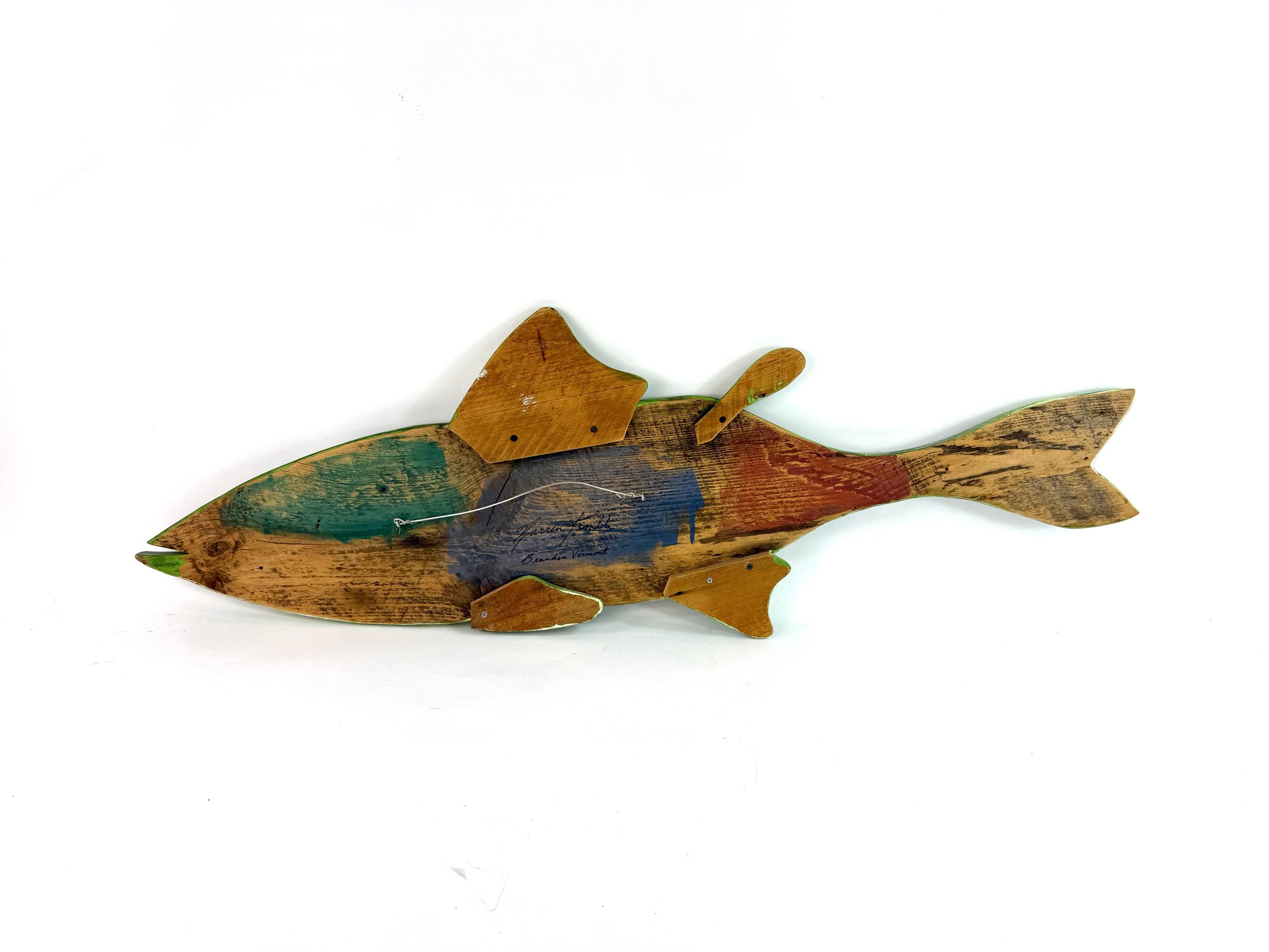 This impressive one of a kind large hand carved fish created and signed by the folk artist Warren Kimble. Depicting a rainbow trout it has bright colors with adjustable fins. Signed and dated on the back.