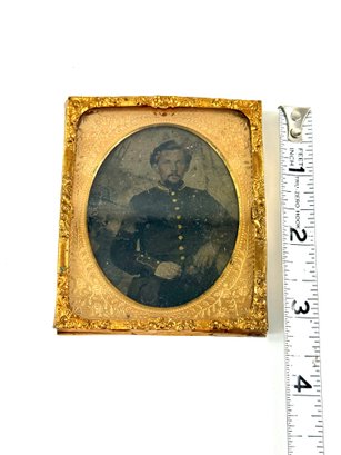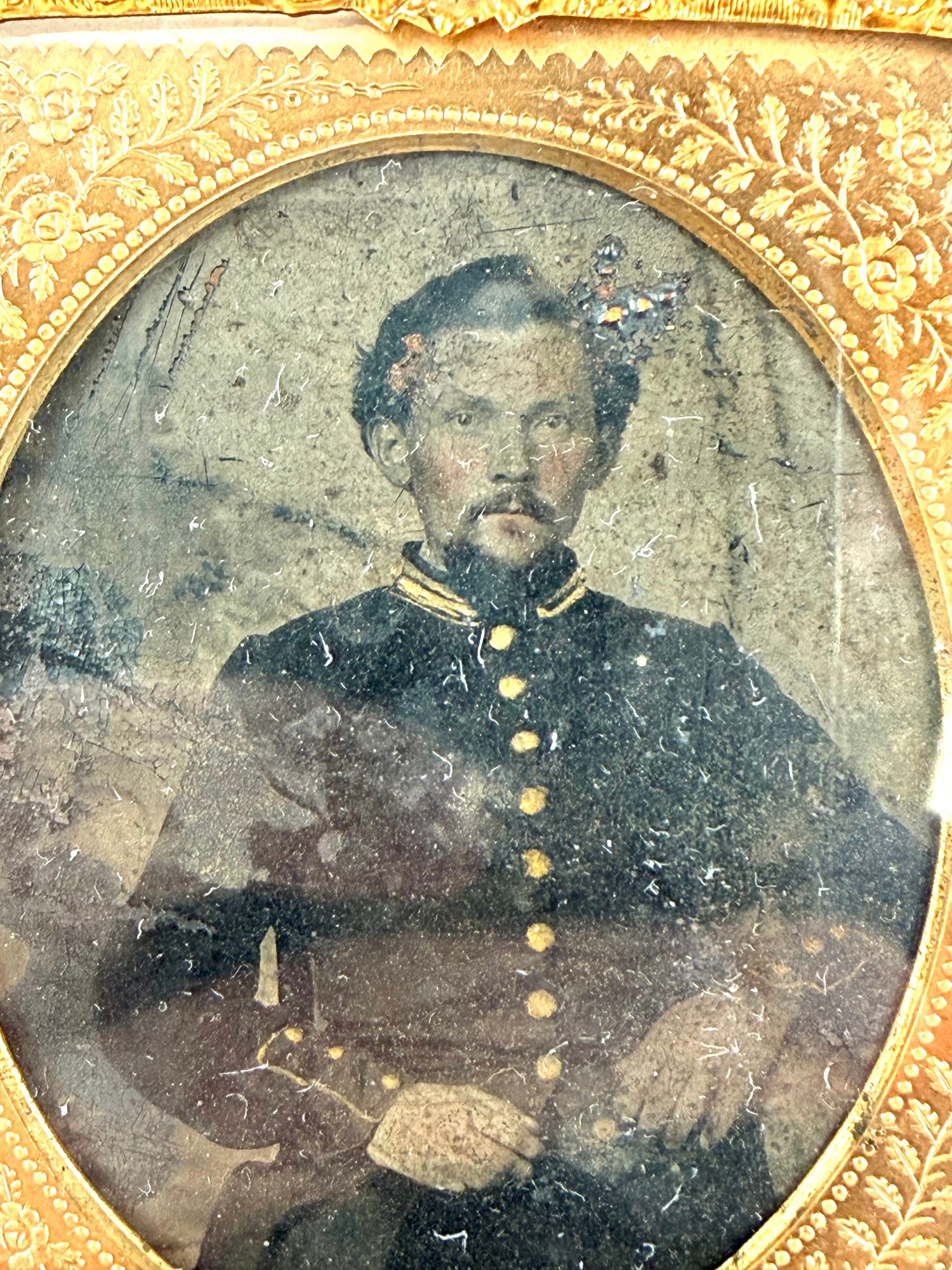 19th century photo has a gentleman posing with his decorated collar and three Button sleeve.
