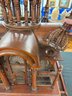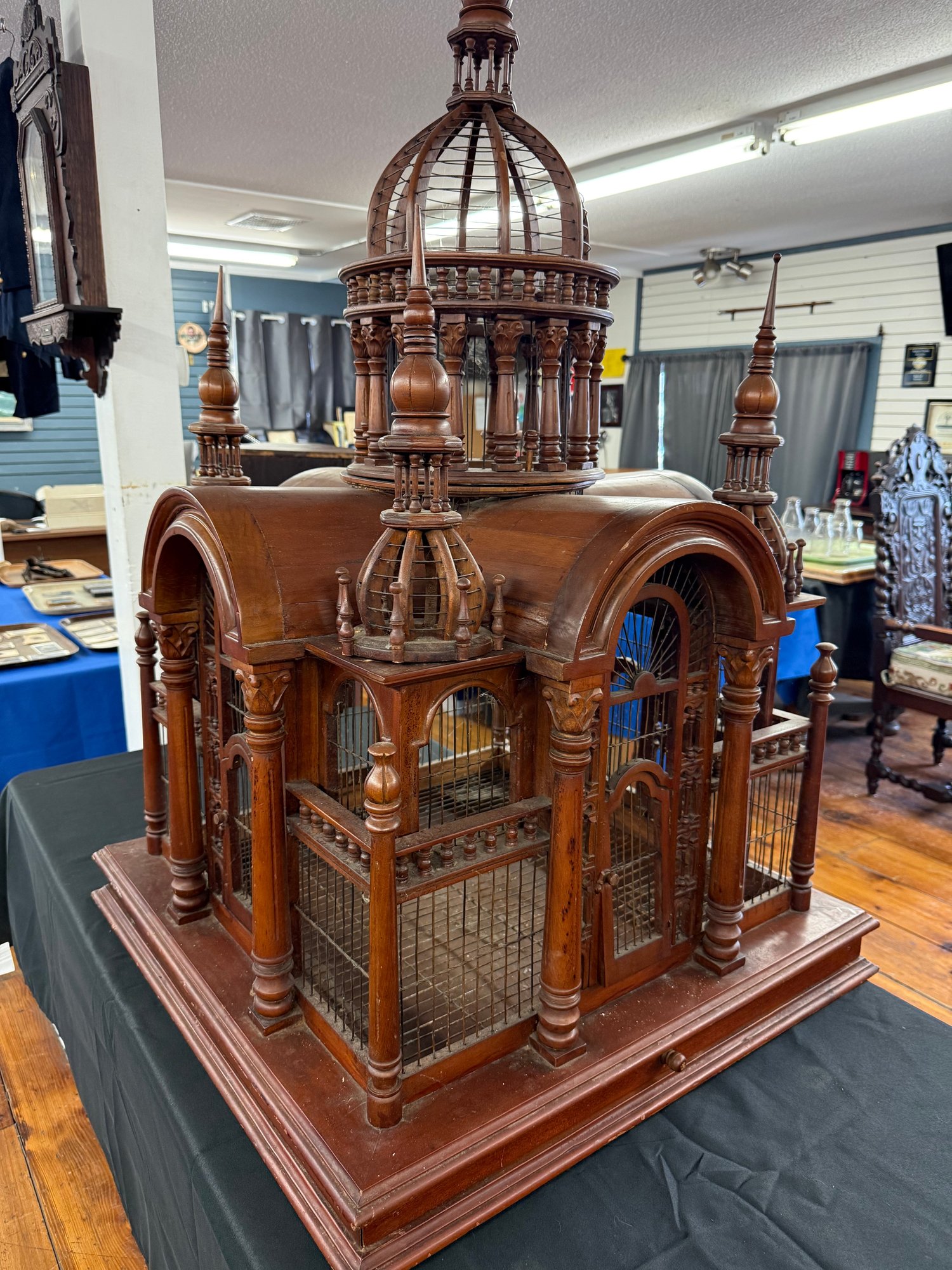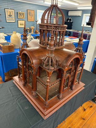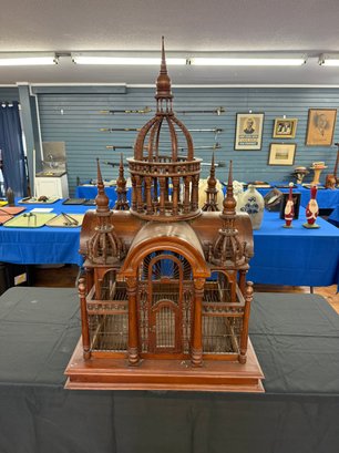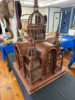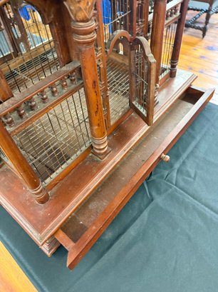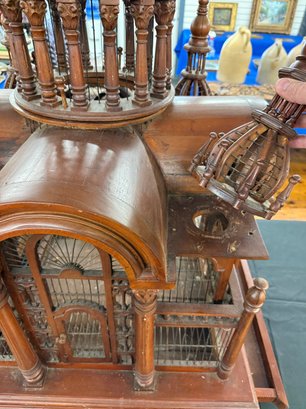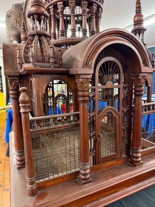 This Arabian looking five tower wooden birdcage has wooden arches above doors, surrounded with cage and carvings. It sits on a square base with sliding tray.