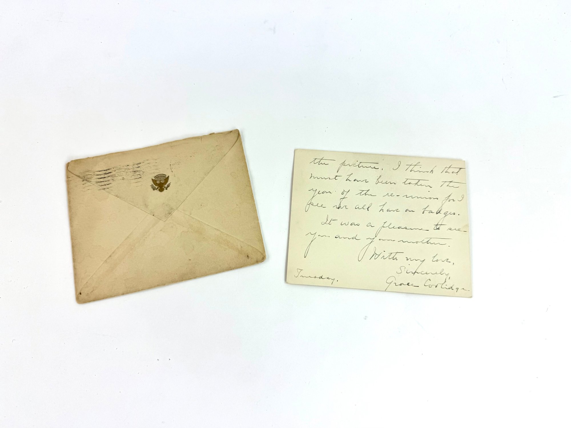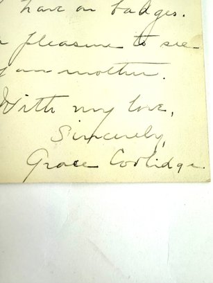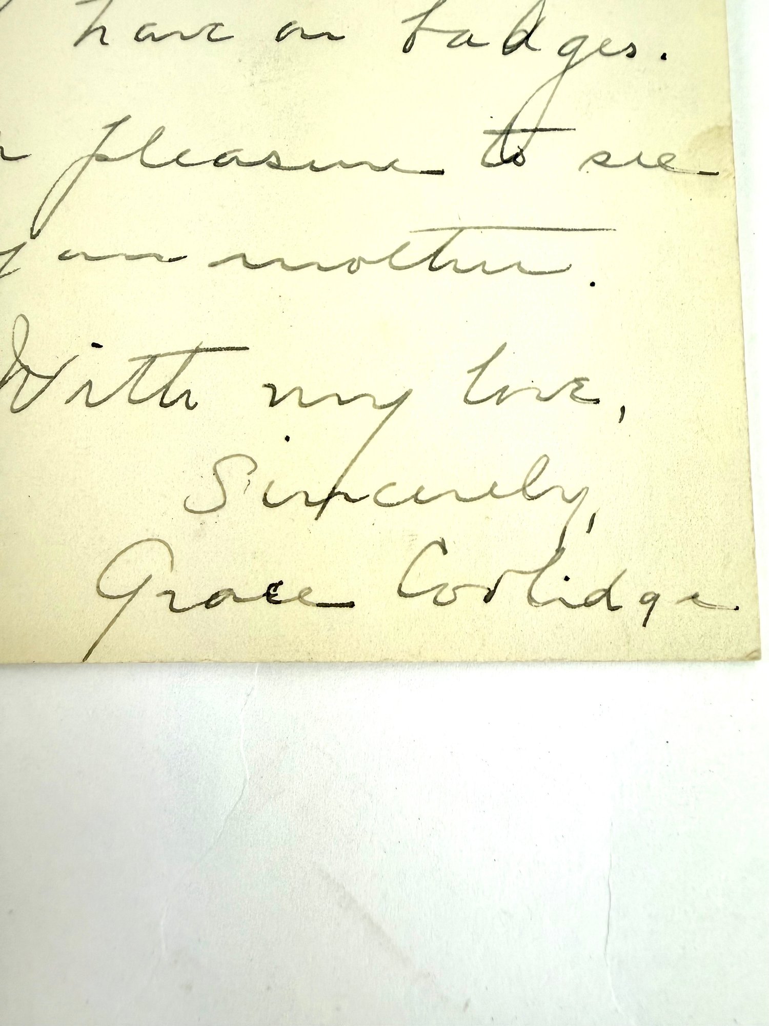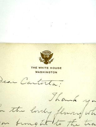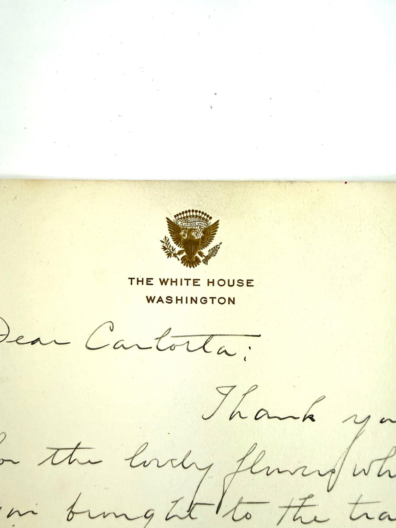 In this letter grace is thanking someone the for the flowers, Someone had brought to the train in 1926 signed in the bottom right corner Grace Coolidge.