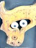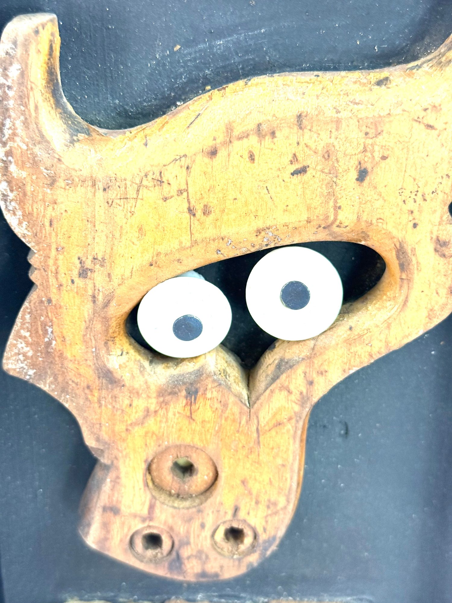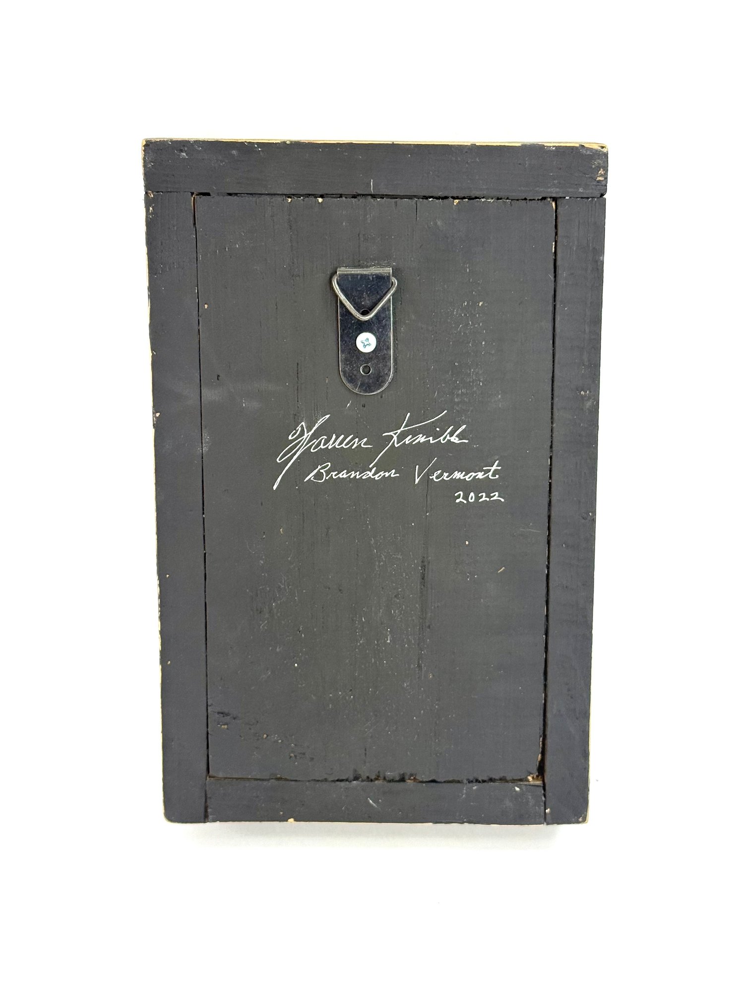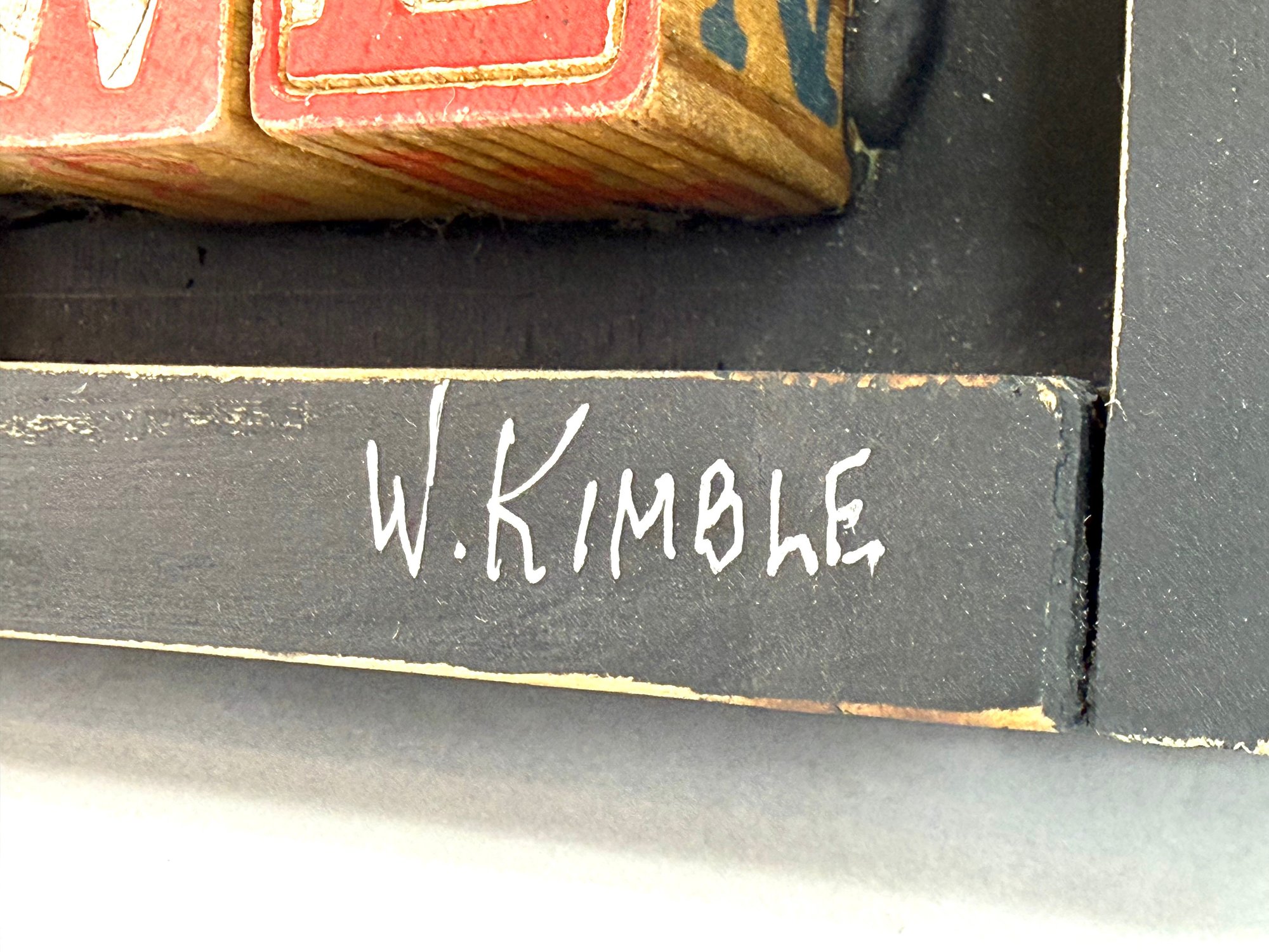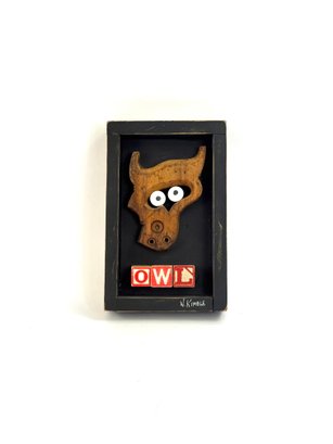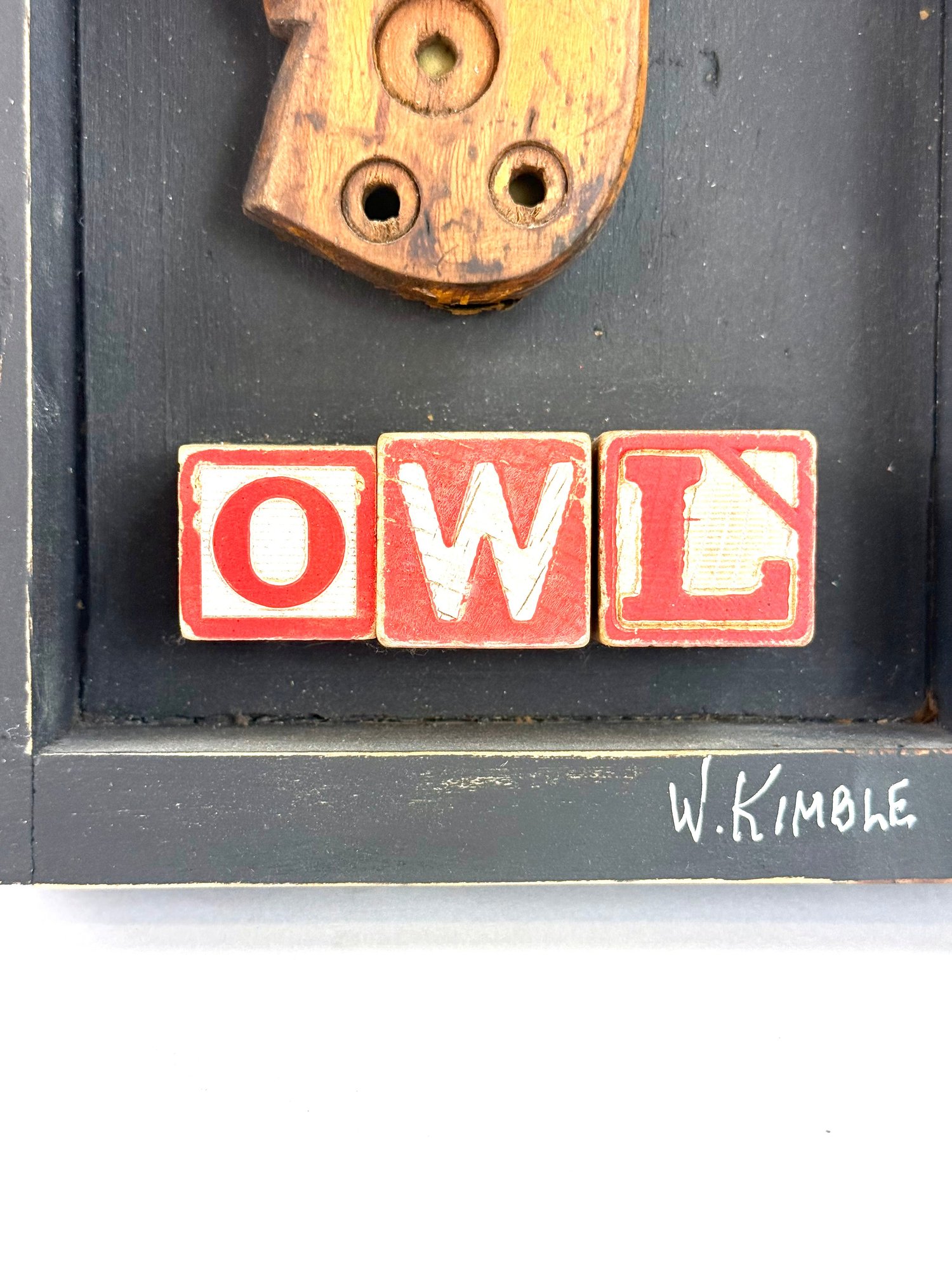 This hand made shadowbox sculpture depicting an owl’s face made of objects. The word owl using antique kids letter blocks. Signed in the bottom right corner and on the back Warren Kimble Brandon Vermont 2022.