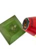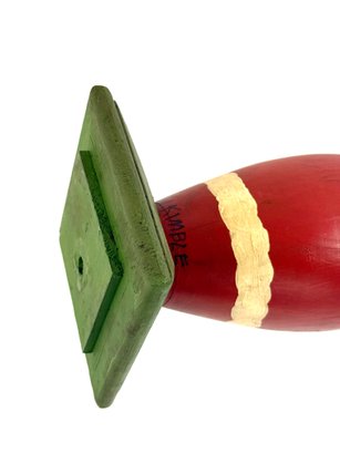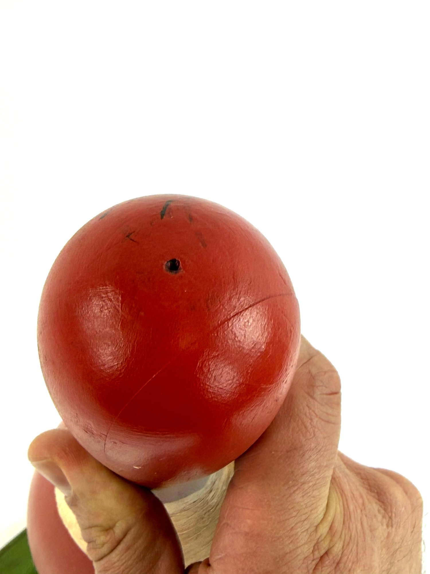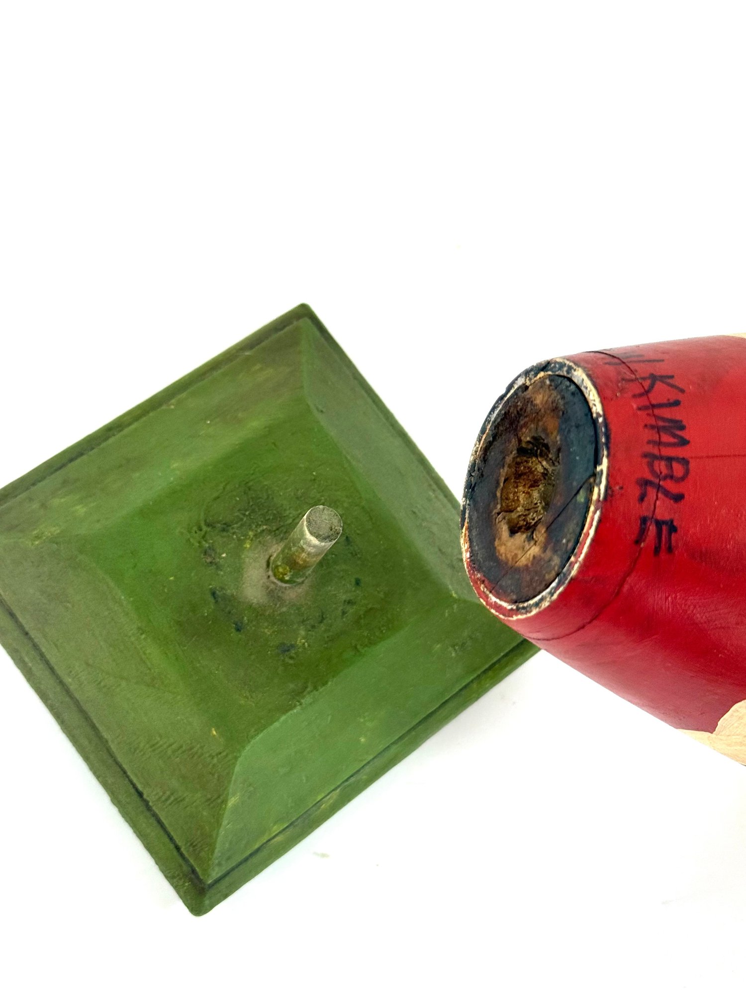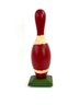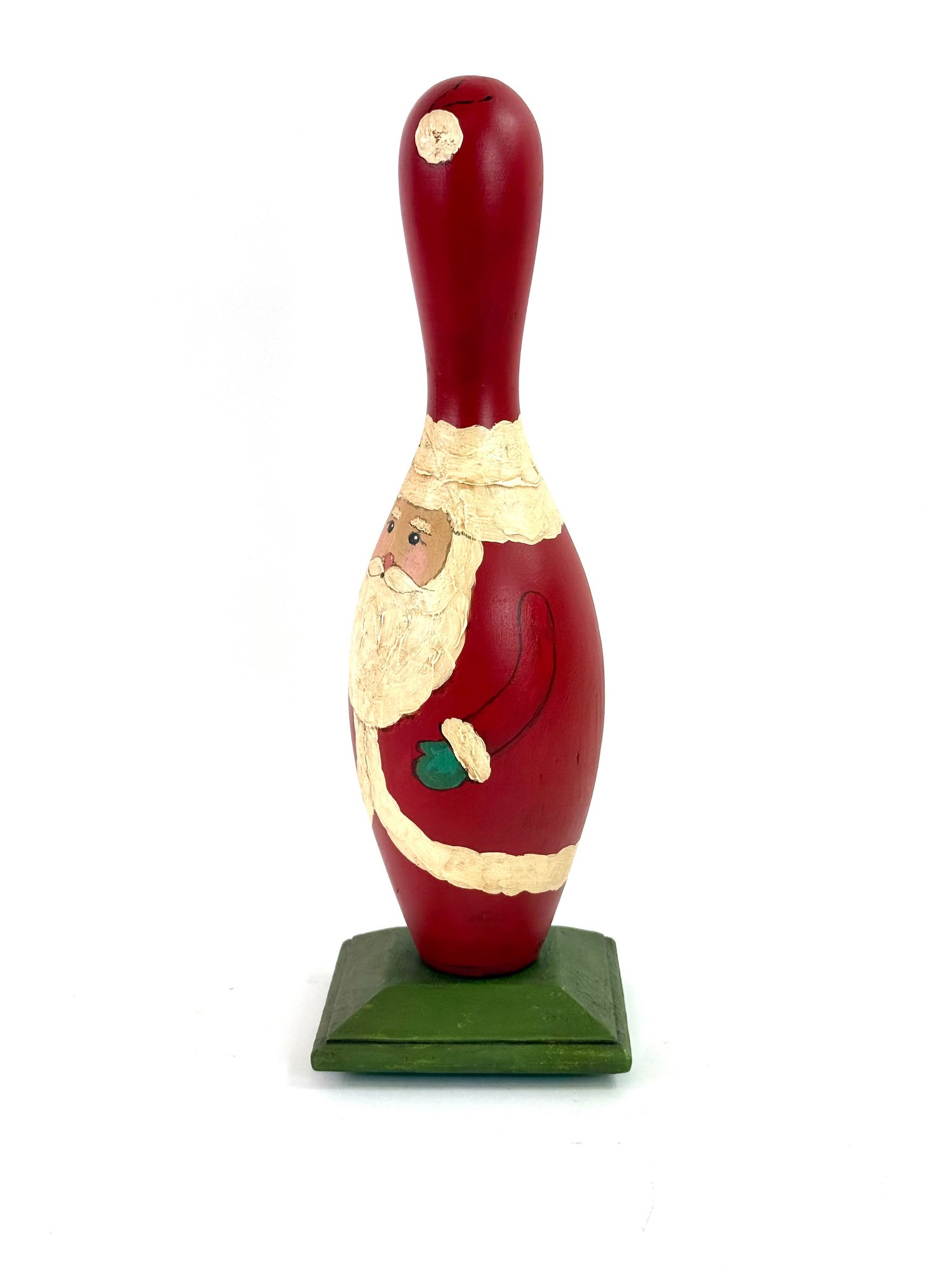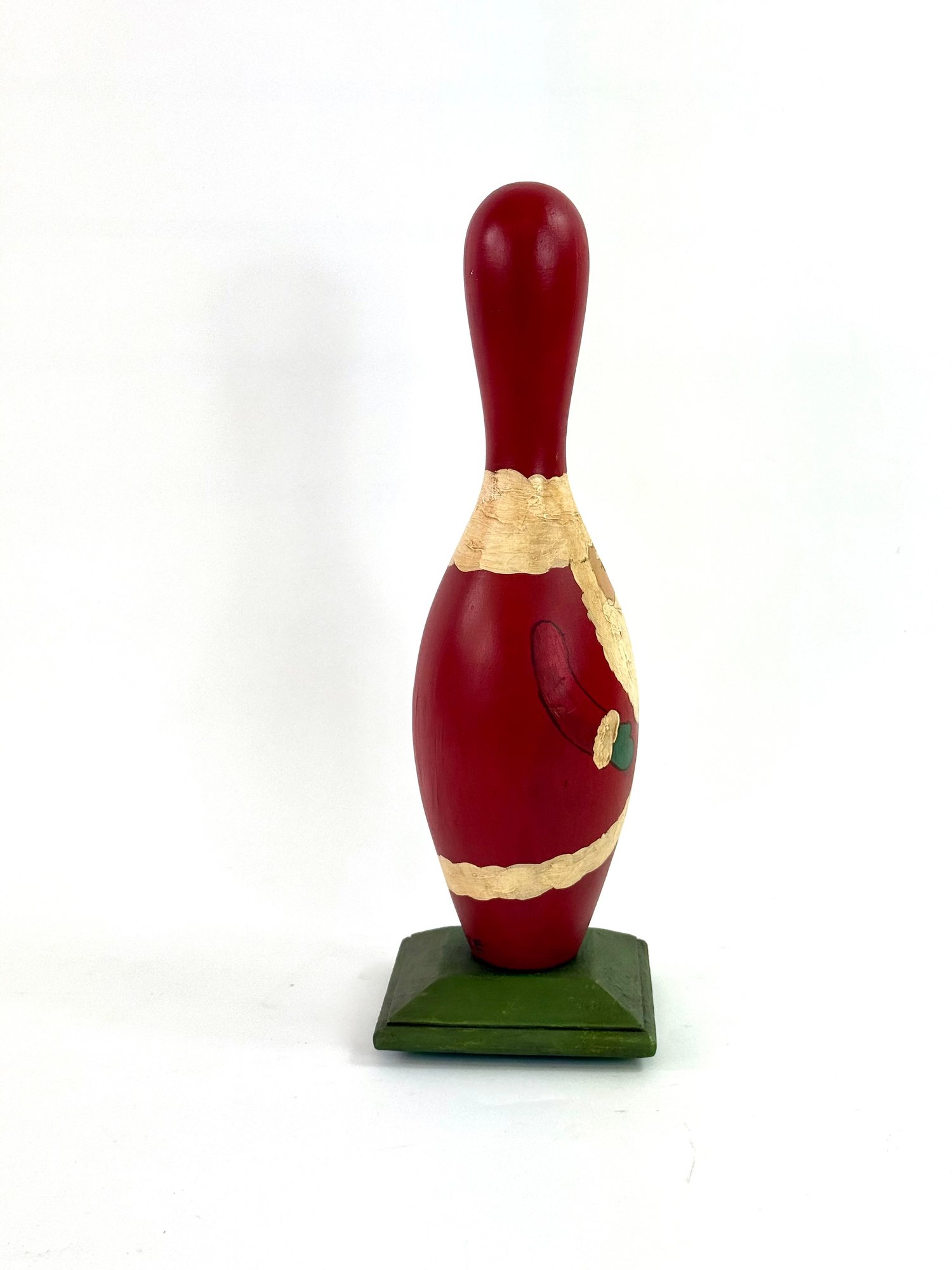 Warren hand painted this old bowling pin with Christmas in mind! In a nice dark red paint with Santa wearing green gloves. It sits on custom green painted round wooden base.