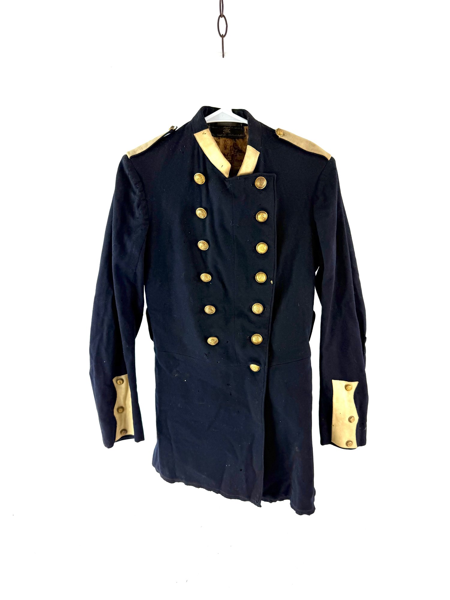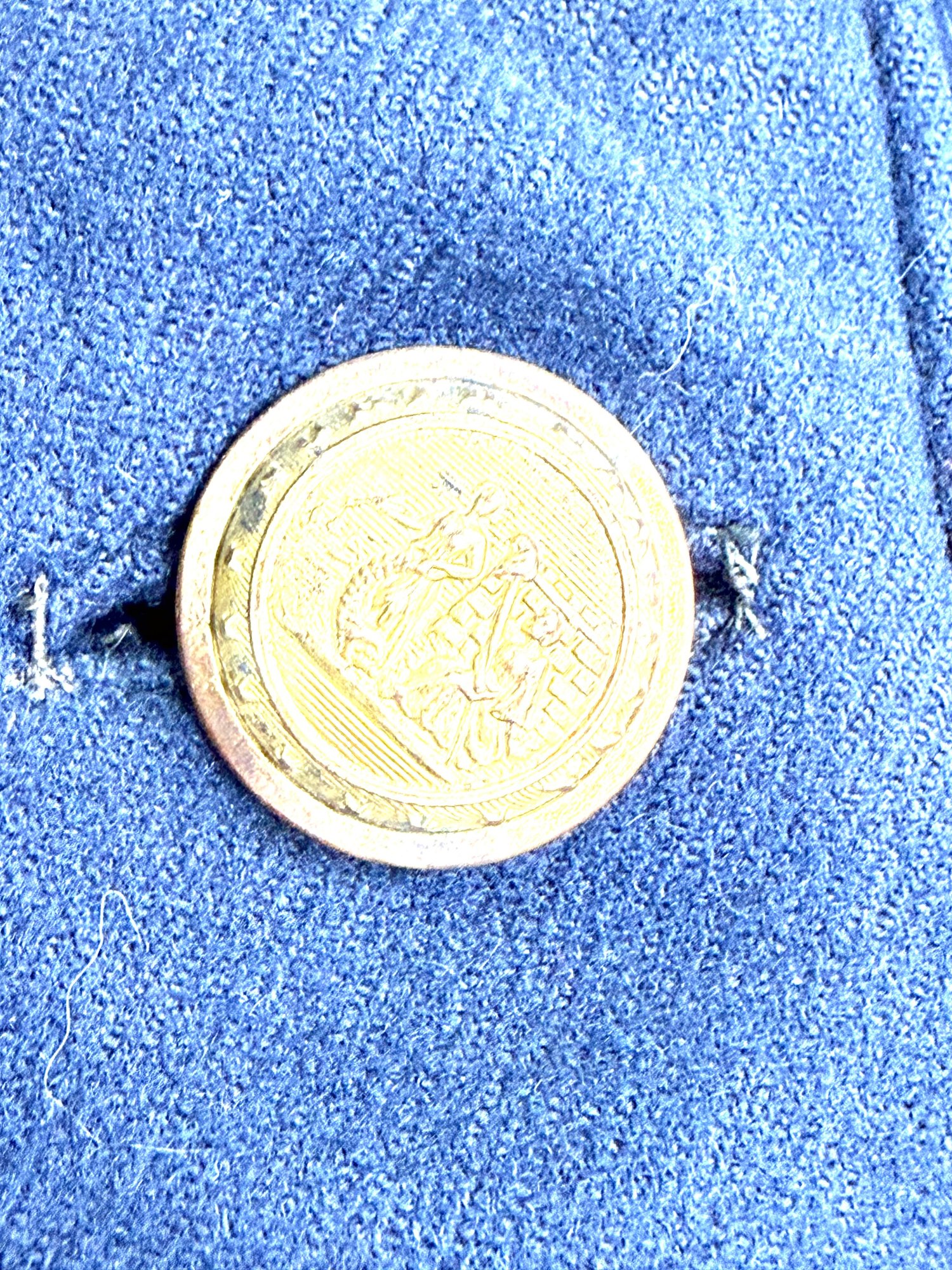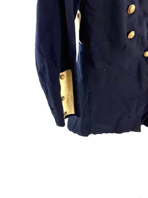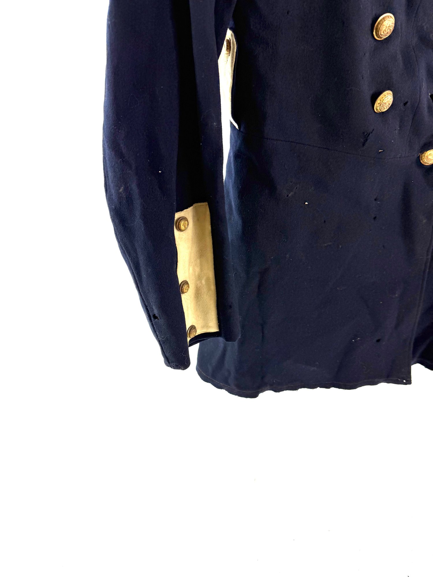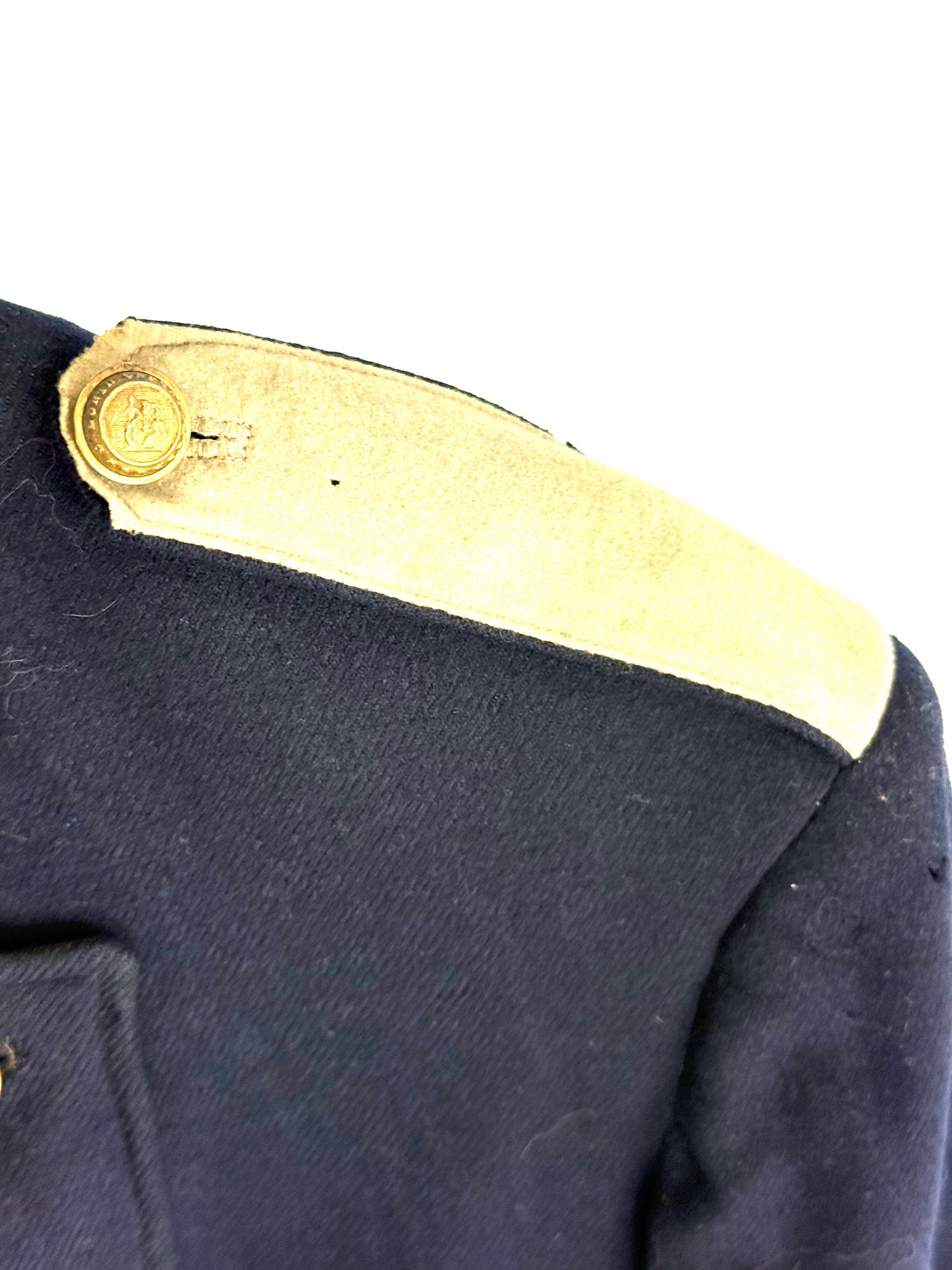 This jacket has white shoulder straps, collar and sleeve accents. North Carolina buttons with a Philadelphia label. Please see photos for condition.