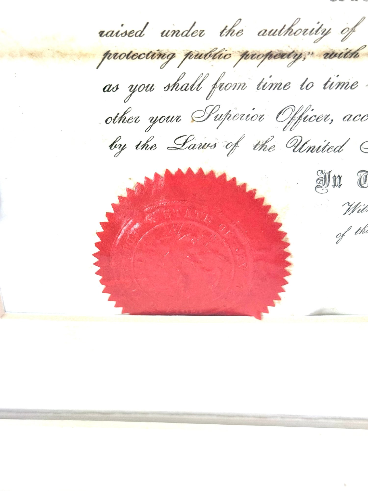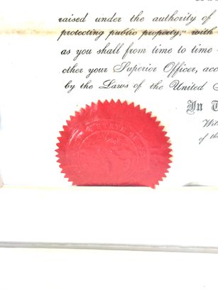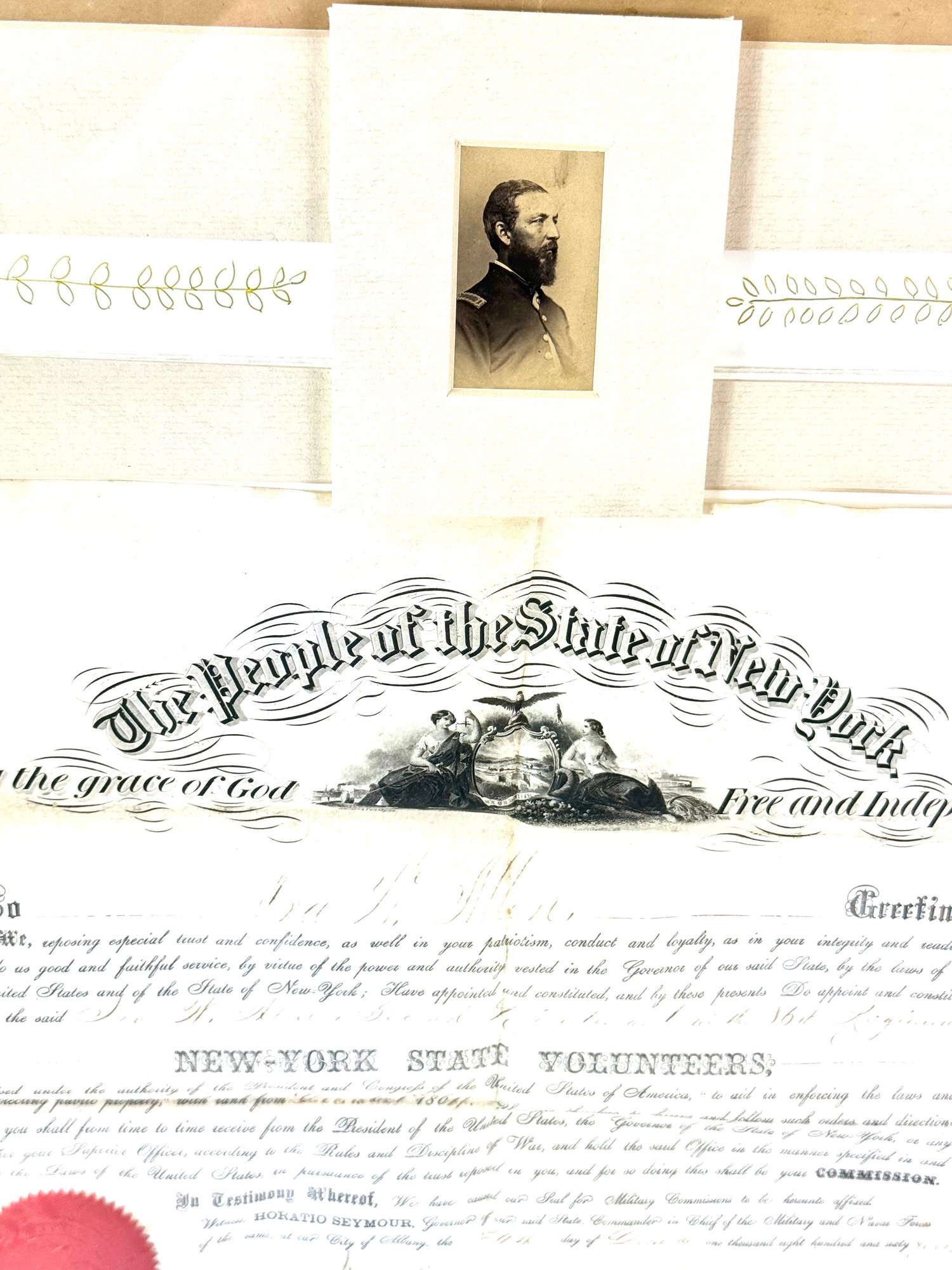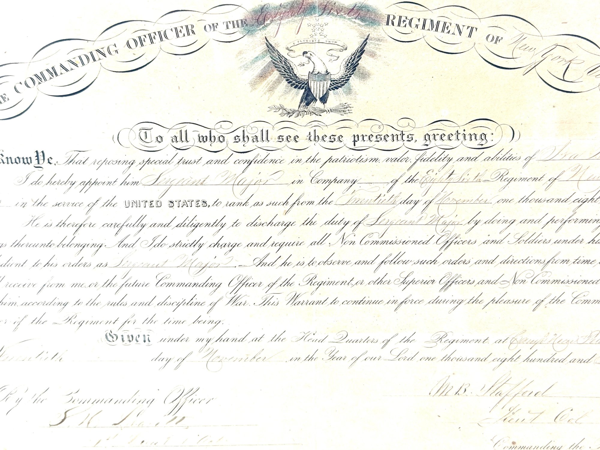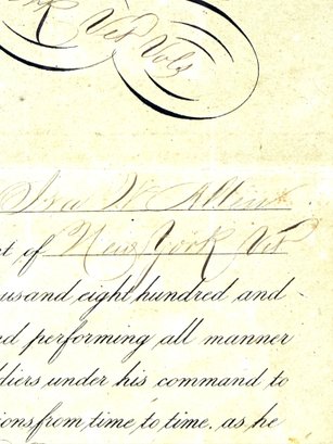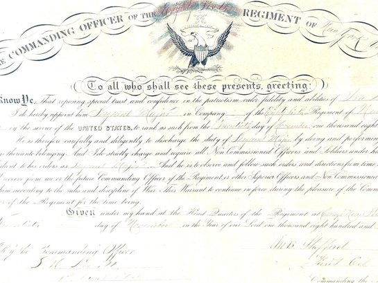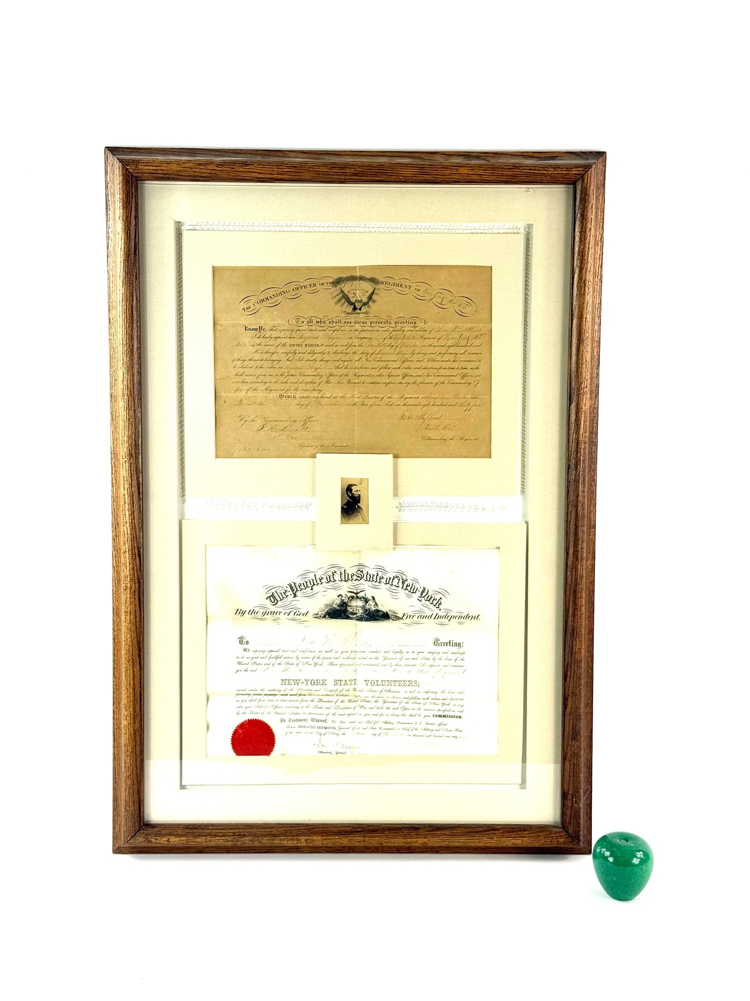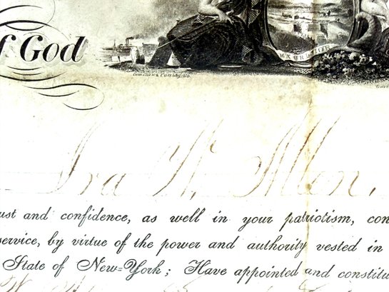Nicely framed Civil War peace displays Ira H Allen from the New York State volunteers a Civil War ranking member. These are two documentations one certificate and a commanding officer 86 new volunteers paper appointing Allen to Sergeant Major. Photo shows Allen with his shoulder strap ranks.