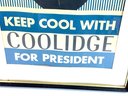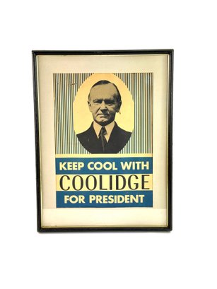 Made of a cardboard/paper this blue, black and white campaign poster was meant to be put up on the side of every grocery store and Town hall. Depicting Calvin Coolidge face with the Democratic blue stripes and background.. Please see photos for condition.