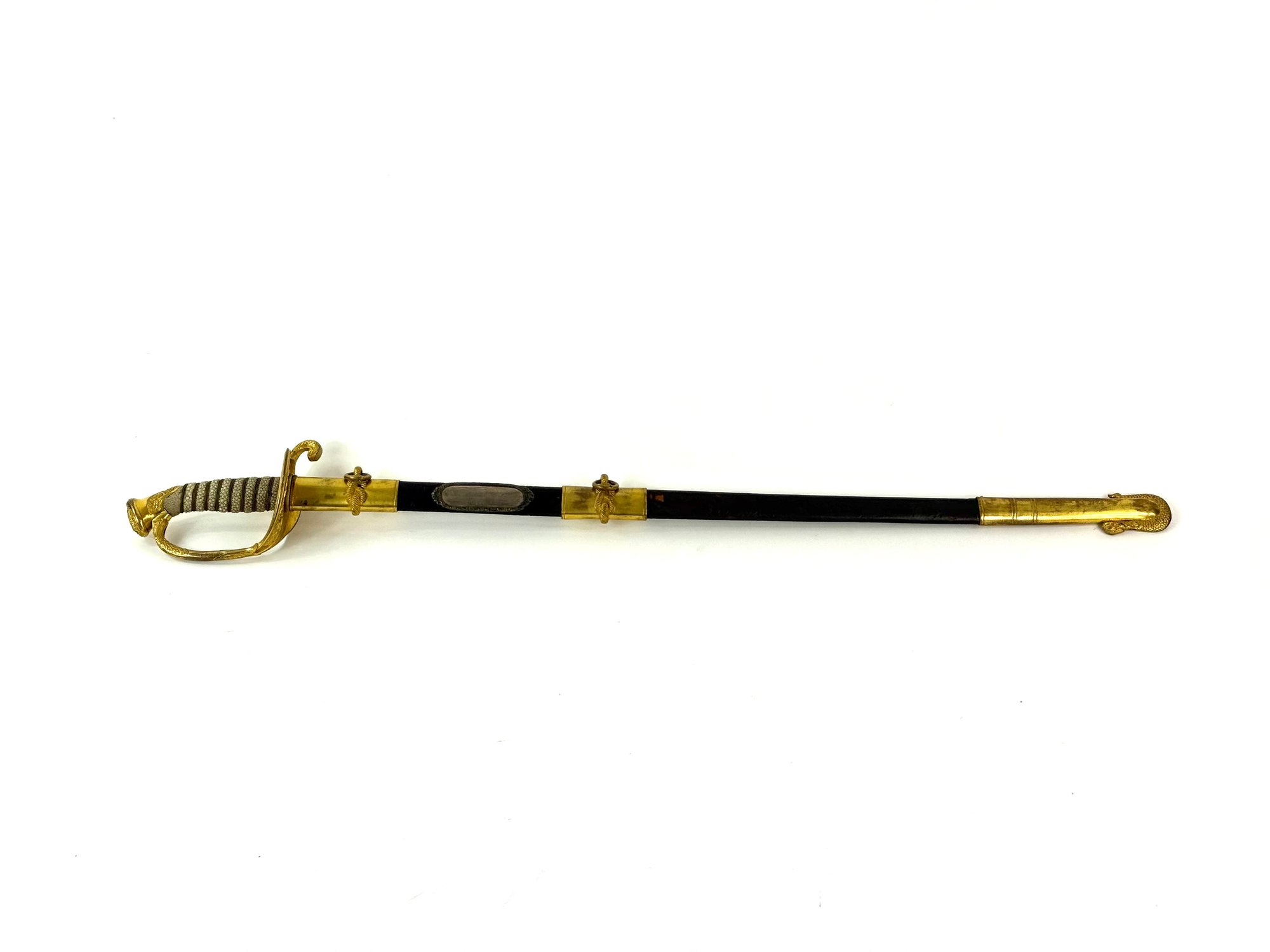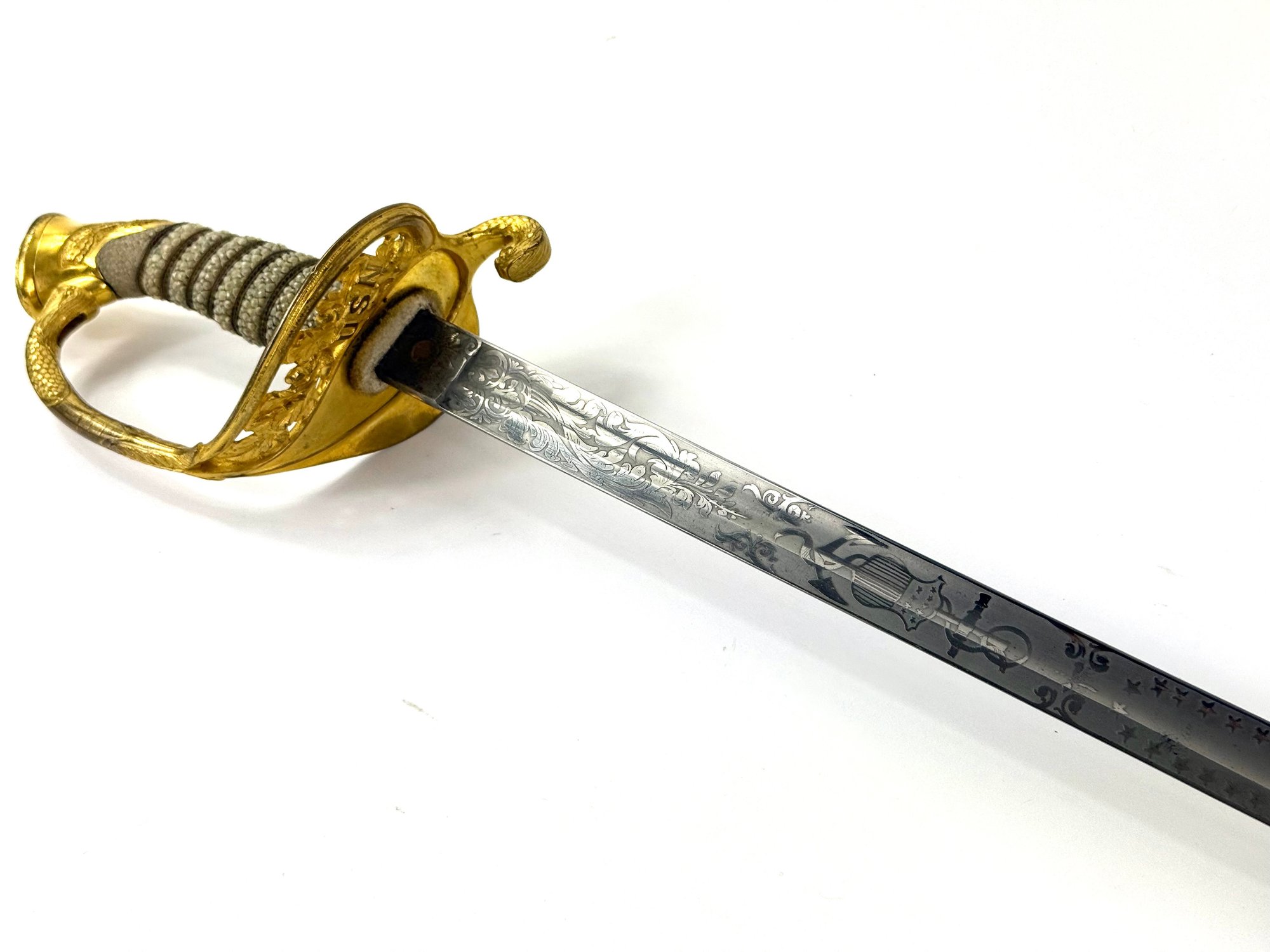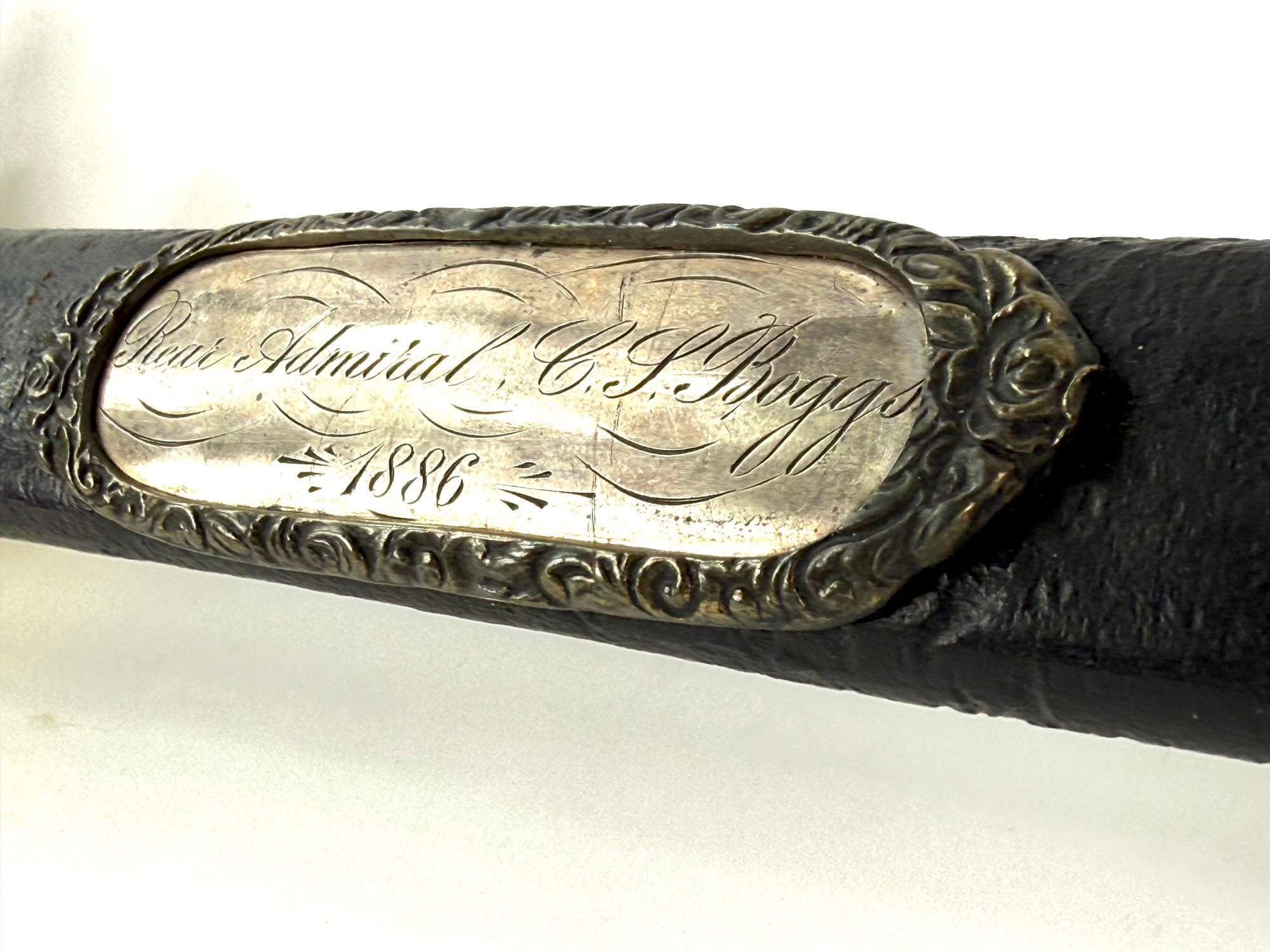 This 19th century sword is in very good condition made by Joseph Starkey of Conduit Street, London. It holds the plaque of rear admiral C.S Boggs who was appointed in 1926 the Boston Navy Yard and was involved with the Mexican war and Civil War. The sword itself has wonderful engravings with USN and an American shield. The serpent tip sheath and handle are impressive for it age. It comes with two photographs and information about the Admiral. Please see photos.