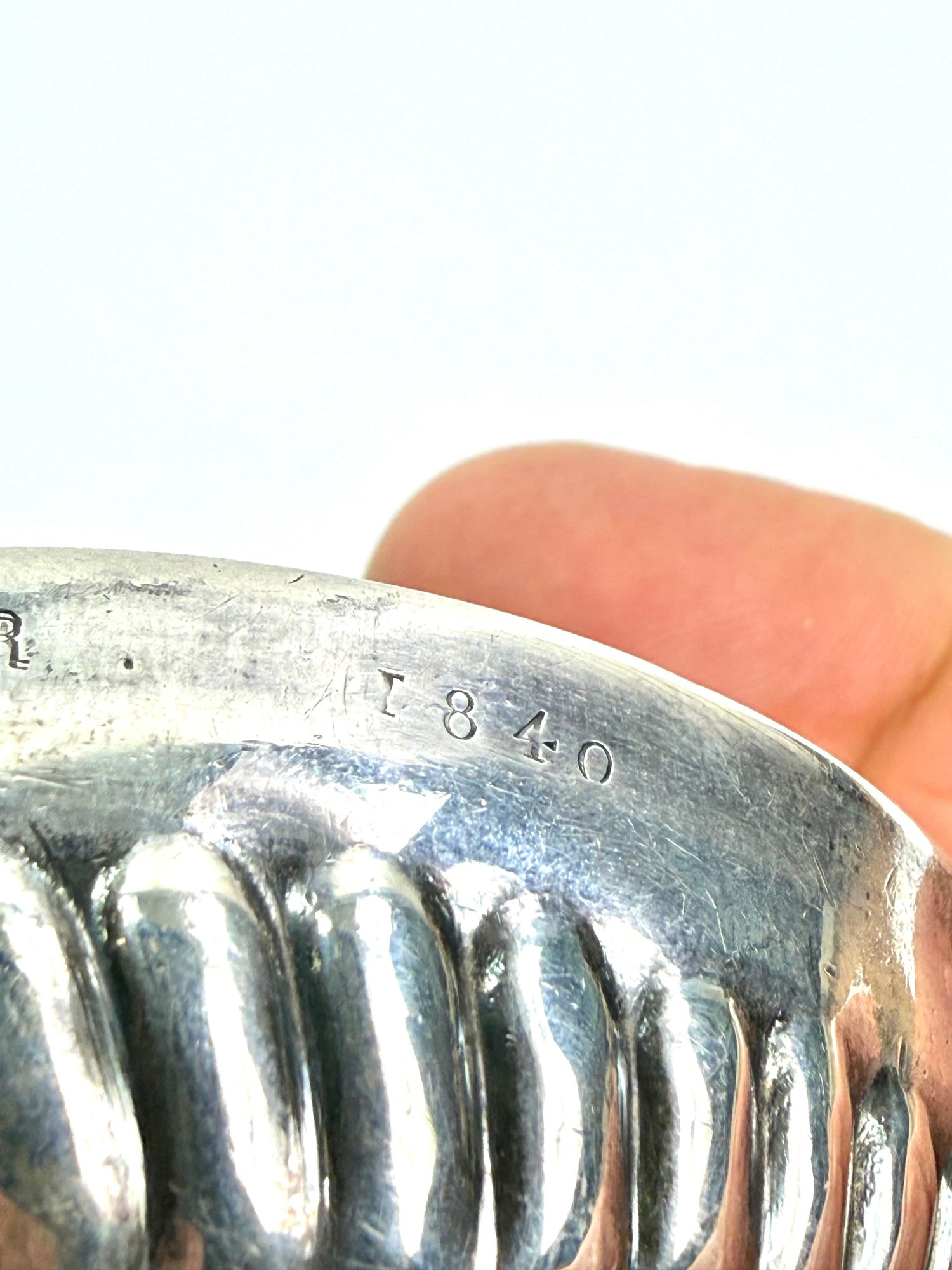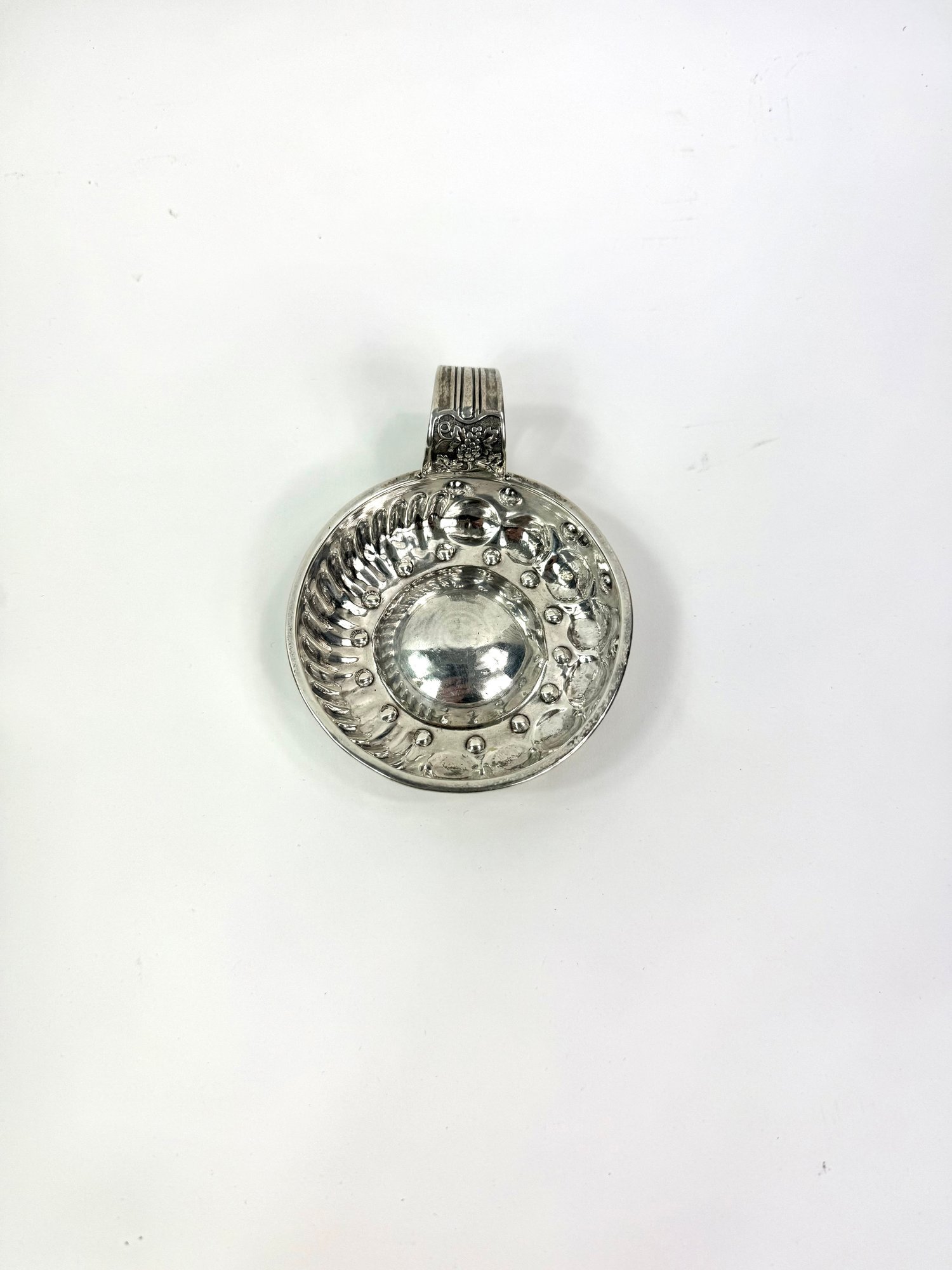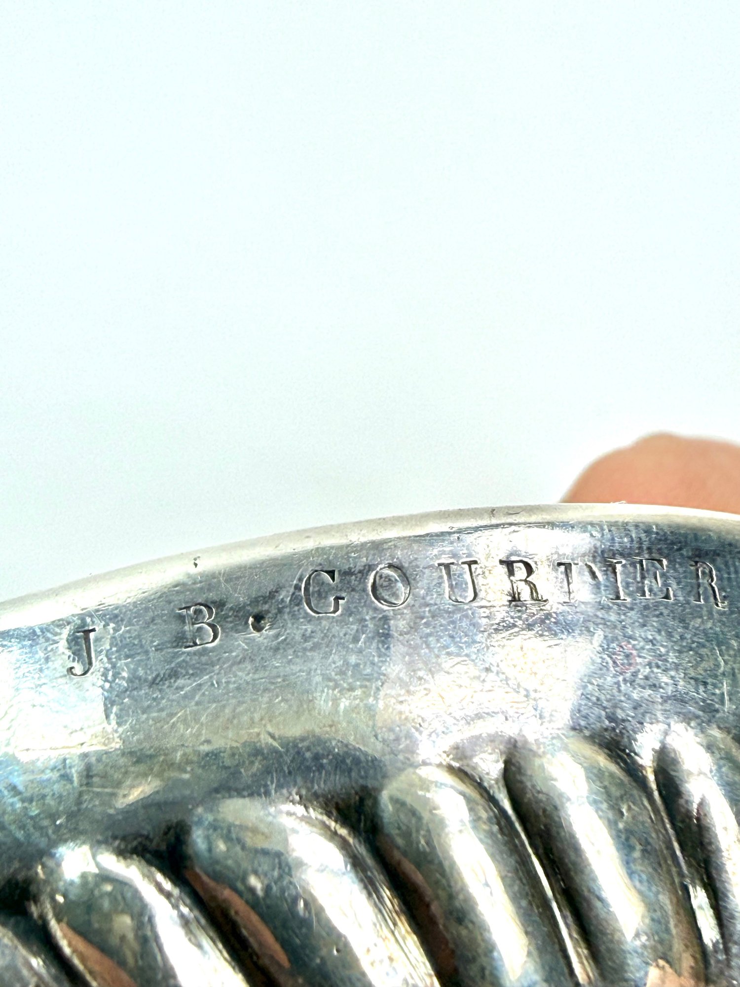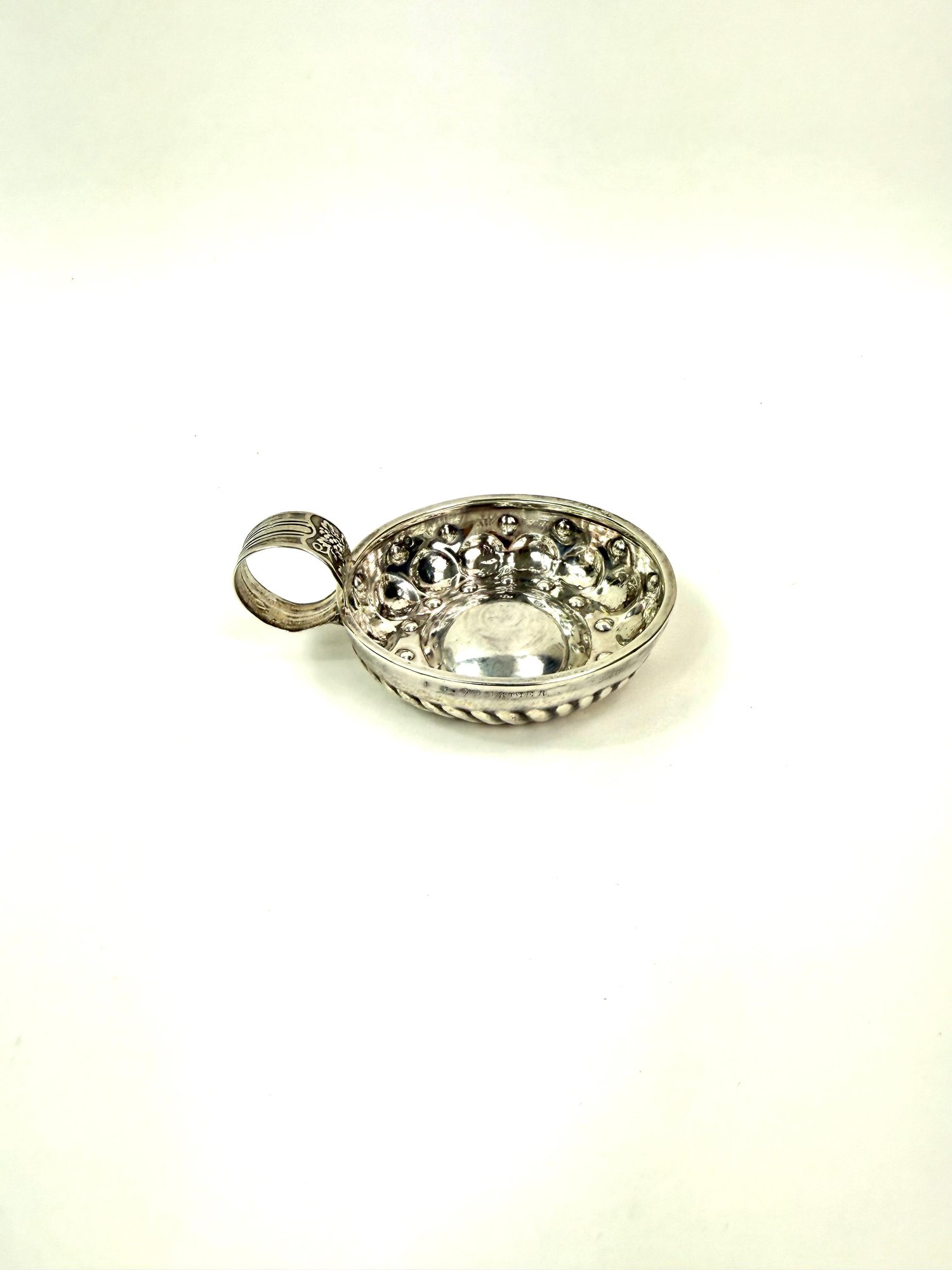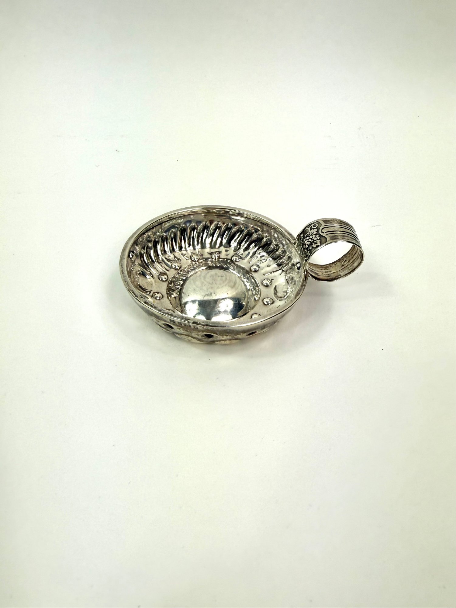 Tested sterling silver and stamped. This French vineyard wine tasting cup has a grape motif on handle with the word MELIN. J B .COURMER 1840 on the side.