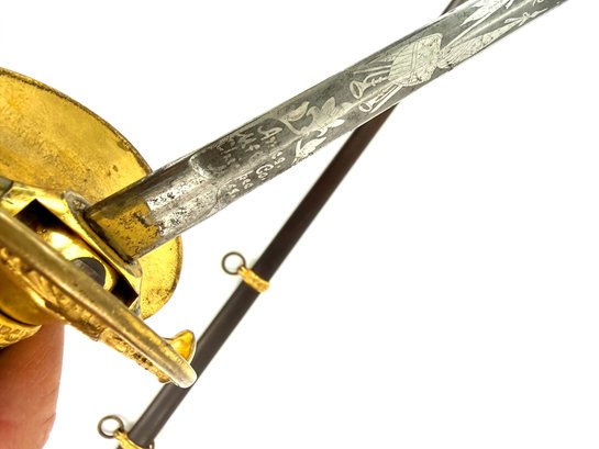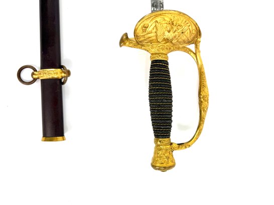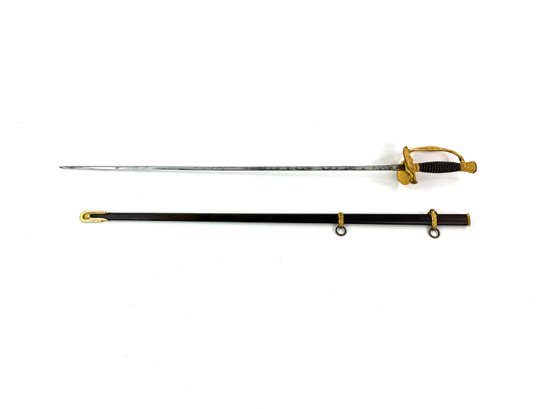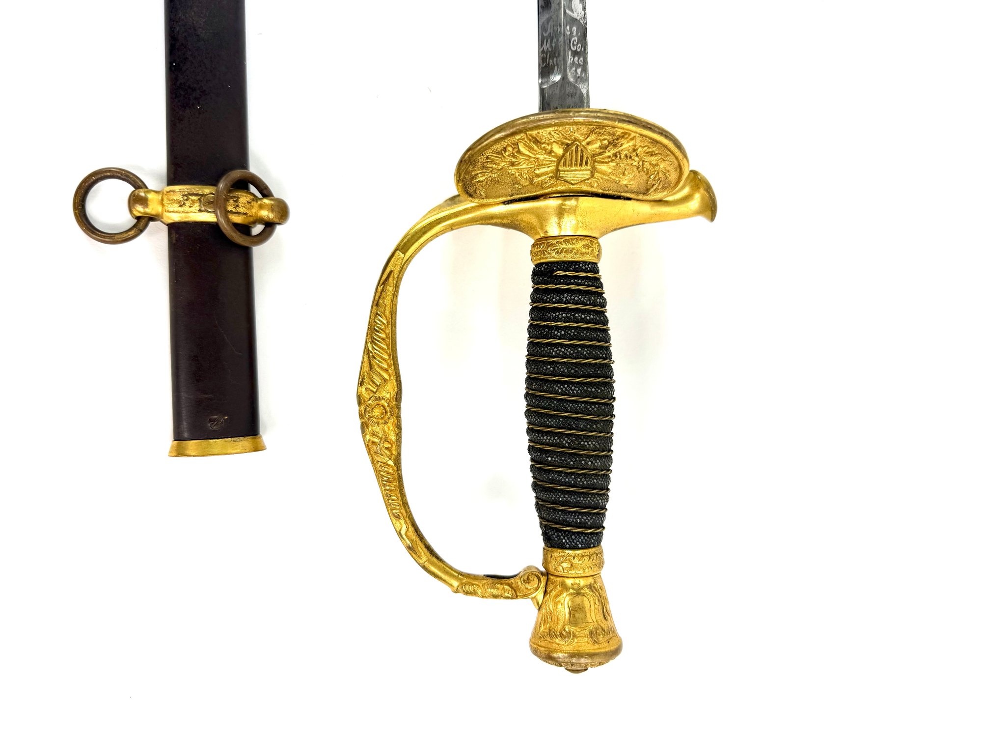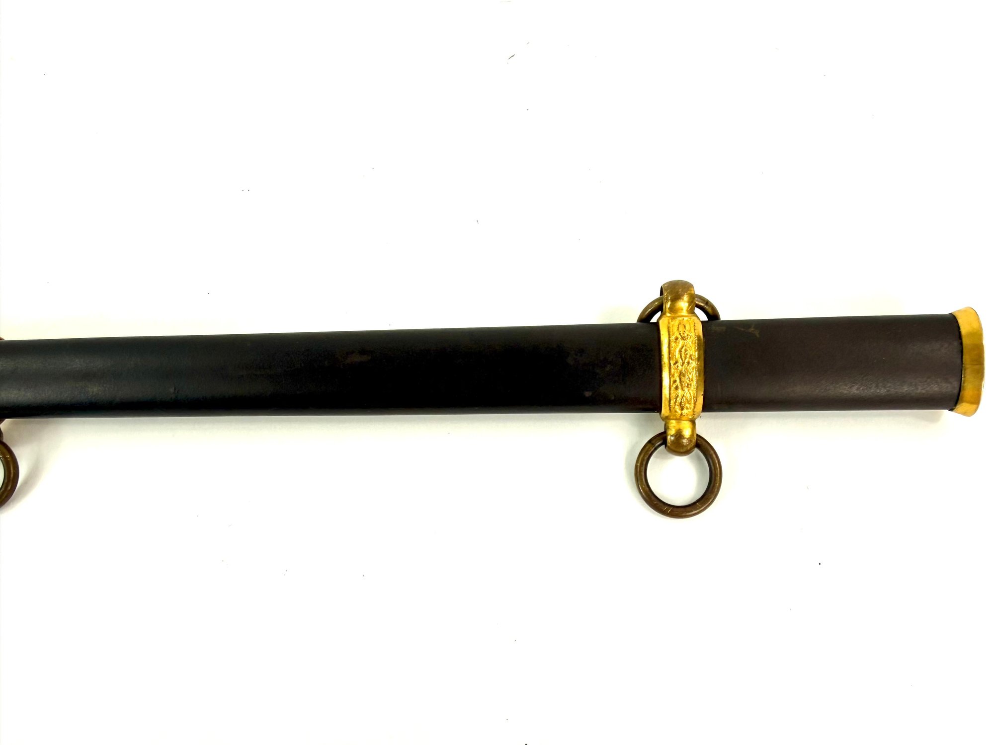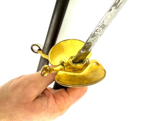 This Civil War era sword is in excellent condition with its black sheath and matching dark handle grip it depicts the eagle and shield of arms. Made by the Ames company Chicopee, Massachusetts.