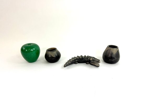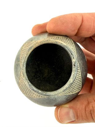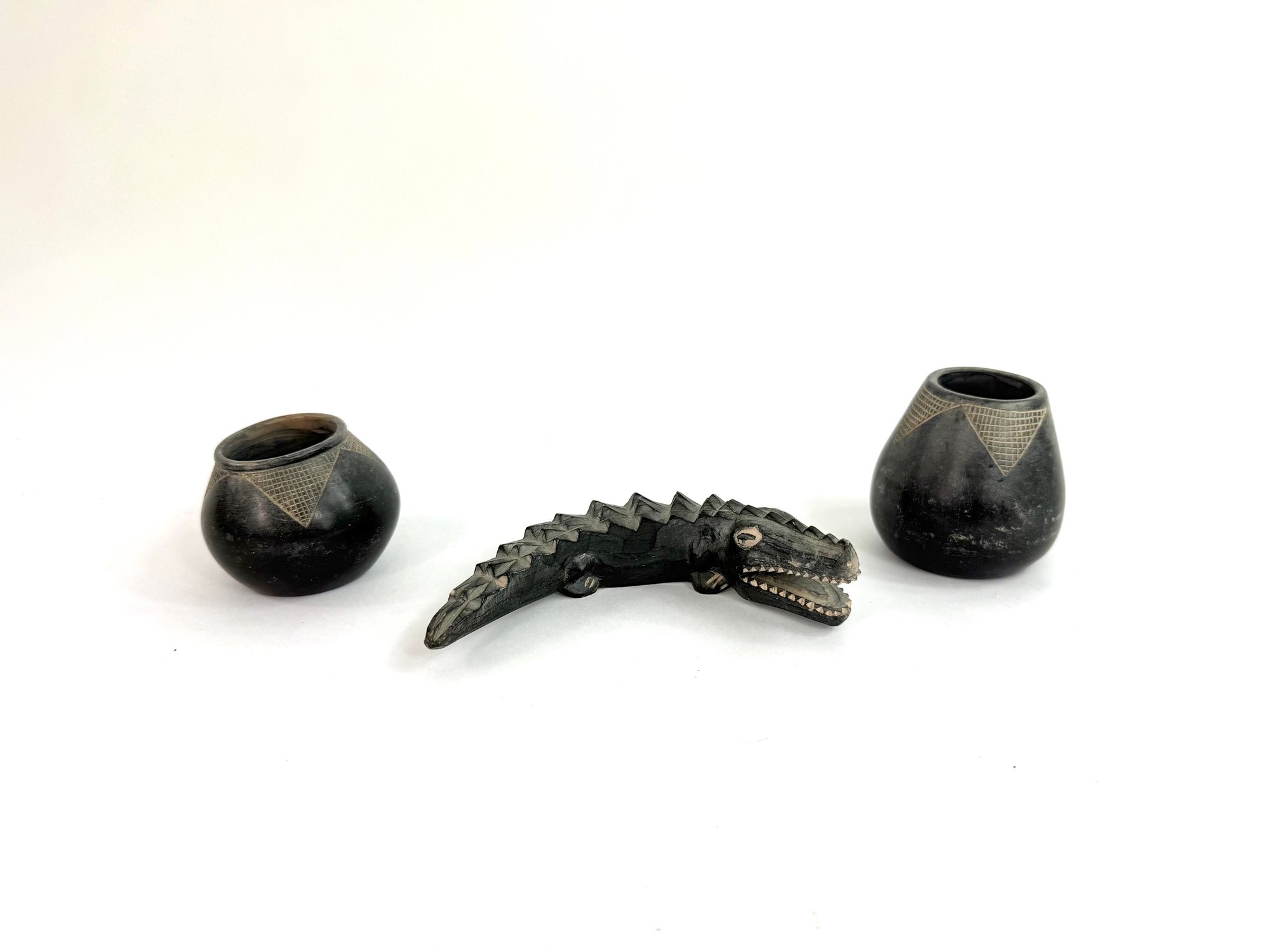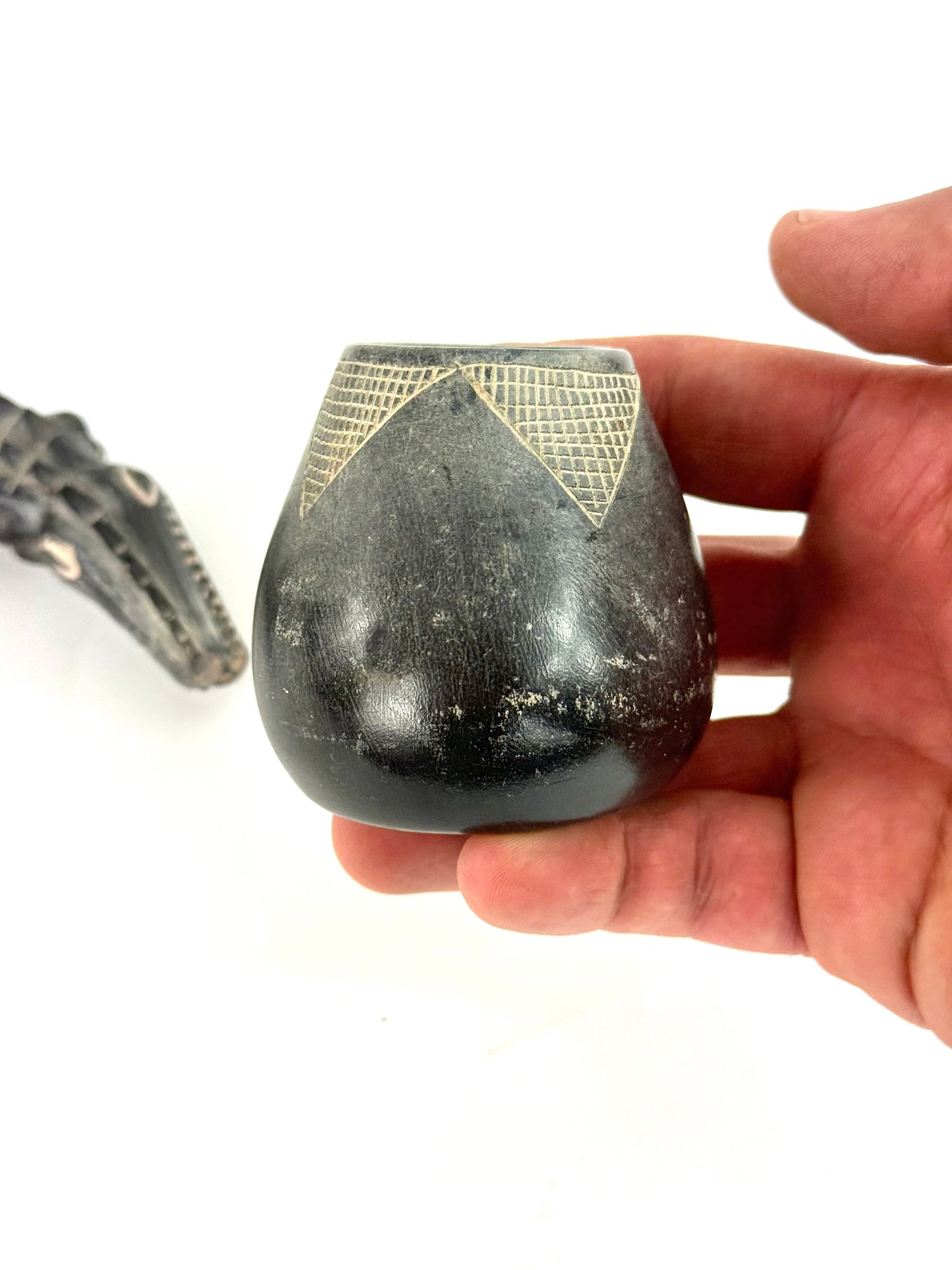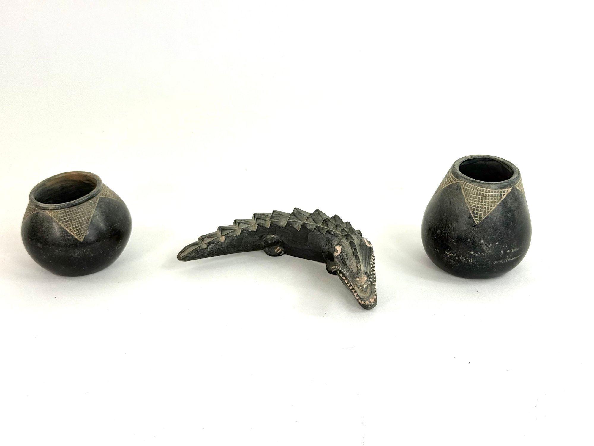 This lot contains two small bowls with grid like patterns and carved reptile. Please see photos for size and condition.