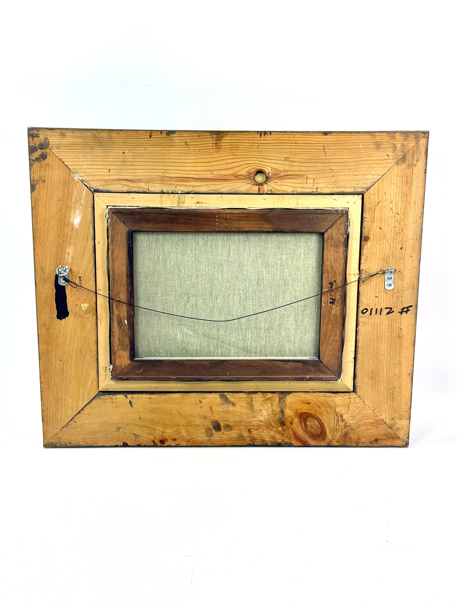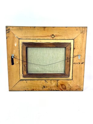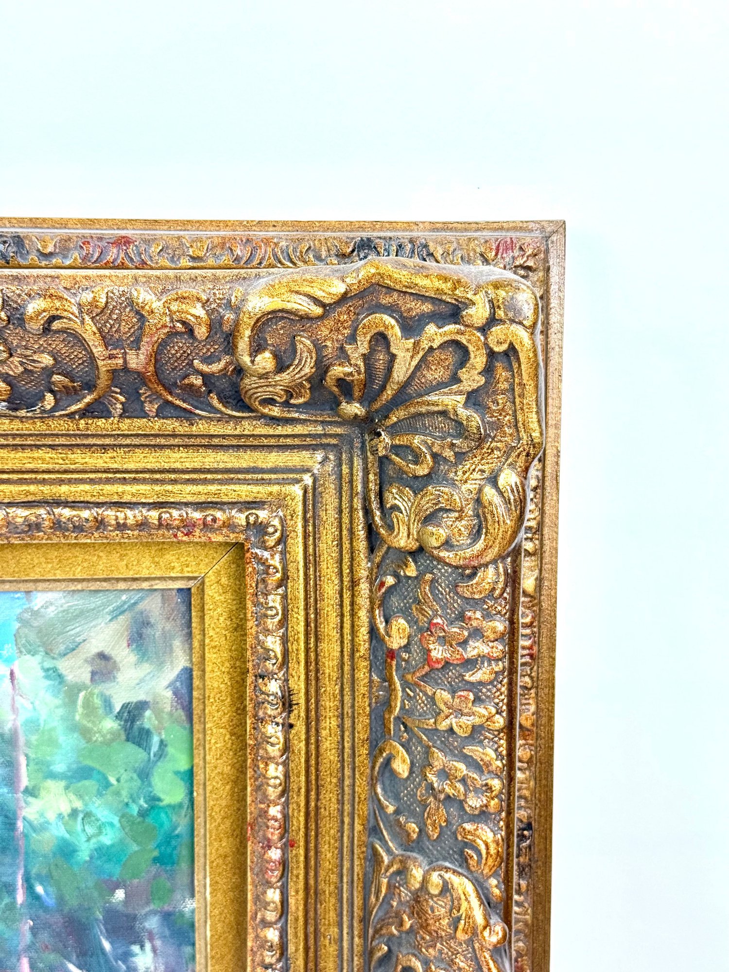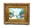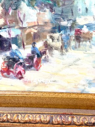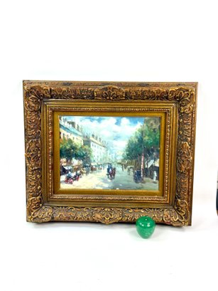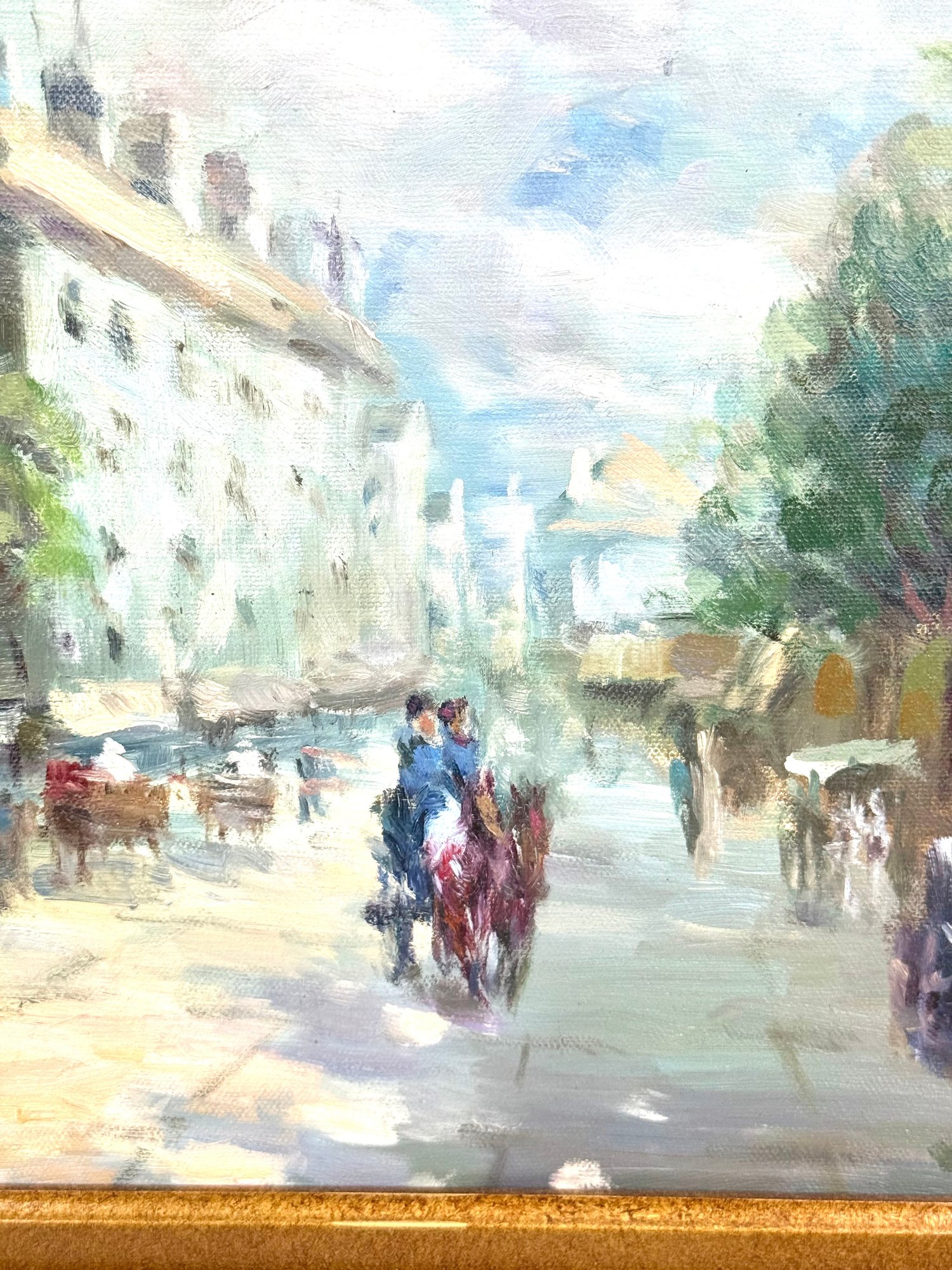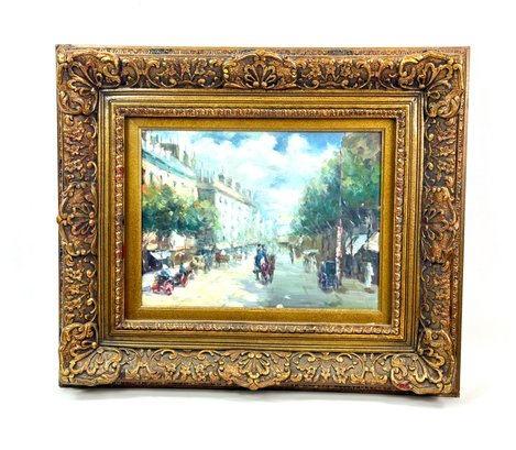 European street scene of horses and wagons. It is well executed and sits in a gold color contemporary frame..