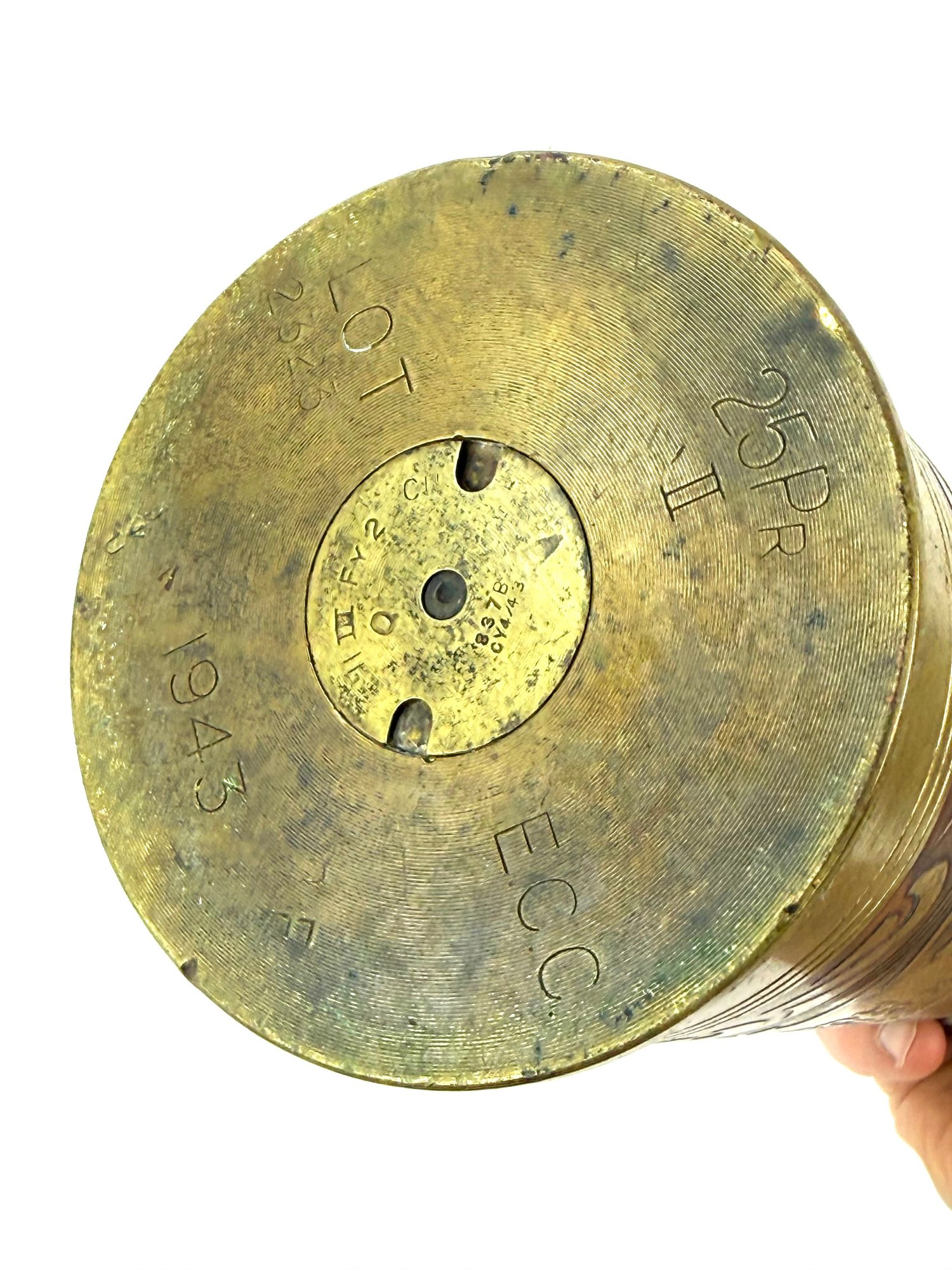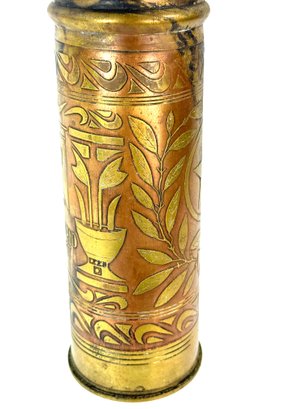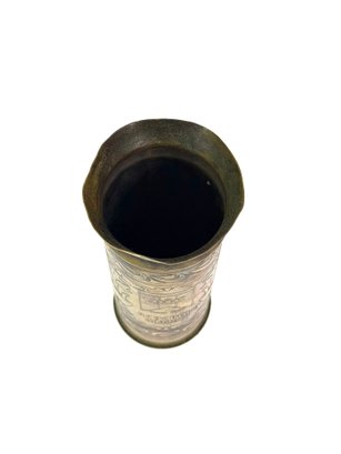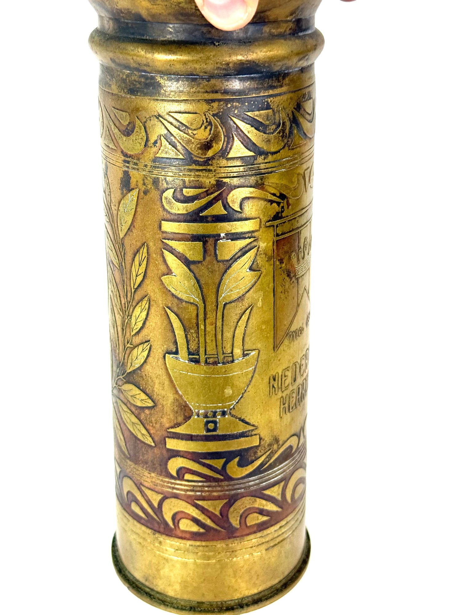 This trench art shell is highly decorative with a large star and trees. Dated 1945 underneath it reads Nederland Harruet