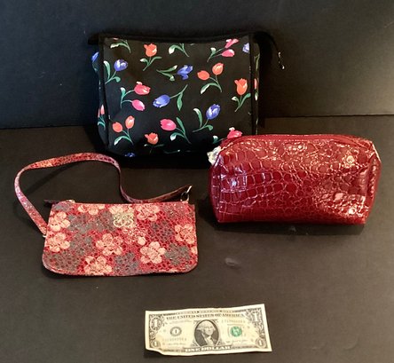 * a patent leather make up pouch in red alligator pattern, never used measures 8” x 5”