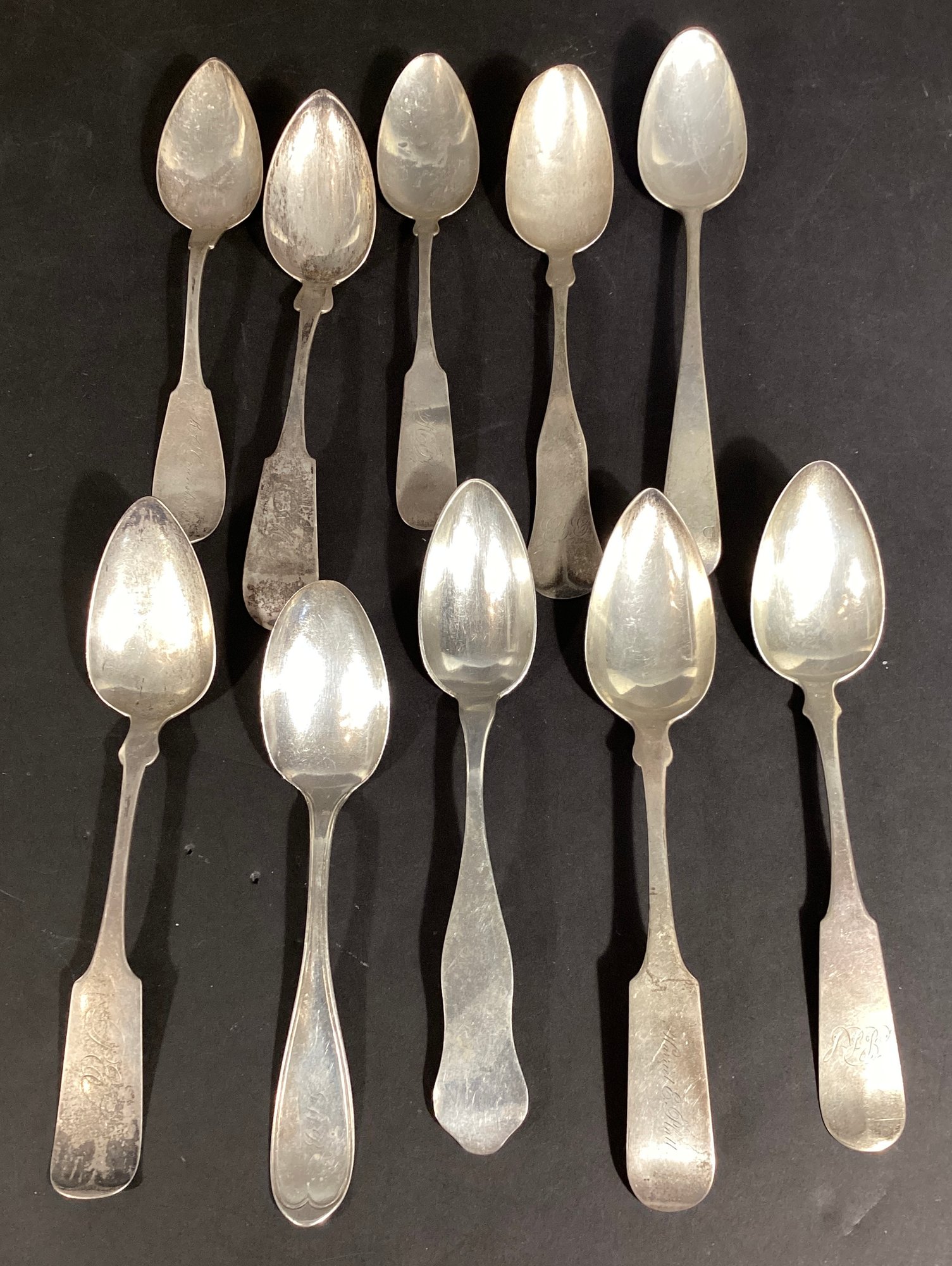The spoons are in good antique condition, and several spoons bear monograms, however most are very light from age and use.