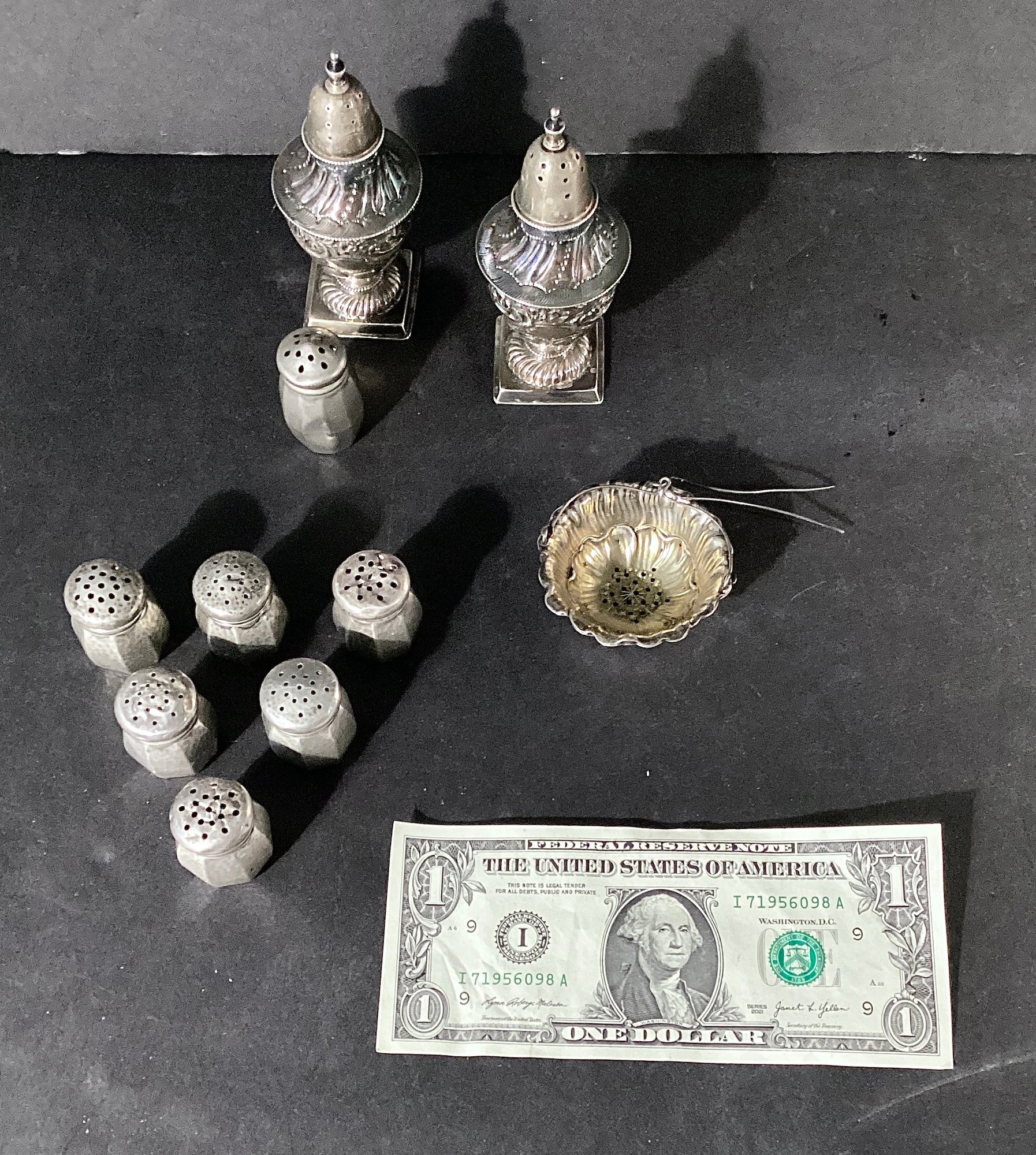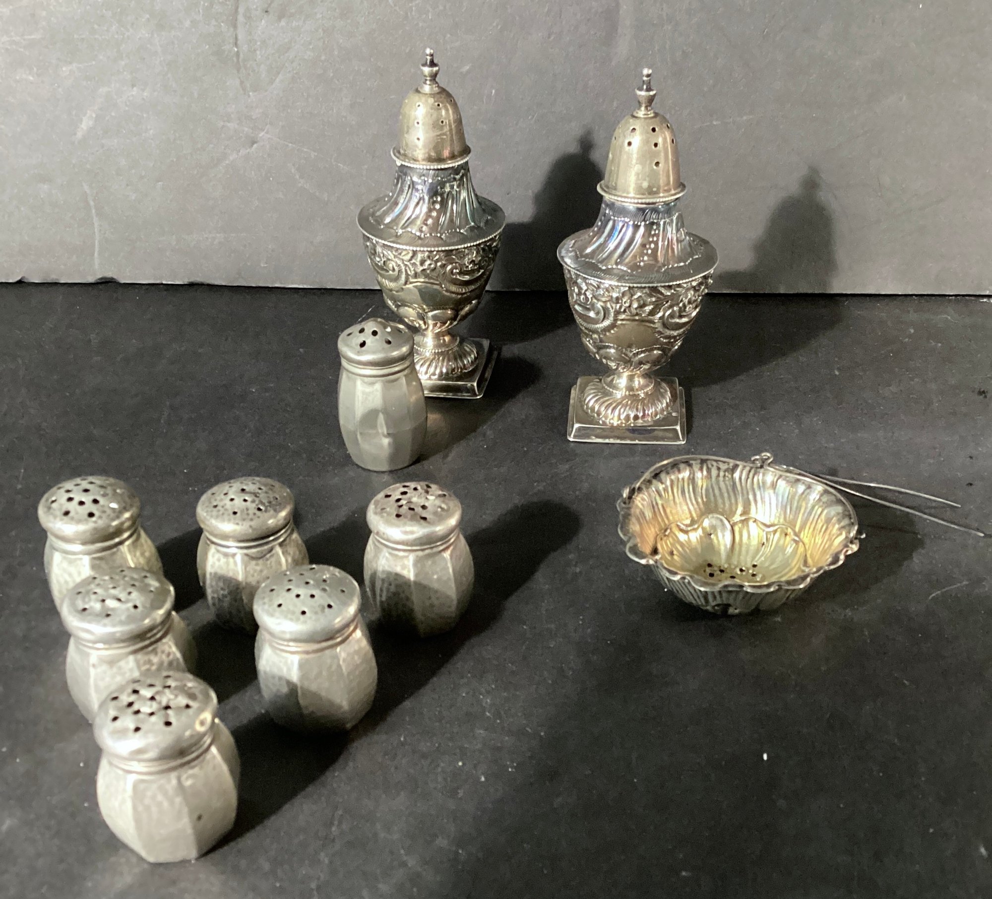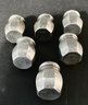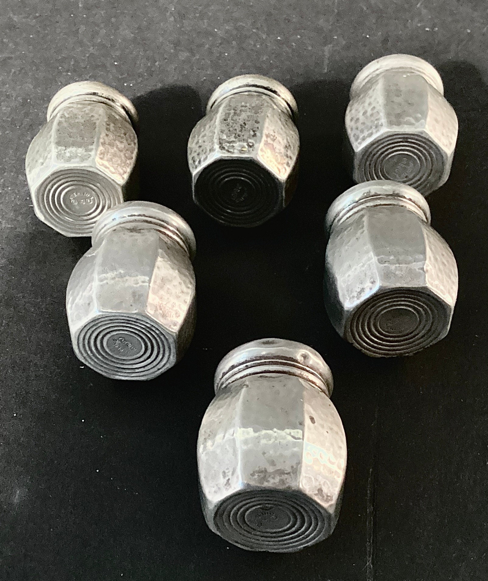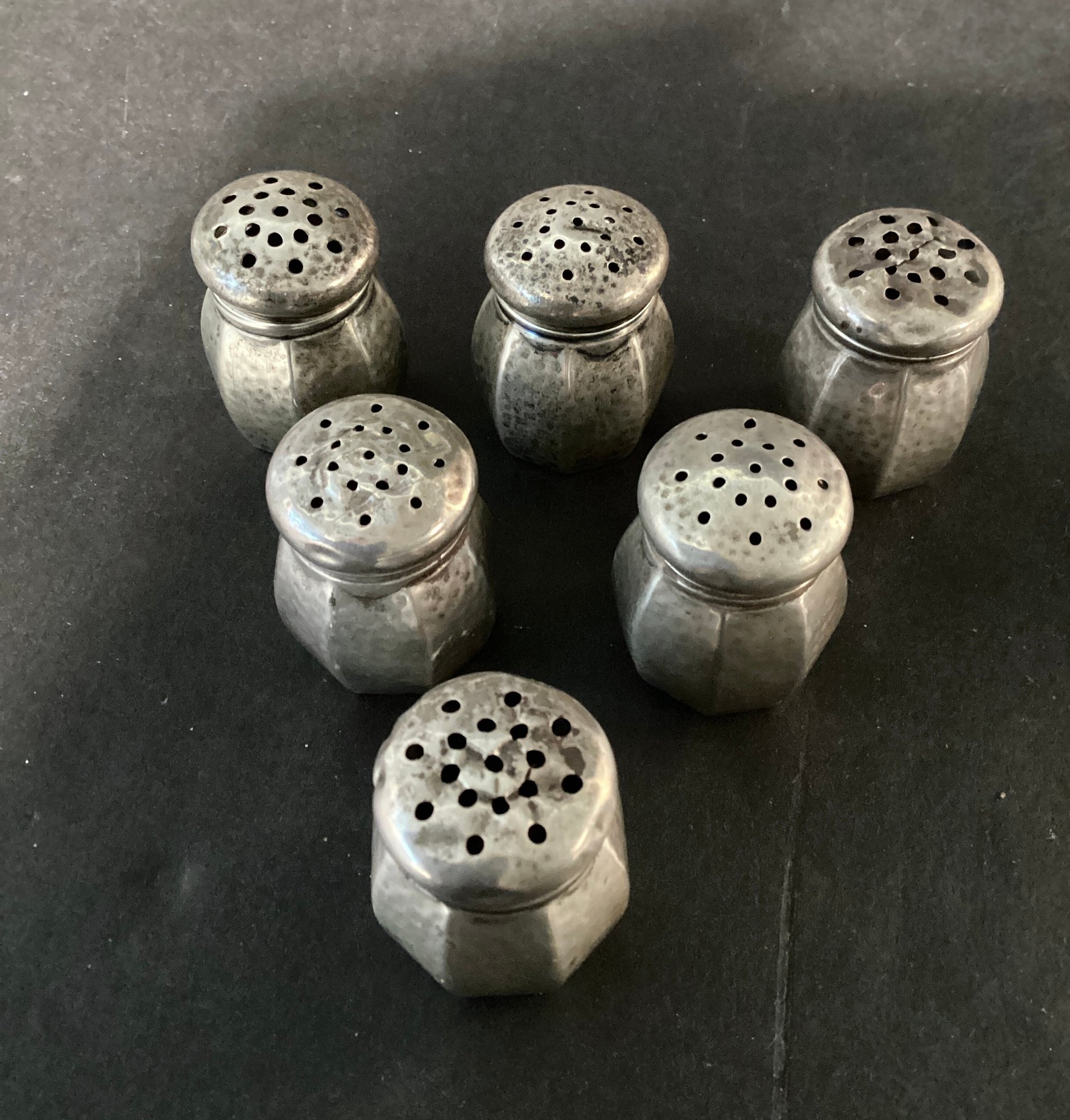 * 6 small sterling salt shakers with a hammered silver body, and screw tops. These measure approximately 1.25” in height.