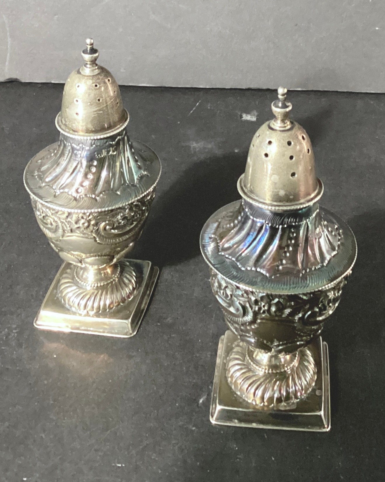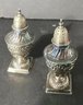 * 2 ornate sterling salt & pepper shakers. Each has a square pedestal base and a done top ornate design for the body. These measure approximately 4.5” in height.