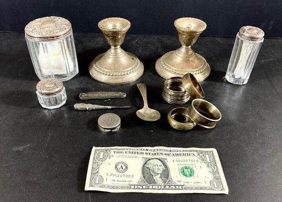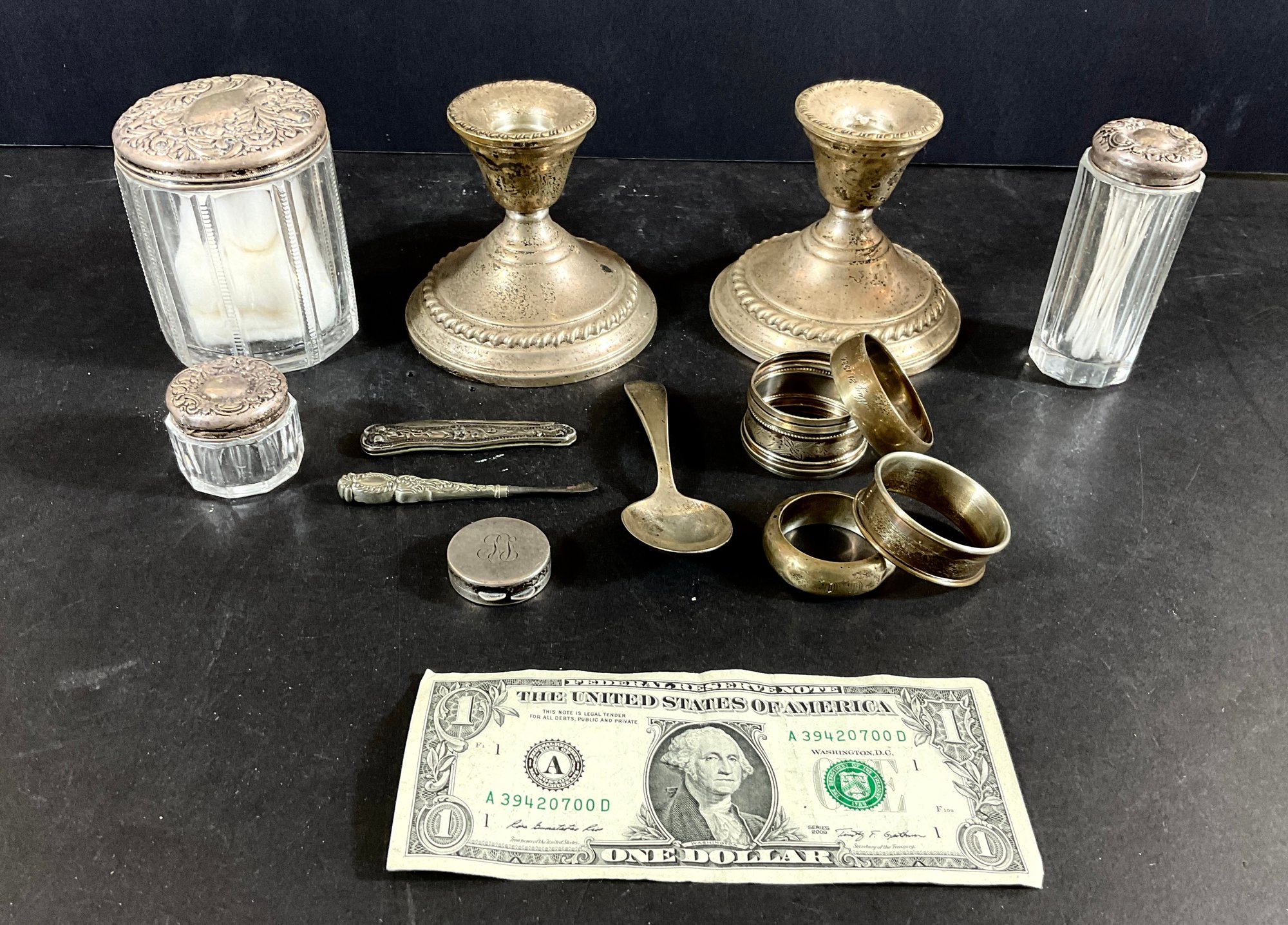 This is an interesting lot of antique sterling dresser items. Napkin rings, candlesticks, an antique Victorian, ladies, fruit knife, a pill case and a baby spoon. All the items are in good condition to use all need a little polishing. All of them are marked Sterling.