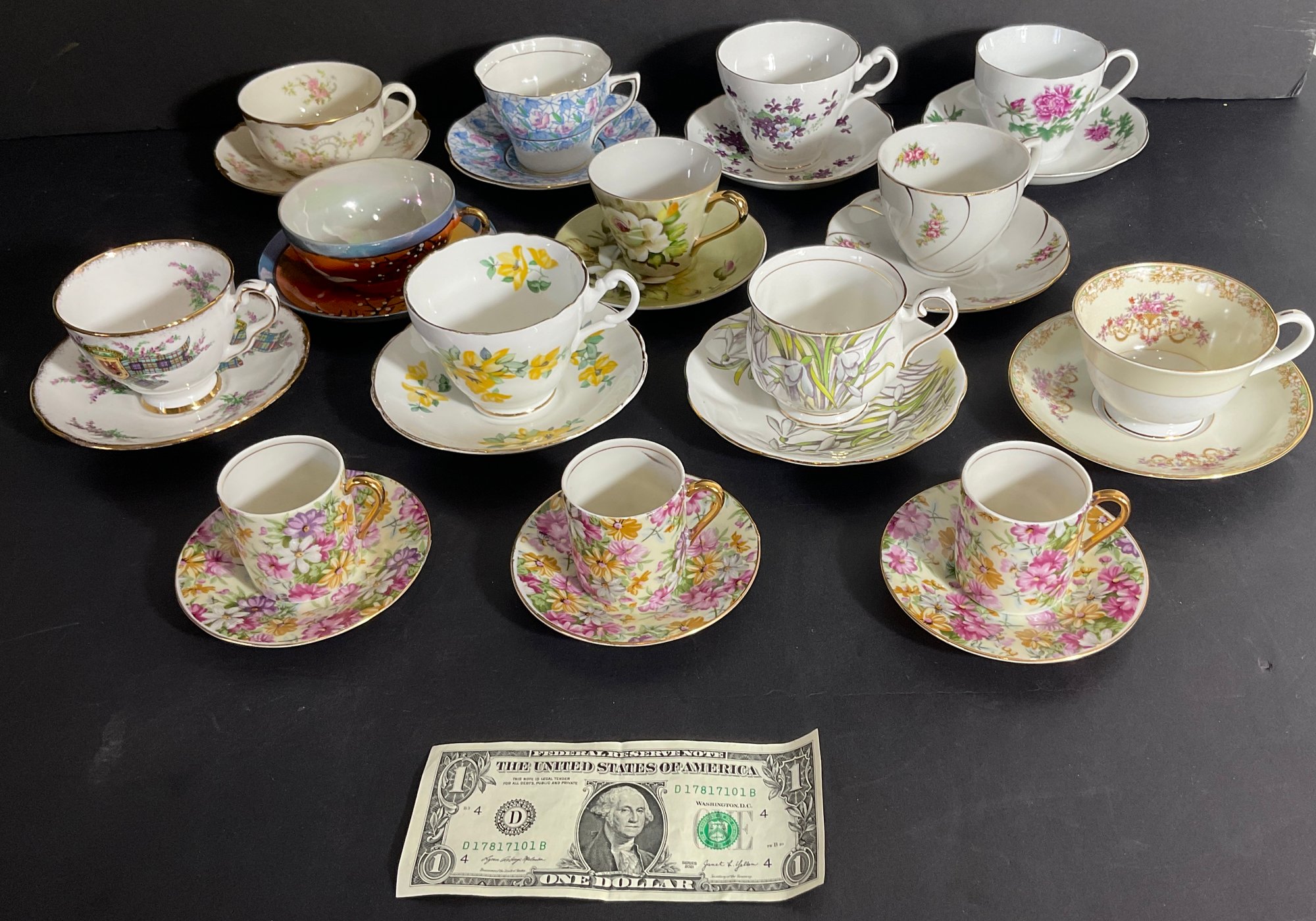 Each cup is in great condition, and are in a variety of colors and shapes. The cups include such names as ‘Wescott’, ‘Noritake’, ‘Marlborough’ ‘Royal Doulton’,and others.