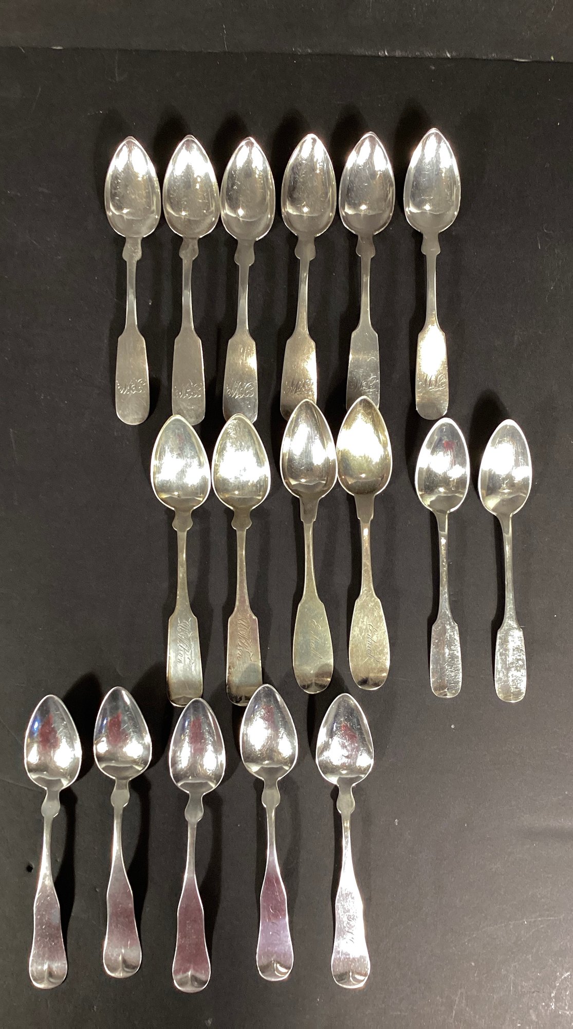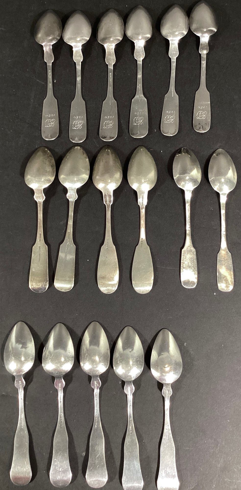 Here we have 17 antique coin silver dessert spoons for your collection.