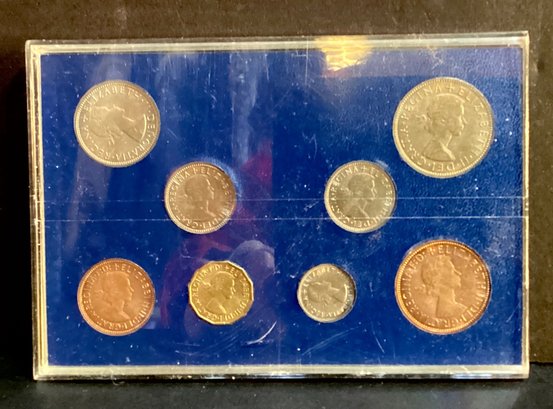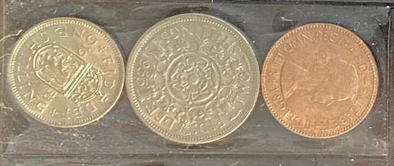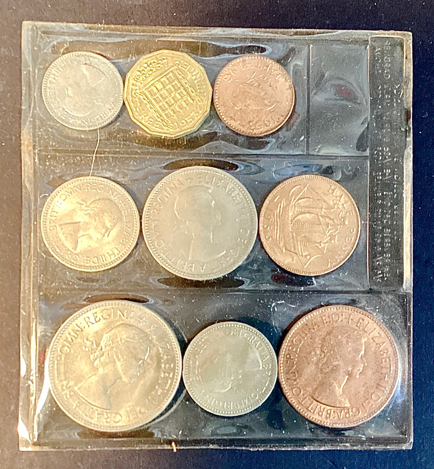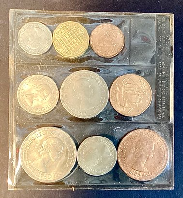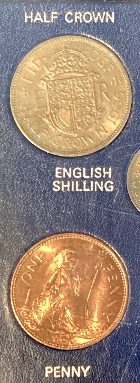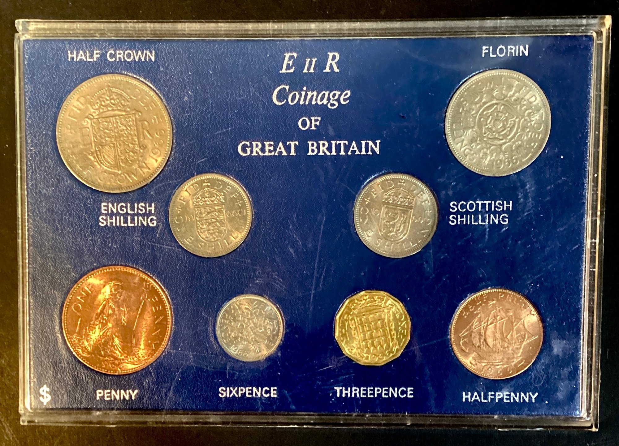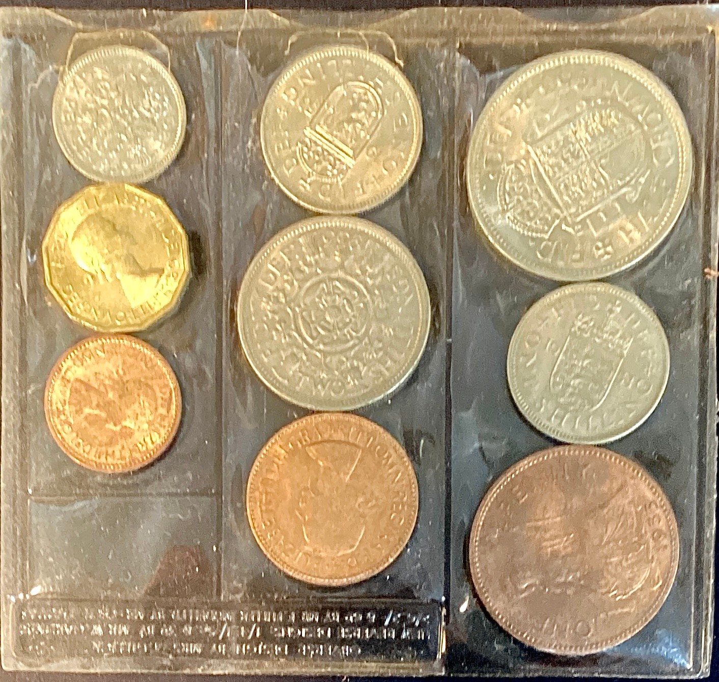* 8 coins including: a shilling, half crown, penny, sixpence, three pence, half-penny, a Scottish shilling, and a florin. Coins from 1966.