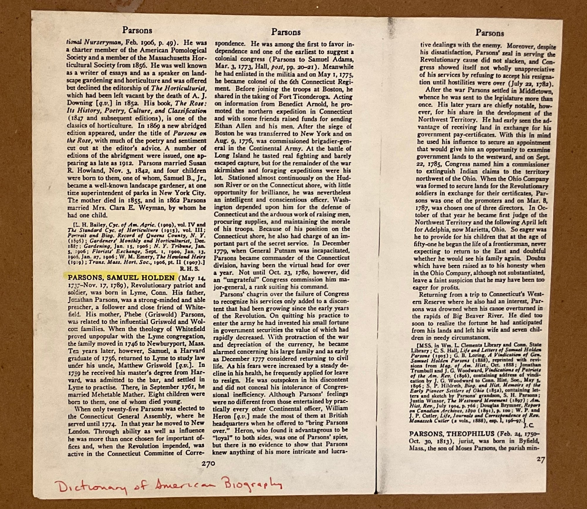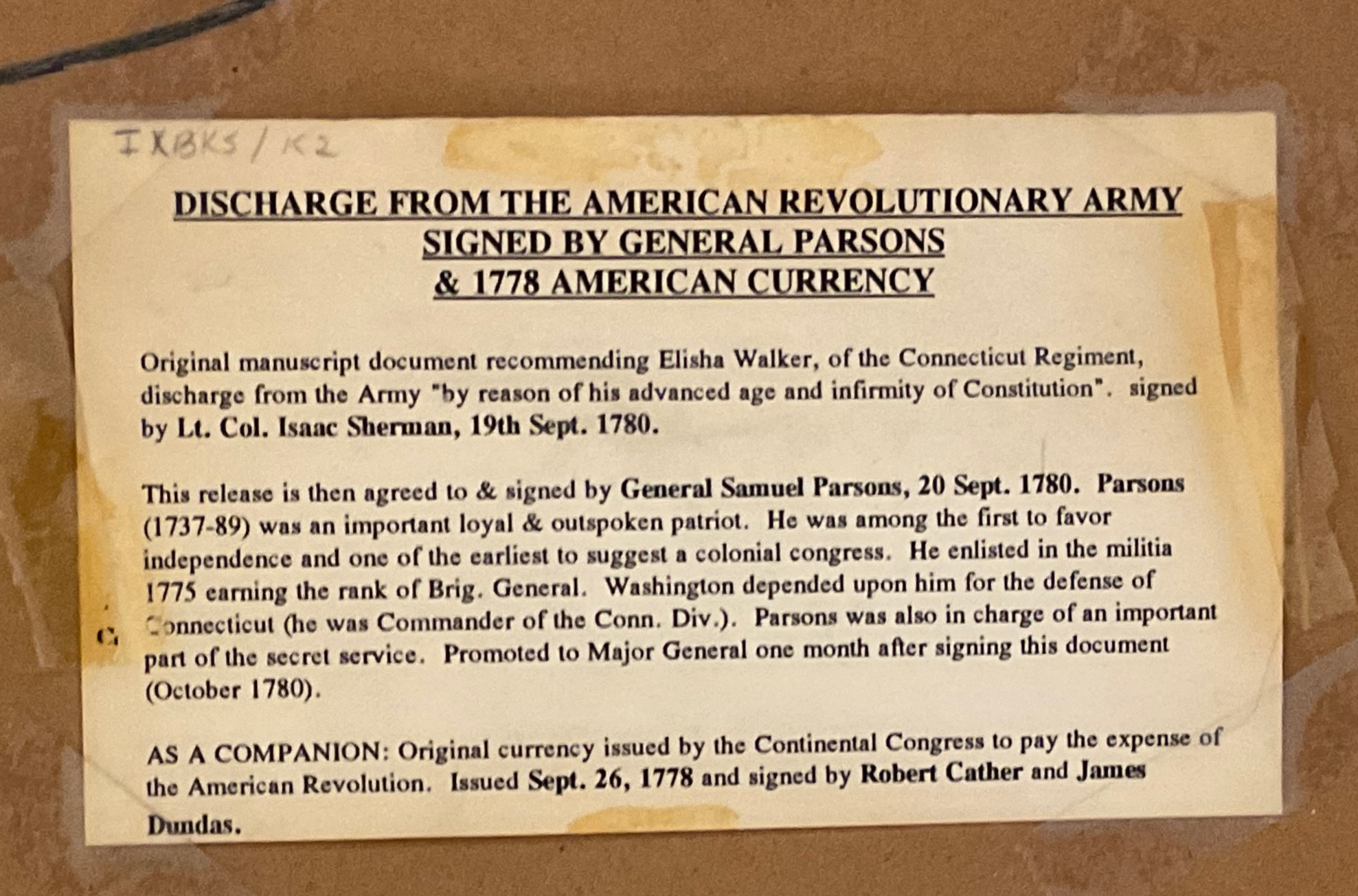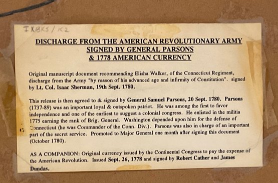 by Lt. Col. Isaac Sherman, 19th Sept. 1780. This release is then agreed to & signed by General Samuel Parsons, 20 Sept. 1780. Parsons (1737-89) was an important loyal & outspoken patriot. He was among the first to favor independence and one of the earliest to suggest a colonial congress. He enlisted in the militia 1775 earning the rank of Brig. General. Washington depended upon him for the defense of Connecticut (he was Commander of the Conn. Div.). Parsons was also in charge of an important part of the secret service. Promoted to Major General one month after signing this document