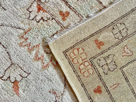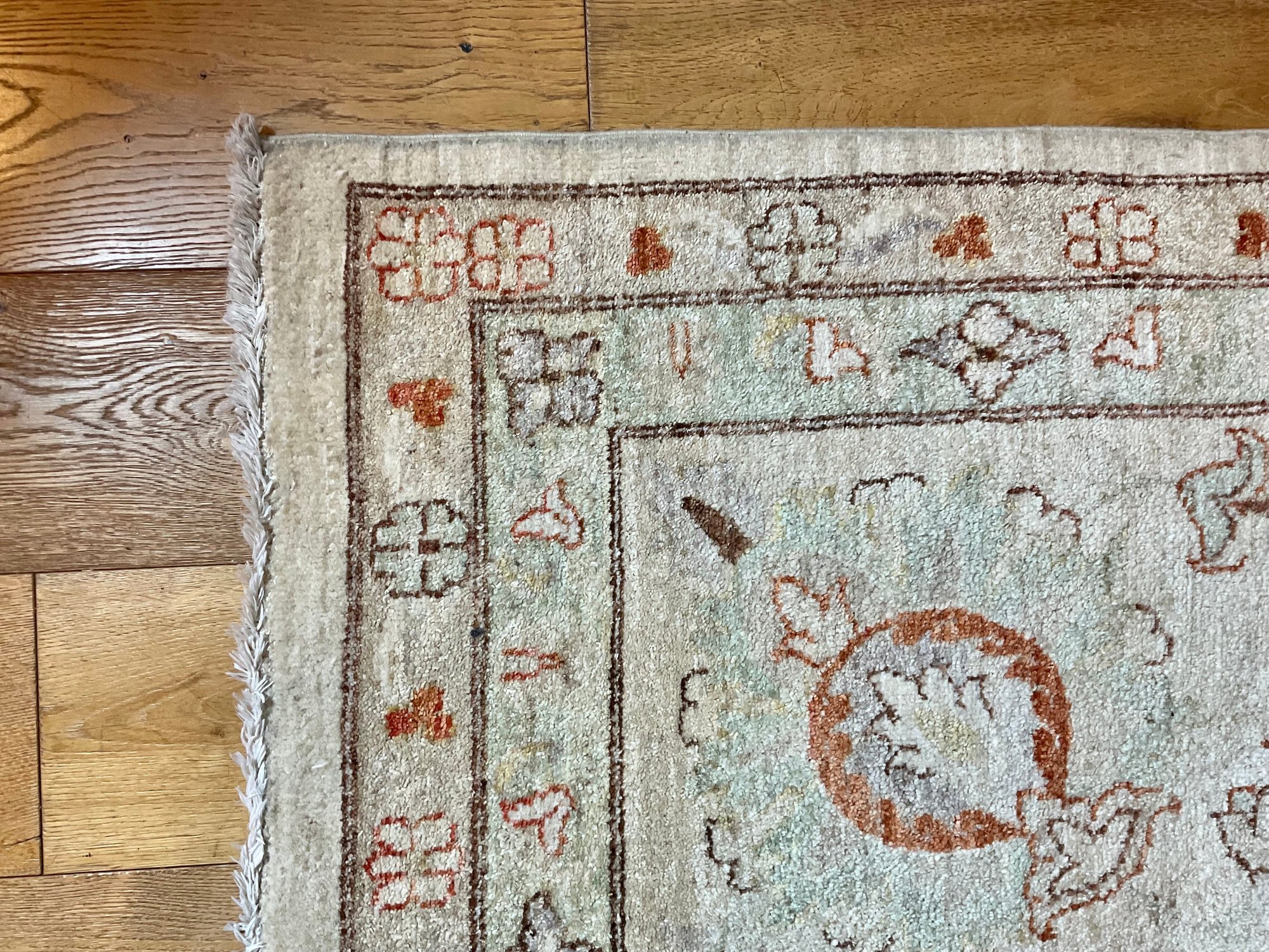 A classic design and wonderful quality in this semi-antique hand made wool carpet.a very subtle color pallet and classic design bring life to any room without dictating the decor. Compatible with contemporary to antique themes. Rich thick wool pile in very good condition.
