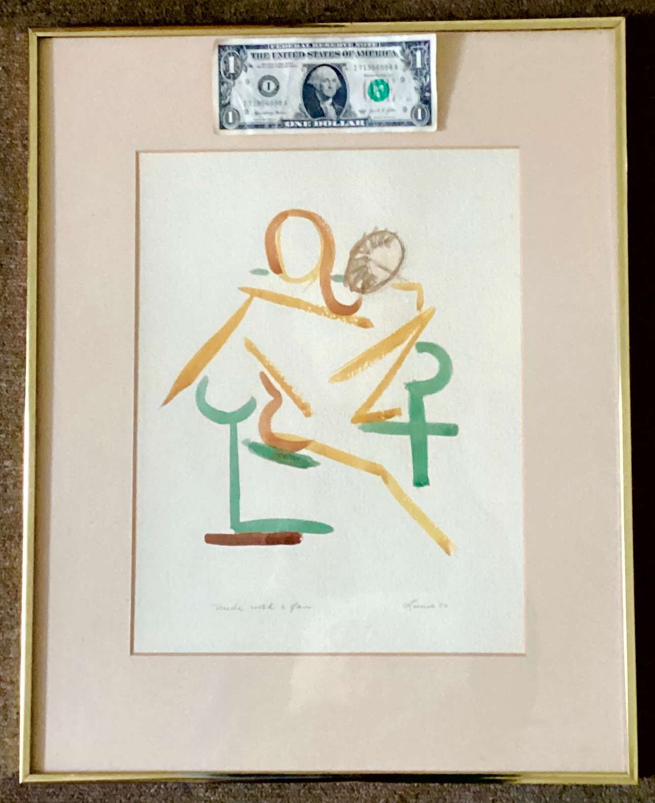 Here is a matted and framed water color titled ‘Nude with a Fan’ with the