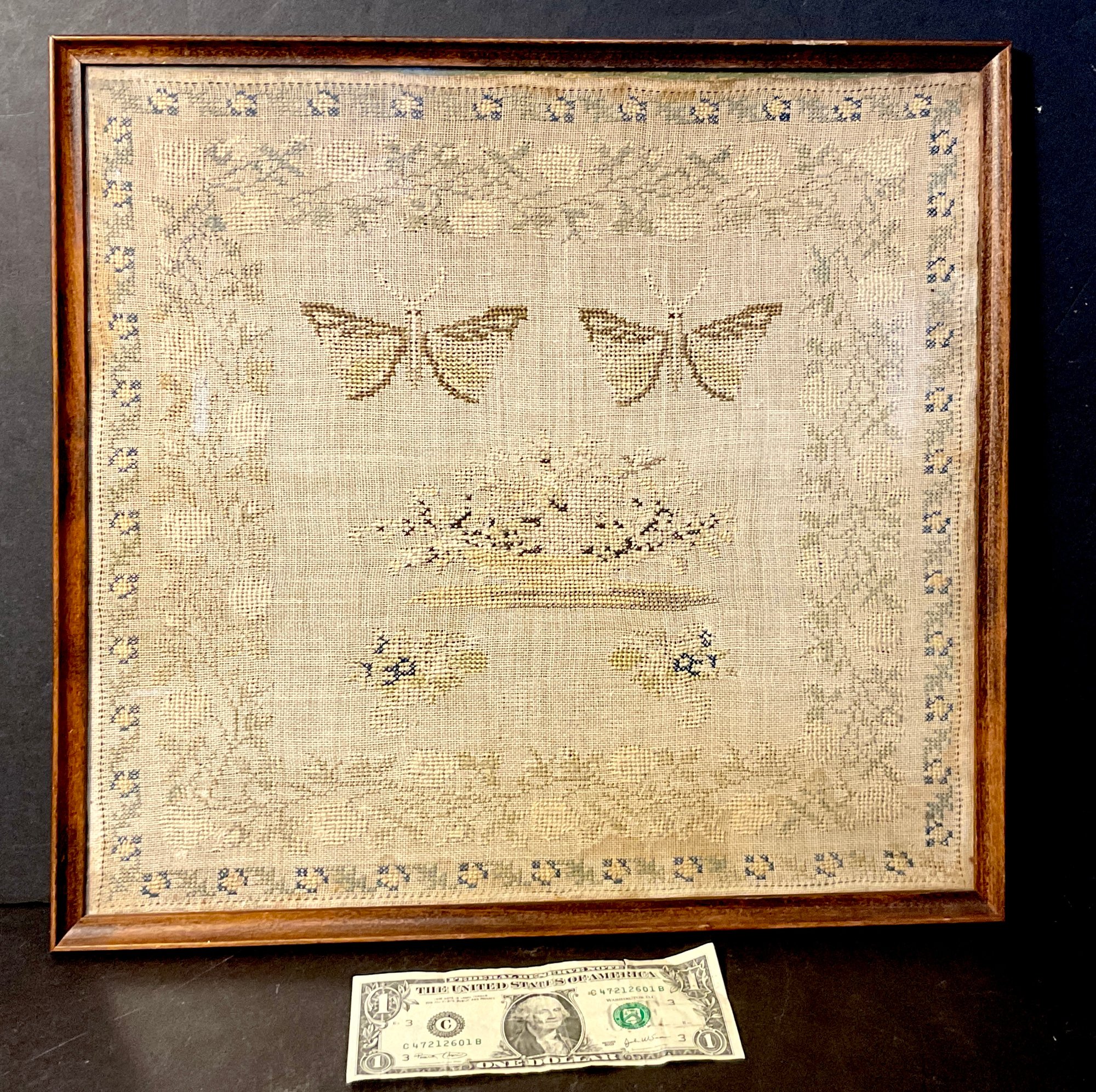 we have a very unusual sampler with butterflies and lots of flowers. A very nice green and blue border surround this 19th century schoolgirl sampler.