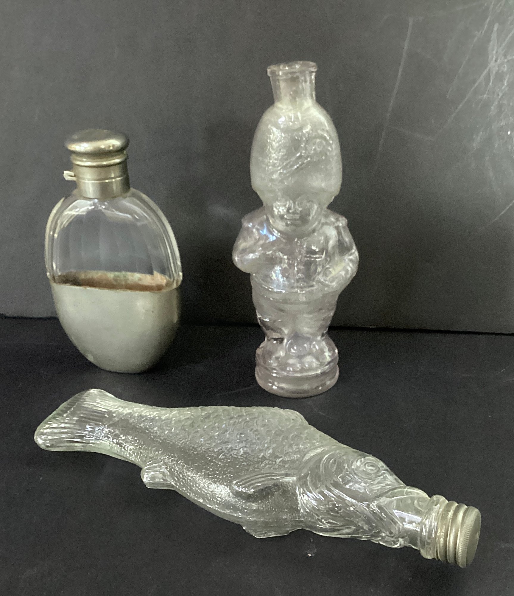 * An antique pressed glass fish shaped bottle. This clear glass bottle shows its craftsmanship (see base of the bottle to view finishing process of the glass) this also cones with the metal screw cap, which is most unusual fr its age. The fish measures approximately 9.00” in length x 4.00” at its widest.