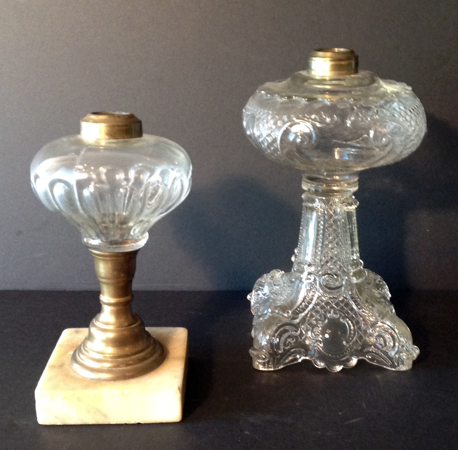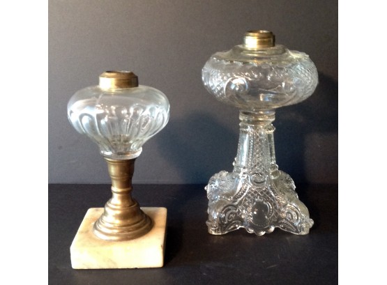 Two very nice vintage oil lamps with pressed blown in the mold glass features. The first lamp is pressed glass with a brass lip. The second oil lamp is also pressed glass with brass fittings and a square marble base circa 1850’s