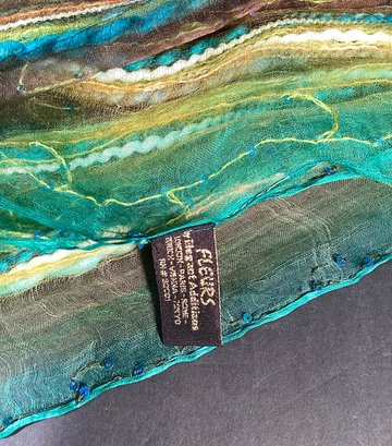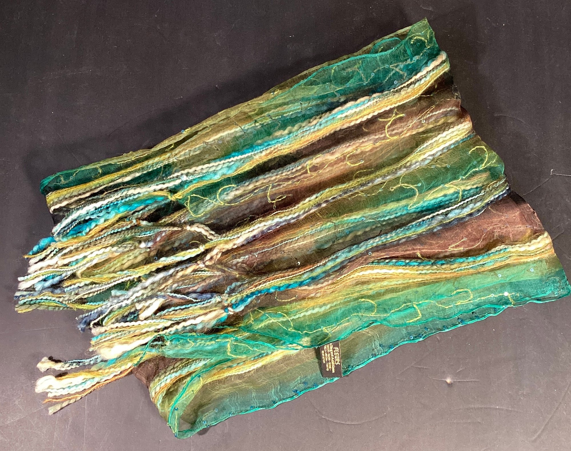 * the first scarf is created by ‘Fluers’ and was created with loose weave teal silk with wool yarn interspersed and hand knotted there are also dainty teal sequins dotted throughout the scarf, and is approximately 56” (not including. Fringe).
